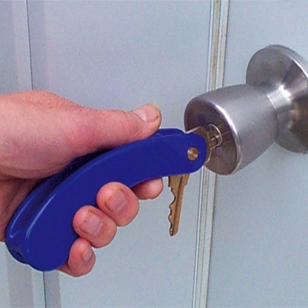 This Curved handle fits comfortably in the hand and allows for easy turning. The heavy-duty plastic handle of the 3-Key Turner provides extra leverage for easy turning. Ideal for persons with arthritis or a weak grip. The keys fold the keys into the handle when not in use.