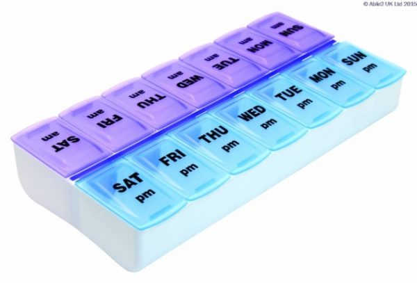 Securely hold pills and help to maintain an AM/PM medication regimen with this 7-Day pill container. Easily remove pills from The Weekly Twice-a-Day Pill Organizer. The contoured design and tabbed compartments open easily and securely snap shut. Contoured design for easy pill removal. The tabbed compartments open easily and securely snap shut. Bold AM/PM highlights. White base with colour combo lids