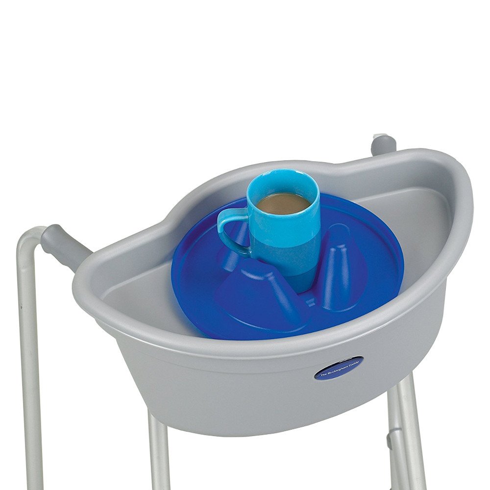 The caddy features multiple compartments, and the tray is designed to safely transport a plate of food. The caddy also includes and a mug holder, which catches any spillages.