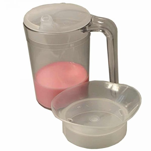 A tough, clear plastic mug, with large, open handle to grip round or under without making a fist. This mug is supplied with two lids, one for anti-spill and one with a drinking spout. It is of a simple design, stackable and easy to clean. The mug is dishwasher safe however the lids are not, but can be used in the microwave.