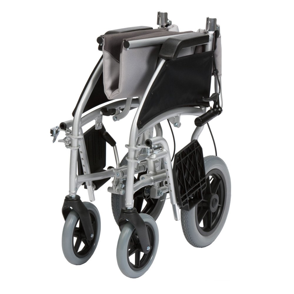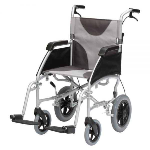 This ultra-lightweight aluminium wheelchair combines style with function and practicality. The chair folds up easily for storage, via a half-folding backrest and features fully upholstered armrests.
