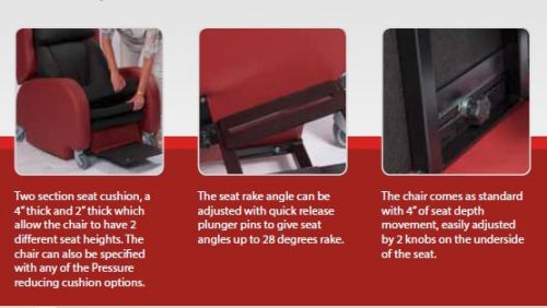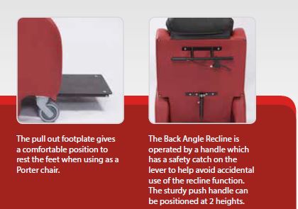 The DSL Alpha chair is an inexpensive solution to Portering needs but with many adjustable features to make this a comfortable all day chair. The chair has adjustable seat depth, seat rake angle and back rest recline with a waterfall back as standard. The chair is available in 3 widths (16″ 18” and 20”) with a double seat cushion as standard. The two section seat cushion is 4” thick and 2” thick which allows the chair to have 2 different seat heights. The chair comes with standard foam but can be upgraded with a choice of different pressure reducing cushion to suit the clients needs. The material used for the cushions and seat is a 4 way stretch vapour permeable fabric which is washable up to 95°C and is flexible that it allows the pressure relief to operate to its full potential. The DSL Alpha also comes as standard with a pull out footplate which gives a comfortable position to rest the feet when using as a Porter chair.