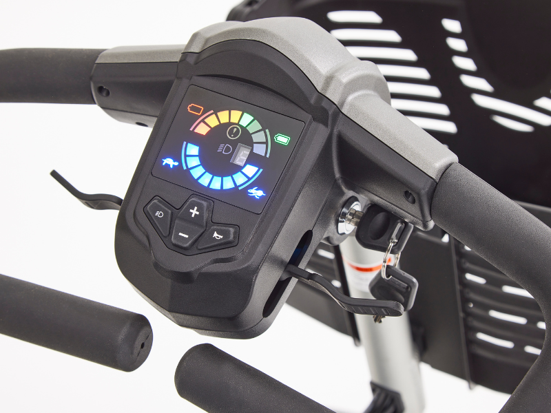 With its 21 mile range and 22 stone weight limit the Aura has slightly larger dimensions, pneumatic tyres and a more supportive captain seat, the Aura allows a user to own just one scooter that can handle more strenuous day to day use with more comfort but is still easy and light when they need to travel.