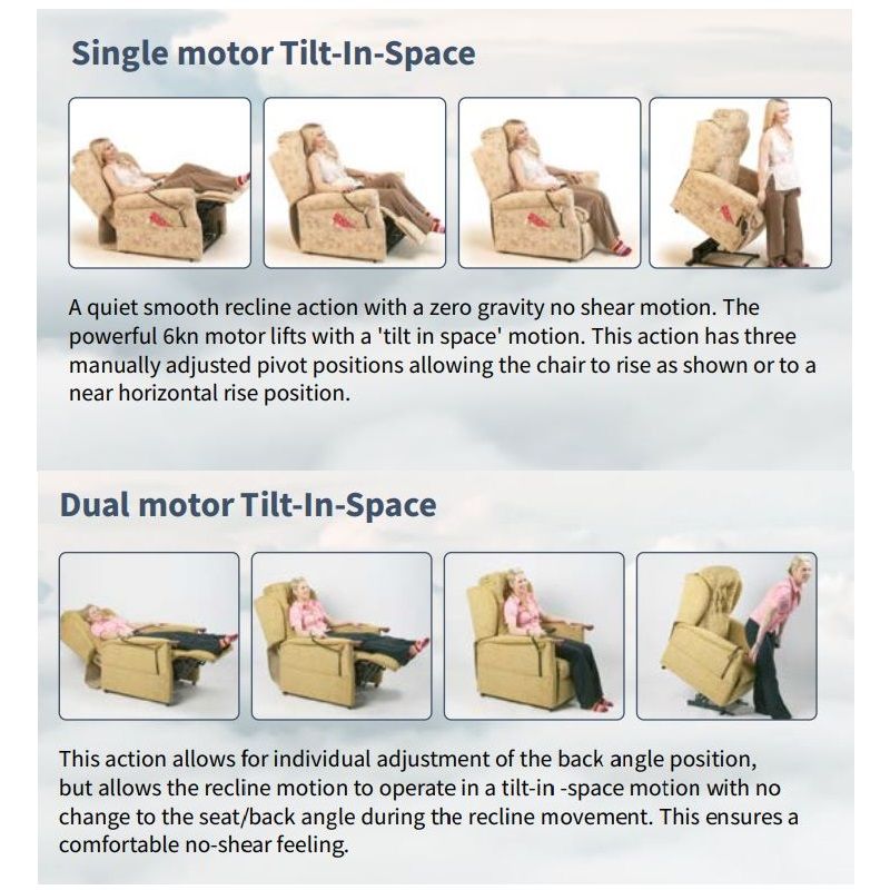 The DSL Dream rise and recline chair is available in 7 chair sizes and 2 chair actions – Single Motor, Tilt-In-Space: This motion allows the back and feet of the chair to be adjusted in a single, synchronized motion, allowing the user to raise their feet above their hips without entering a fully reclined position and Dual Motor, Tilt-In-Space: This motion allows the back and feet of the chair to be adjusted in a single, synchronized motion, allowing the user to raise their feet above their hips without entering a fully reclined position, the back can then be adjusted independently to suit the user’s needs.