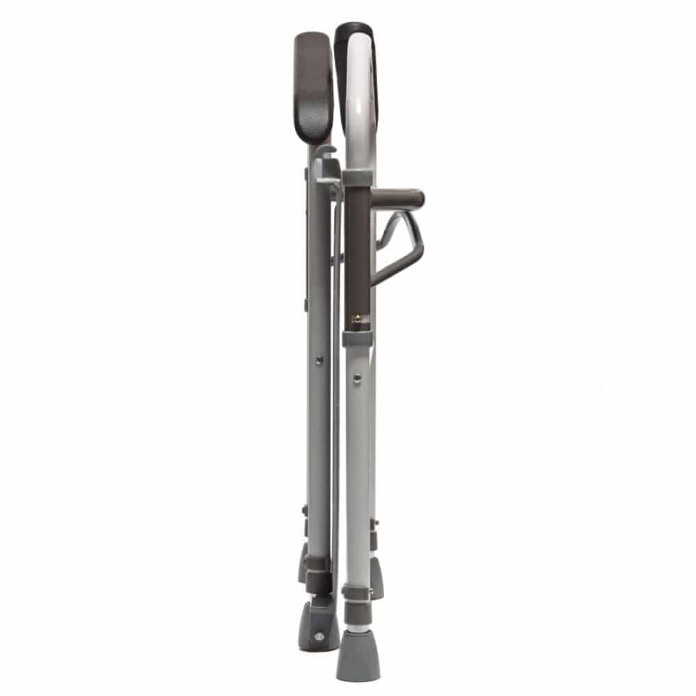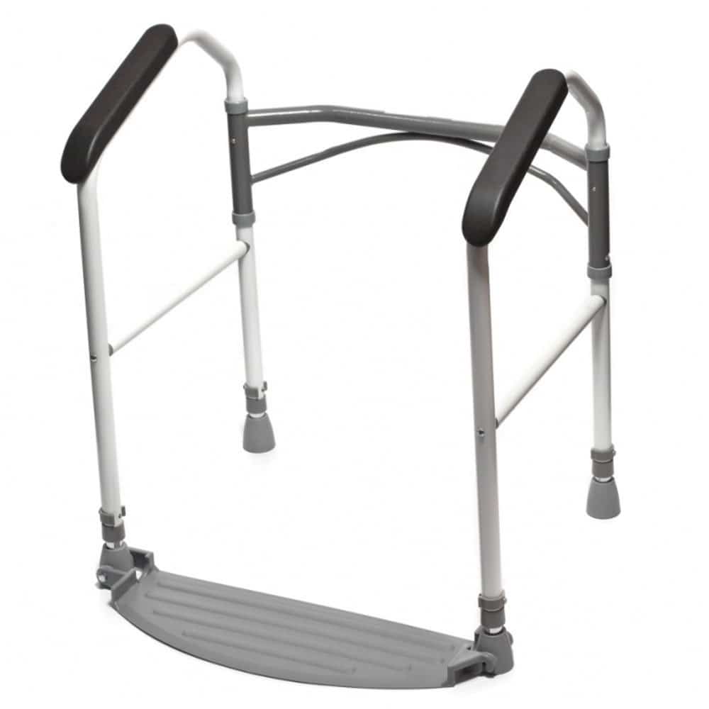 The FoldEasy Toilet Frame folds conveniently when not in use and is height adjustable. The user should stand on the footplate when positioned on the floor which will hold the frame steady when using the handles to raise and lower onto the toilet seat.