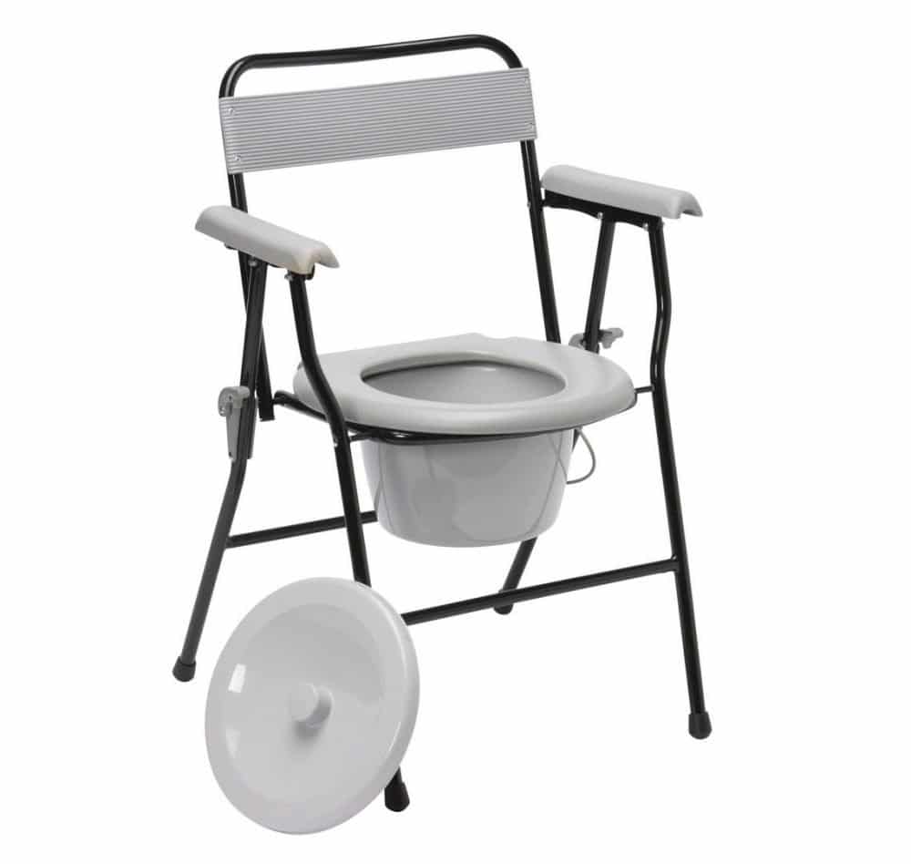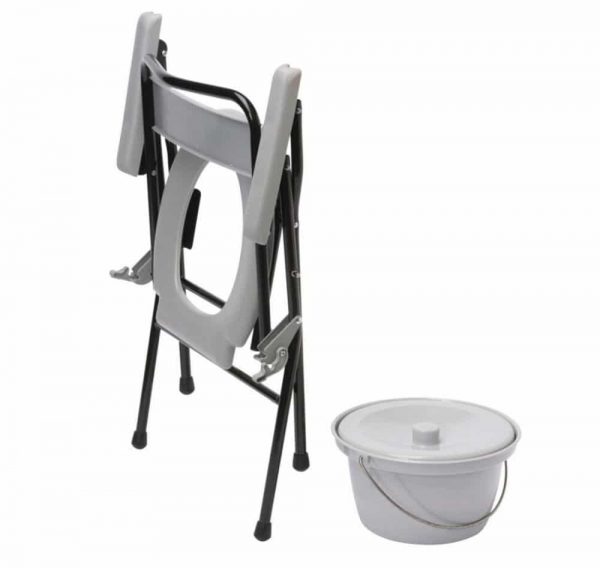 This extremely lightweight, sturdy steel commode folds easily for storage or transportation. It has a comfortable armrests and a soft webbed backrest for added comfort. The commodes 5 litre pan, with lid and handle, is mounted on a steel frame beneath the grey plastic seat. The back of the frame forms a backrest when in use and a handle when folded.