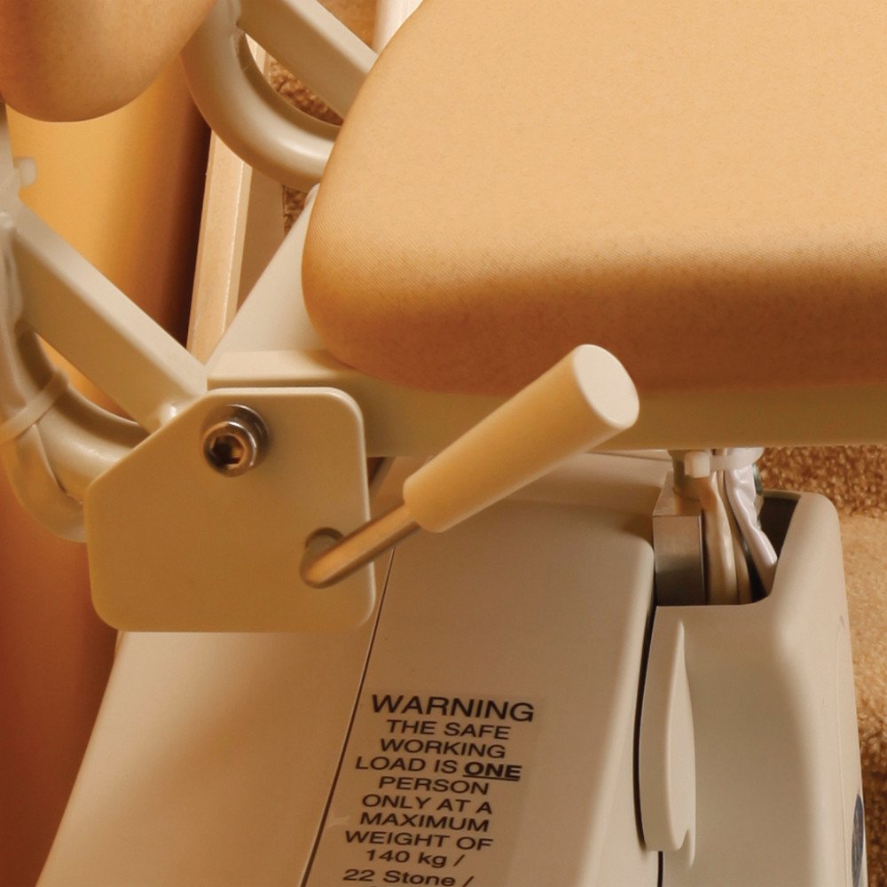 The seat can be swivelled via a handle beneath the seat in order to mount or dismount the stairlift safely.
