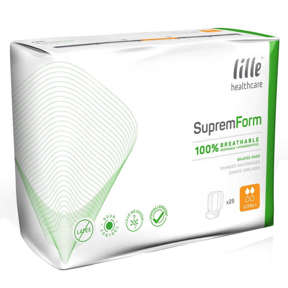 Lille Suprem Form range of high quality products that are an effective solution for managing moderate to severe incontinence. All the products within the range provide high levels of absorption as the user feels dry and comfortable. The Lille Suprem Form is a durable, discrete continence pad with a non-rustle polyethylene backing. The Suprem Form contains a super absorbent polymer as well as hydrophobic leg barriers and leg elastics ensuring total protection against leakage. Breathable and hypo-allergenic to maximise skin integrity the Suprem protective undergarment also have odour control. The wetness indicator will turn blue in contact with urine and indicates when the pad should be changed for maximum comfort. These have suitable absorbency levels for daytime use through to total night time protection.
