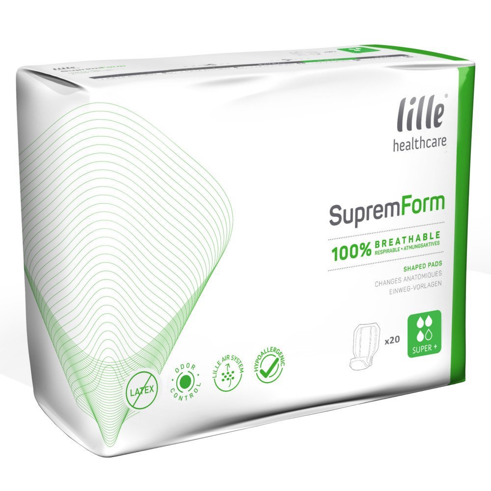 Lille Suprem Form range of high quality products that are an effective solution for managing moderate to severe incontinence. All the products within the range provide high levels of absorption as the user feels dry and comfortable. The Lille Suprem Form is a durable, discrete continence pad with a non-rustle polyethylene backing. The Suprem Form contains a super absorbent polymer as well as hydrophobic leg barriers and leg elastics ensuring total protection against leakage. Breathable and hypo-allergenic to maximise skin integrity the Suprem protective undergarment also have odour control. The wetness indicator will turn blue in contact with urine and indicates when the pad should be changed for maximum comfort. These have suitable absorbency levels for daytime use through to total night time protection.
