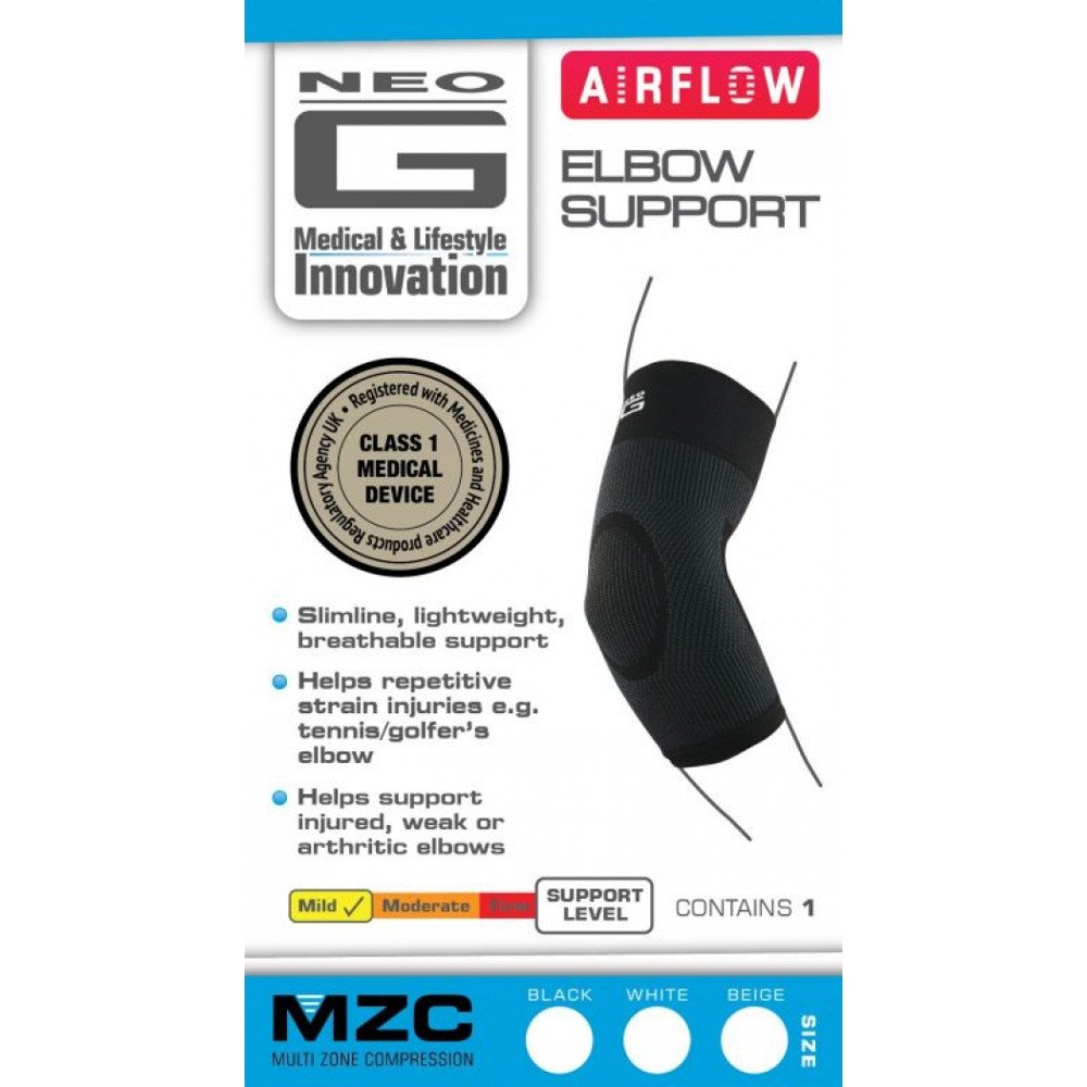 The Neo-G Airflow Elbow Support with Multi Zone Compression provides a snug, yet flexible fit, helping warm muscles and support the elbow during sporting and occupational activities. The specialist breathable fabric helps control moisture during intense activities whilst providing support during movement. The slimline, snug and dynamic design means it can easily be worn under everyday clothes at work, home or on the field for comfort, support and reassurance when you need it most.