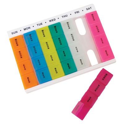 The Week Day Multi Pill Dispenser is ideal for people who take large numbers of tablets throughout the day at regular intervals. It has 4 compartments clearlymarked for each day at set times (Morning, Noon, Afternoon, Evening) in text and in braille. Each of the compartments can be removed and replaced as required, with simple flip top lids for easy access. The brightly coloured compartments make it easy for the visually impaired to differentiate between each day. It is ideal for everyday use at home or work and is also an ideal tablet dispenser for holidays.