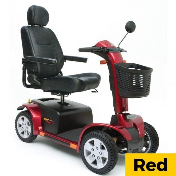 The Pride Colt Pursuit is one of the largest 8mph road scooter from the Pride range and comes with many key features making this road scooter a number one choice. The Colt Pursuit has a powerful drive-train which help drive the large 13 inch pneumatic wheels meaning it can handle any outdoor terrain and with the added benefit of full suspension, help give a comfortable smooth ride. This road scooter also comes with many key features such as the delta tiller and its wraparound handles with a new design of its LCD console with speed sensor, full lighting including directional signals and angle adjustable, rear LED lights and headlight and to add to the comfort with its high back seat and headrest.