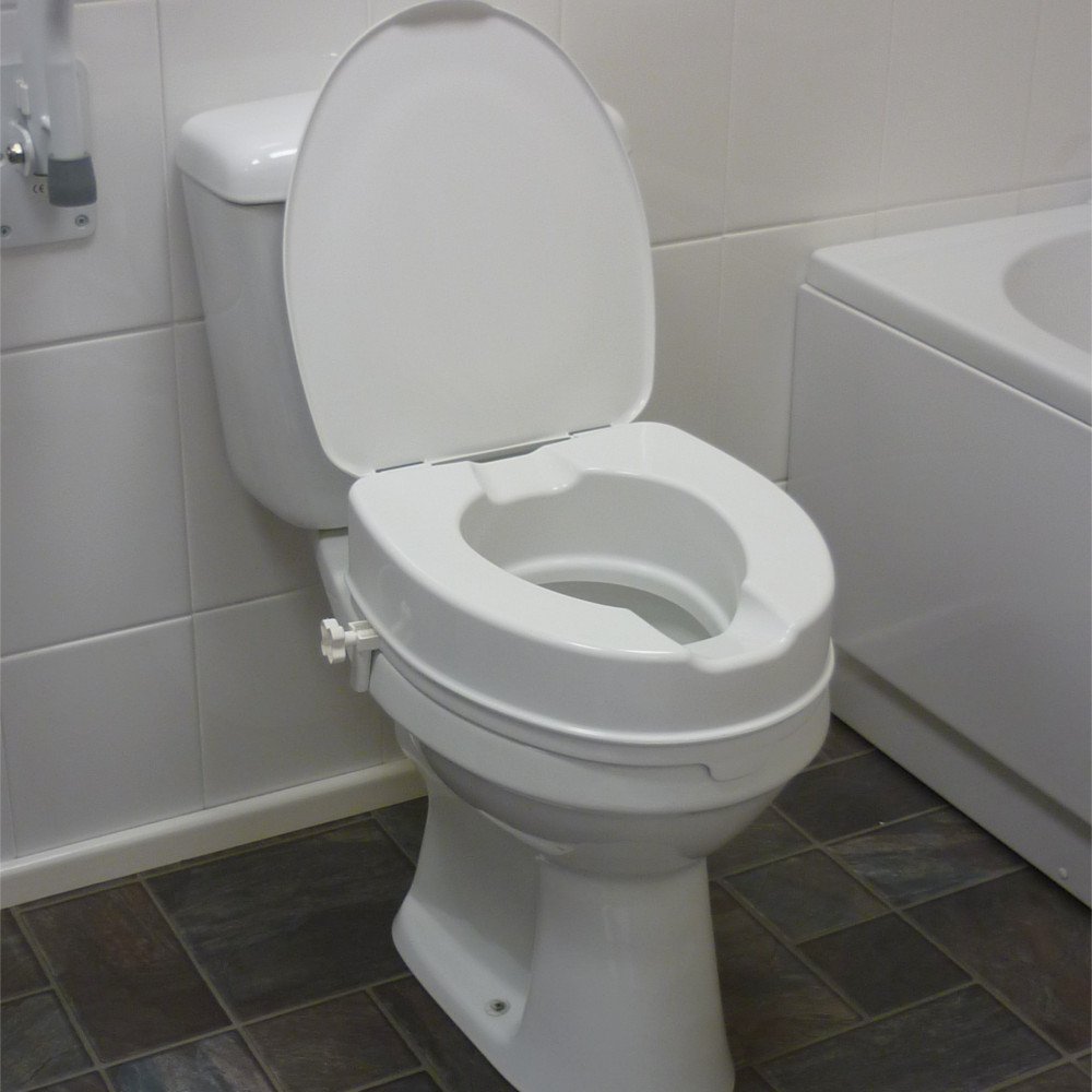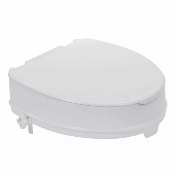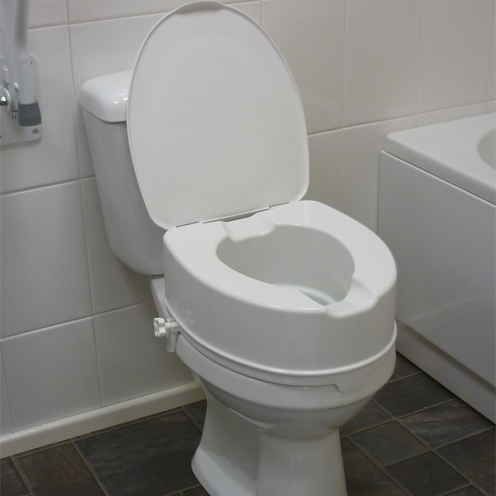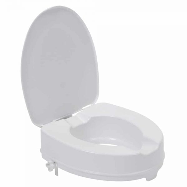 Raised plastic seat with lid designed to fit onto existing toilet bowl to make sitting down and standing up from toilet easier. The raiser features cut outs in front and rear of seat increase access for personal hygiene and smooth, accessible surfaces for user comfort and ease of cleaning.