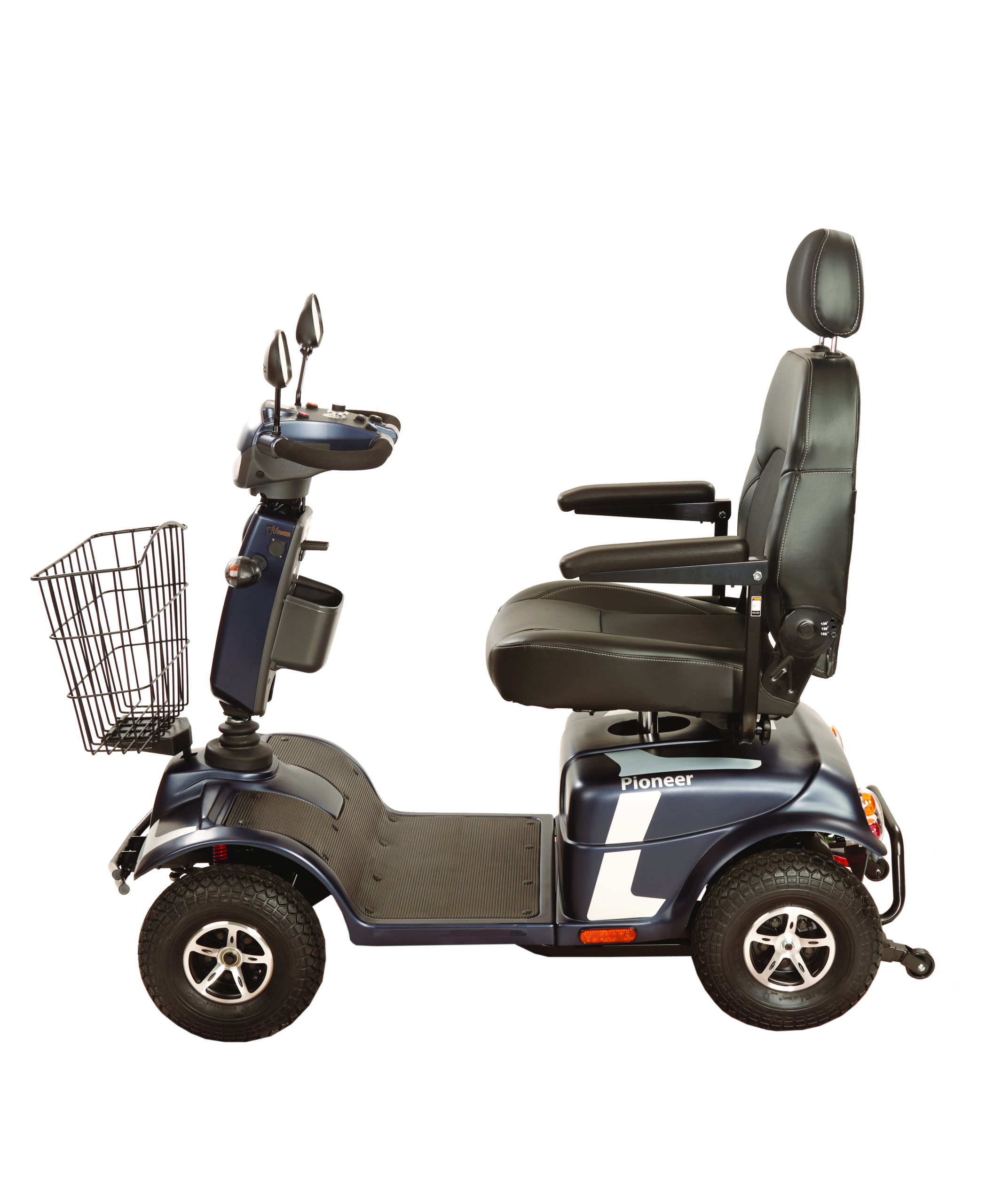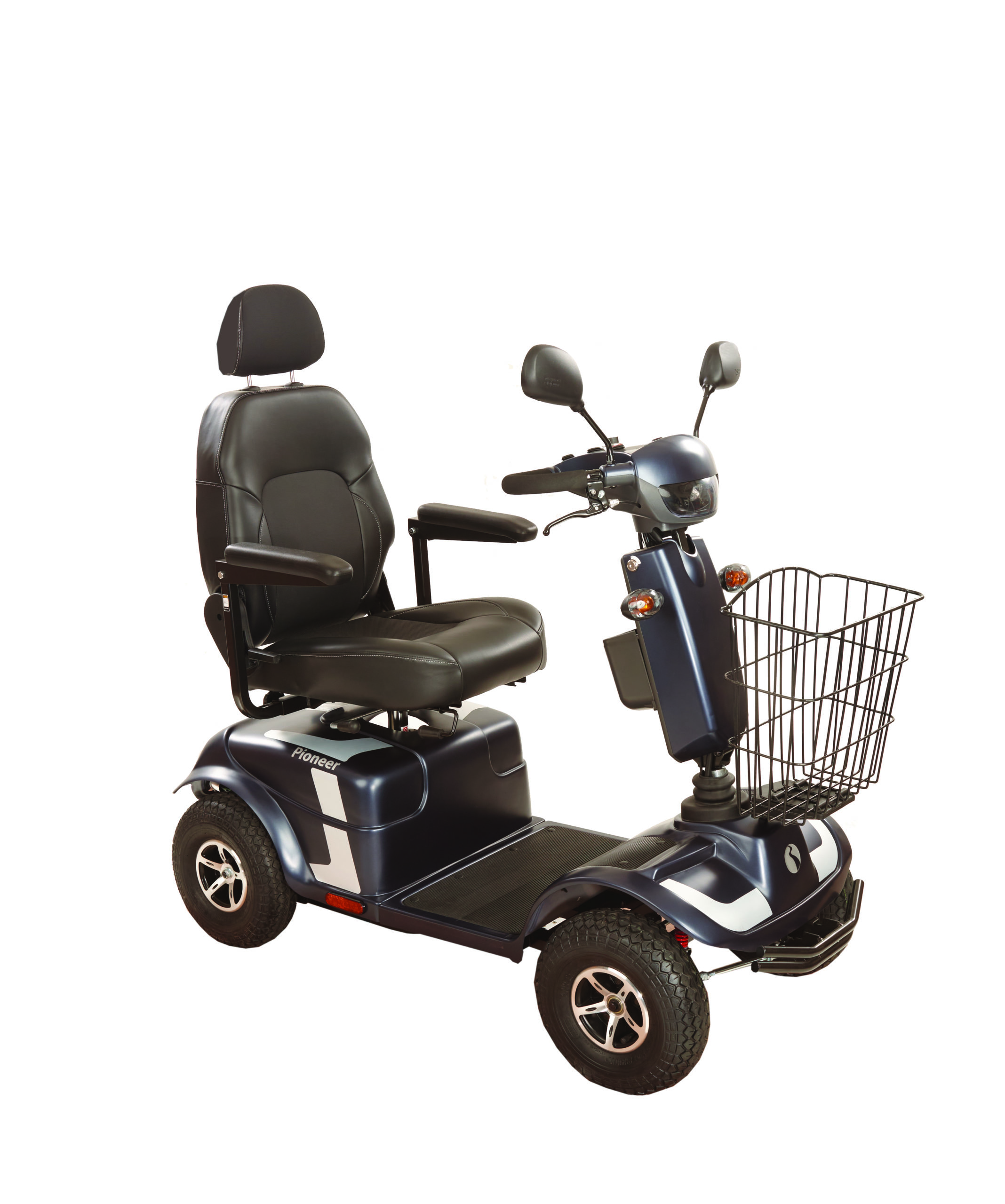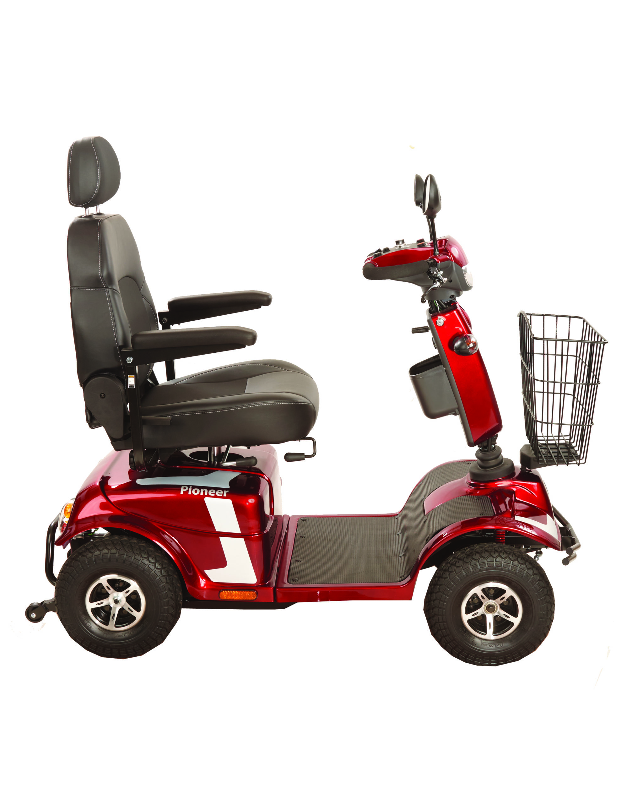 This Rascal Pioneer offers you the flexibility of being fully legal for road use, as well as on pavements and is a proven performer with a fantastic reliability and durability record. The full coil suspension and its powerful motor makes it an ideal scooter for the more challenging environments.  It features a delta-bar tiller with adjustment, a sliding swivel seat with headrest and padded arms as well as simple controls and a large basket making the Pioneer one of the most popular scooters on the market.