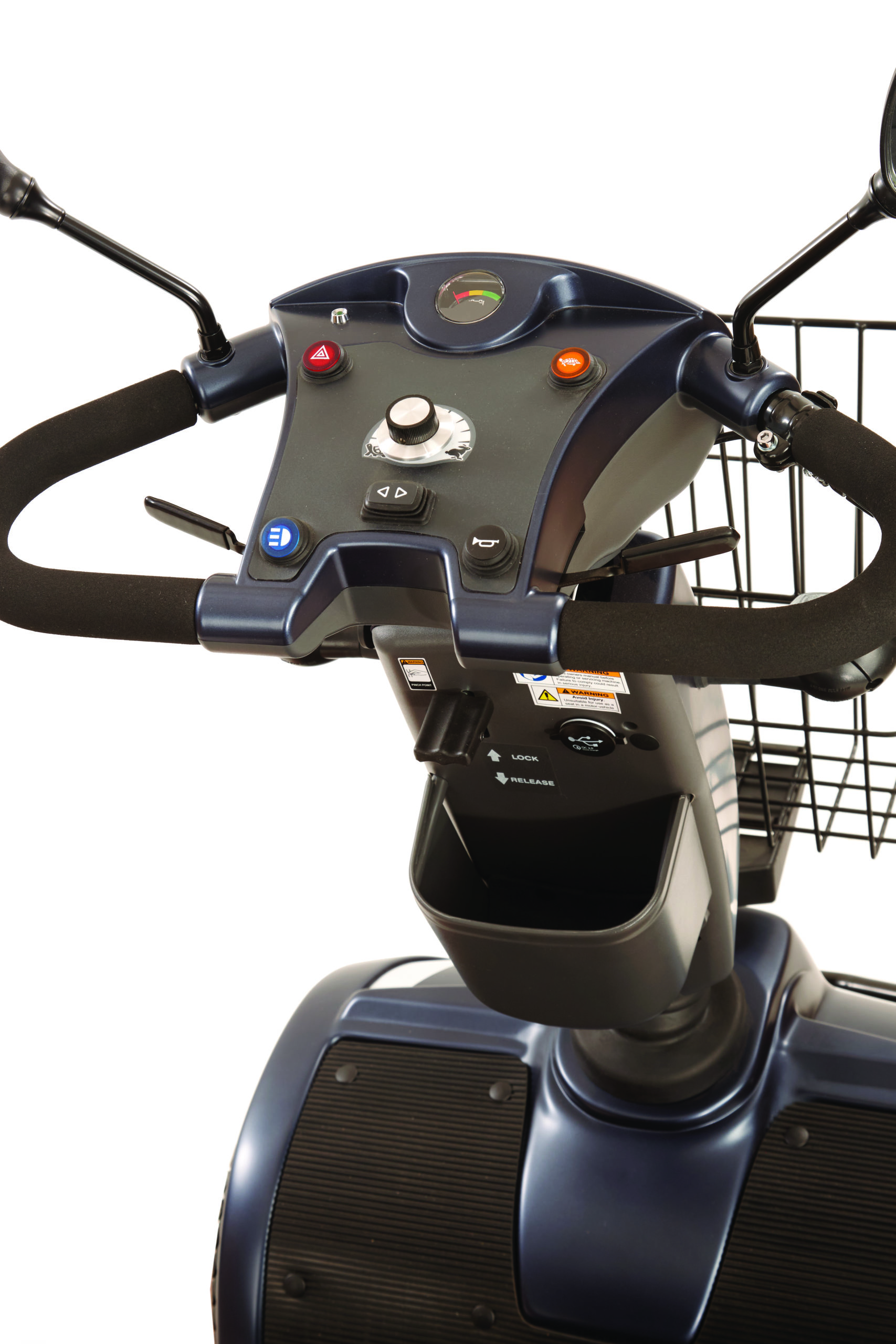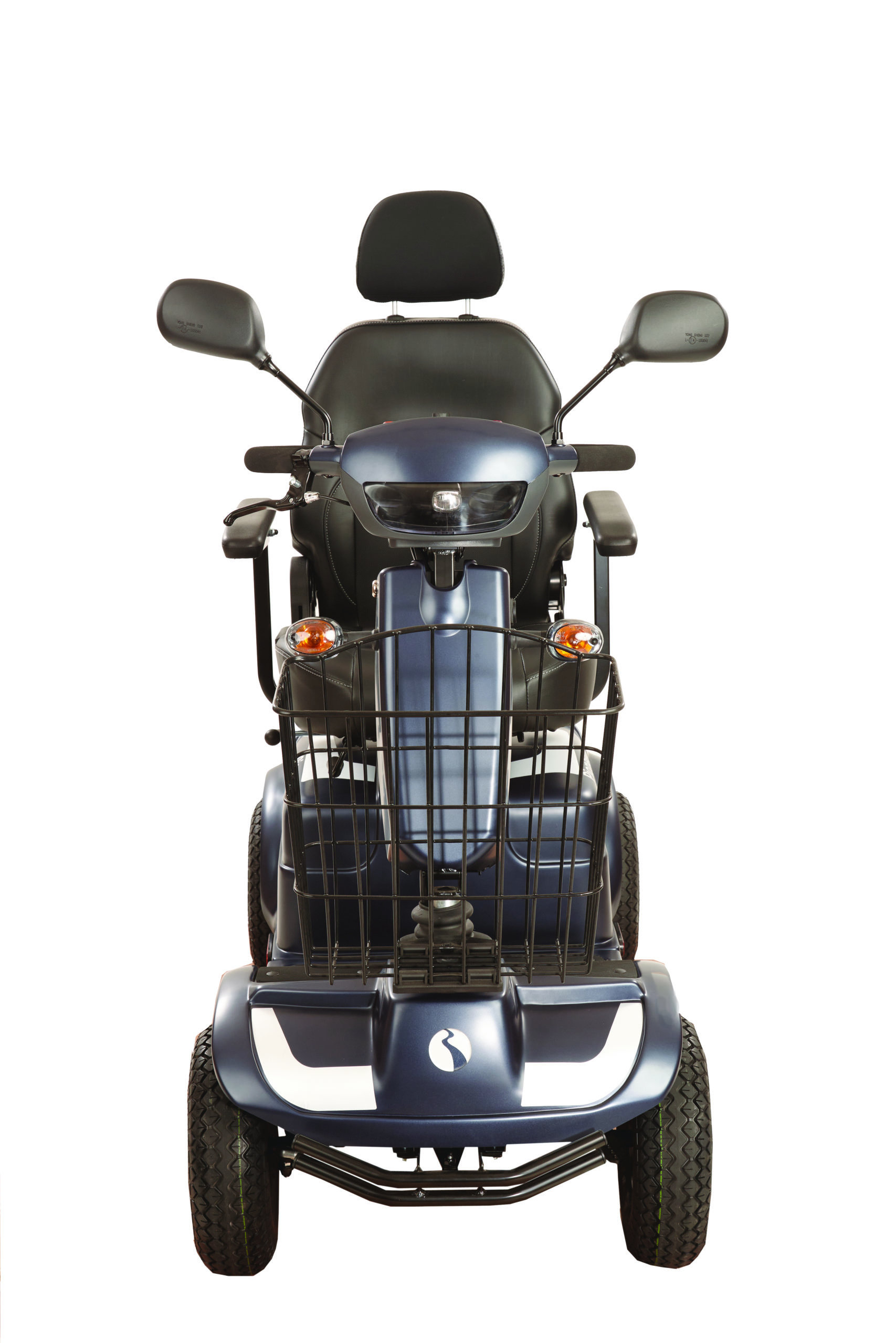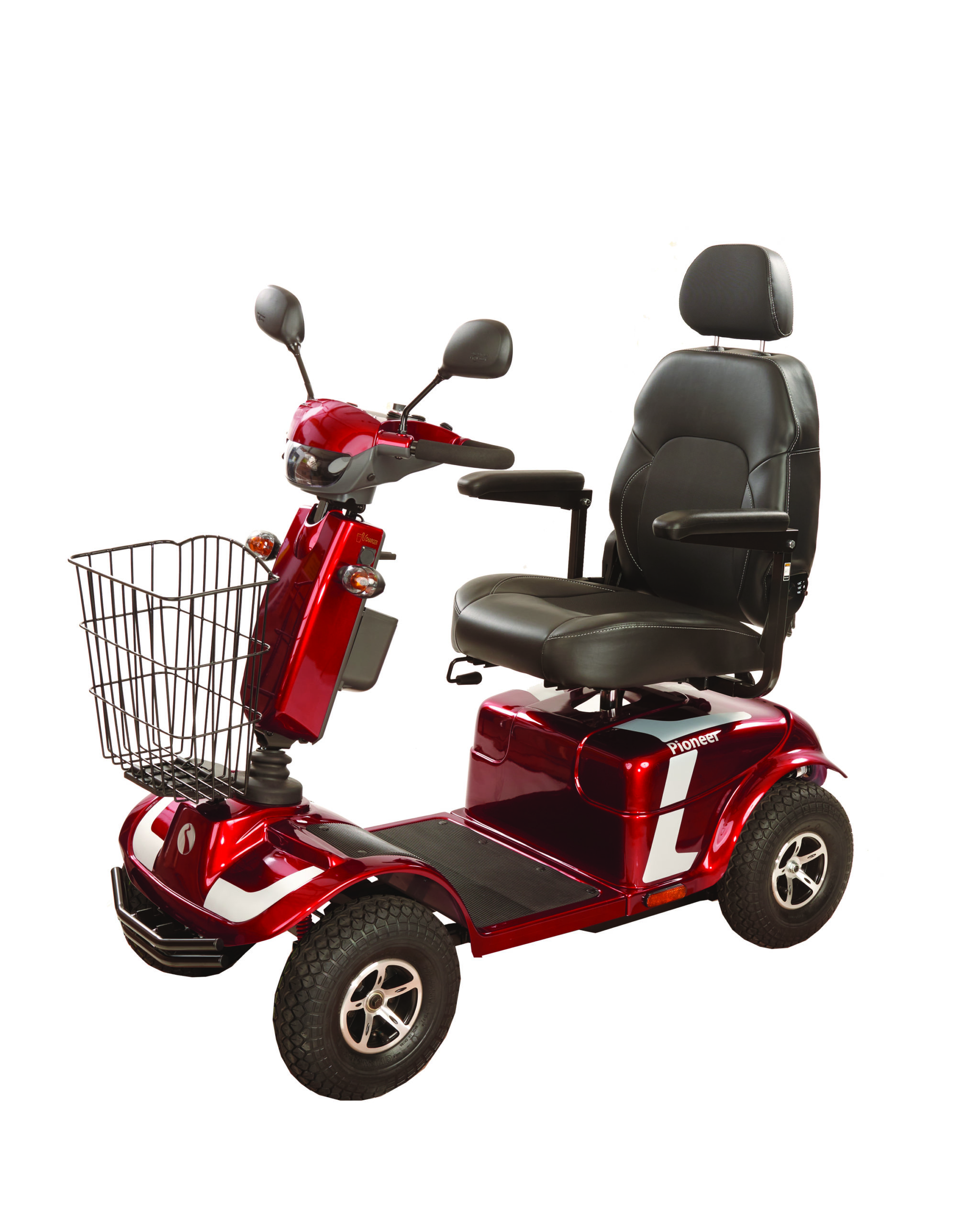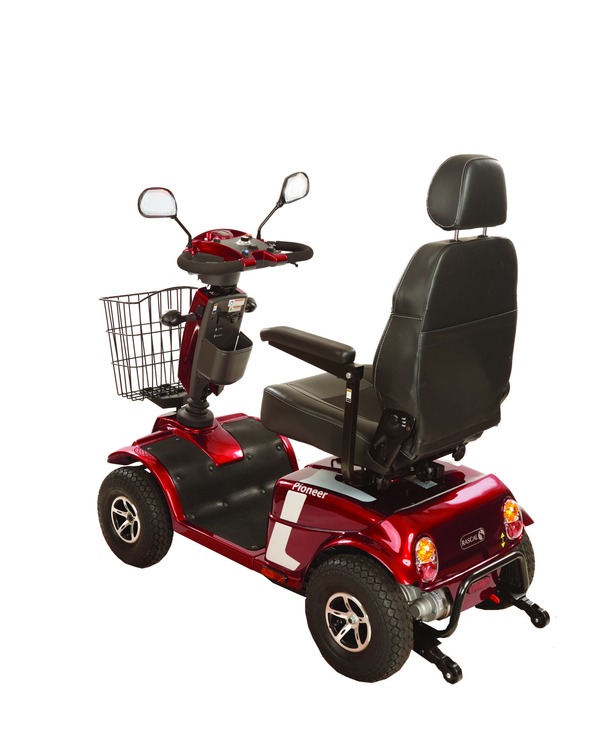 This Rascal Pioneer offers you the flexibility of being fully legal for road use, as well as on pavements and is a proven performer with a fantastic reliability and durability record. The full coil suspension and its powerful motor makes it an ideal scooter for the more challenging environments.  It features a delta-bar tiller with adjustment, a sliding swivel seat with headrest and padded arms as well as simple controls and a large basket making the Pioneer one of the most popular scooters on the market.