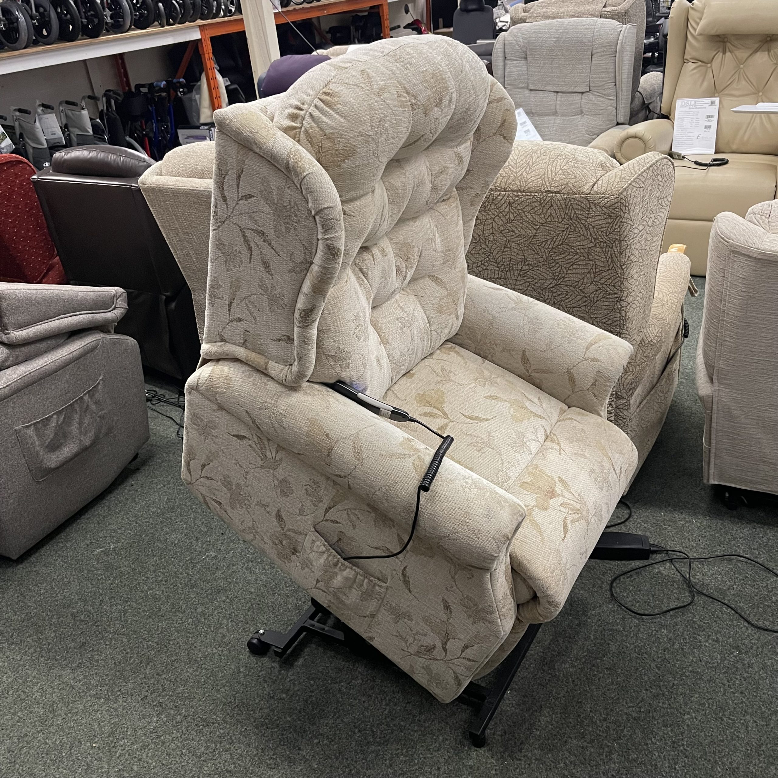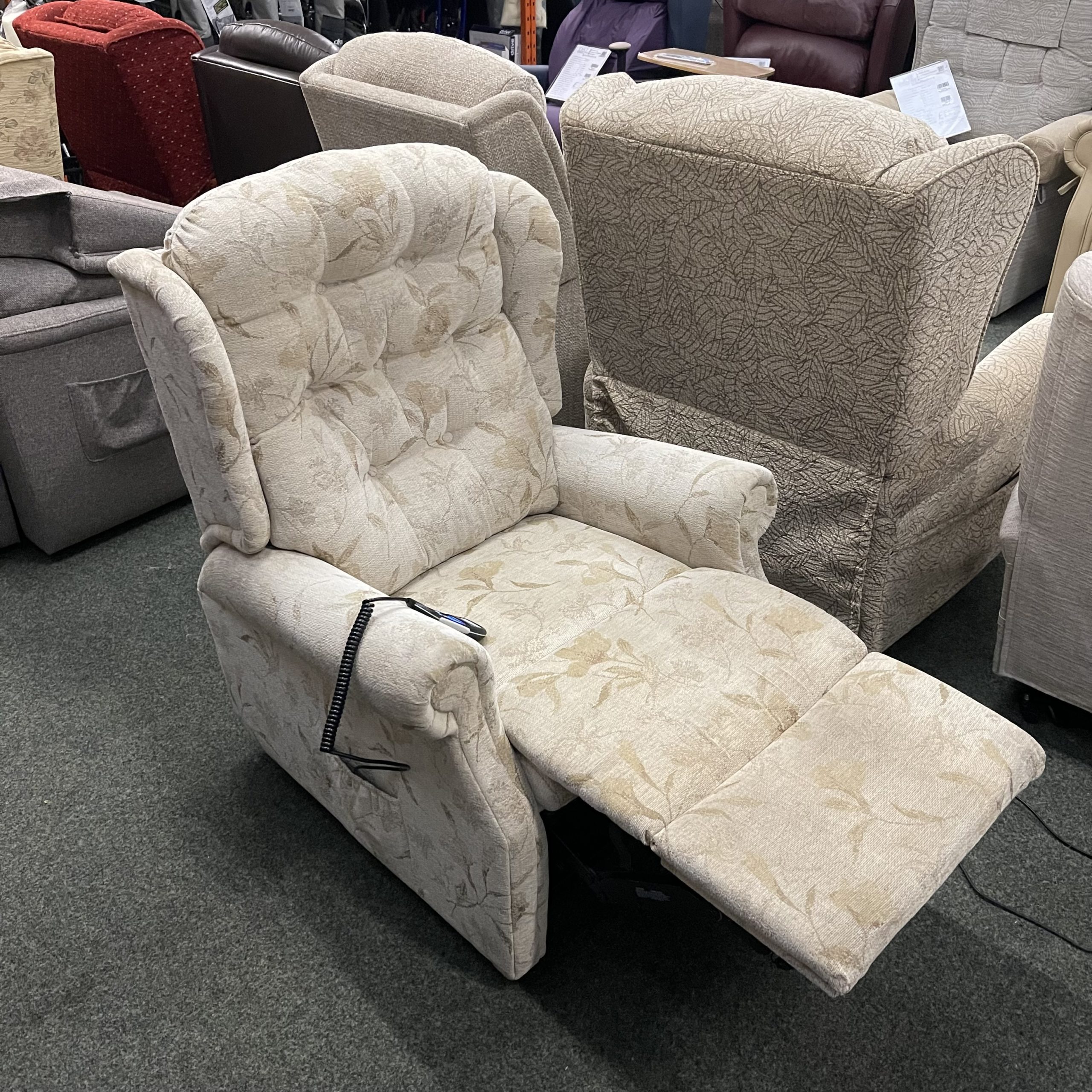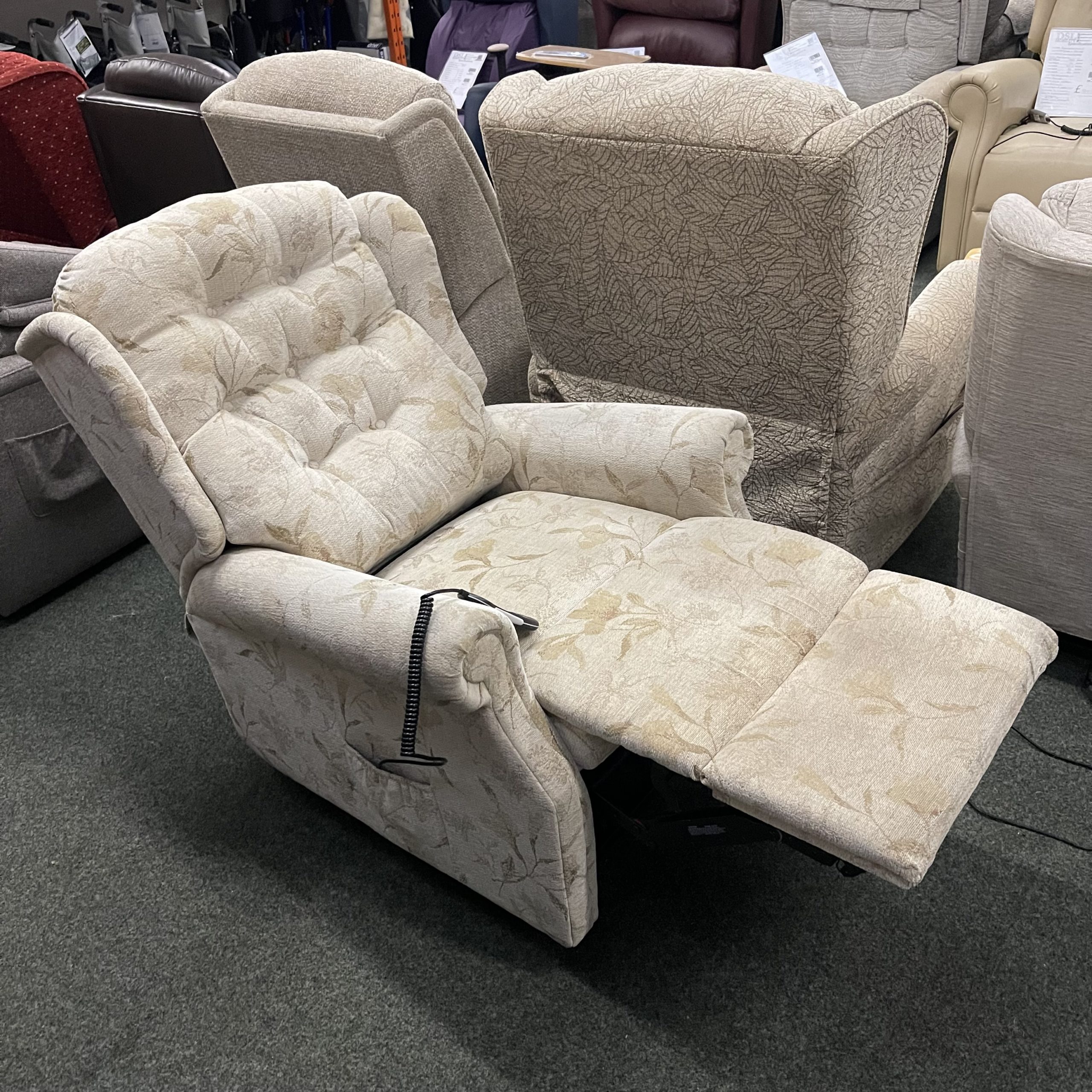 This is a reconditioned Celebrity Rise and Recliner. The chair has a button back, and has a Single Motor: The Single Motor action allows the footrest to raise to its top level, the chair back will then start to recline. The rising action will lift the chair to enable the user to exit or access the chair with ease. This chair is finished in a Floral Cream patterned Fabric.