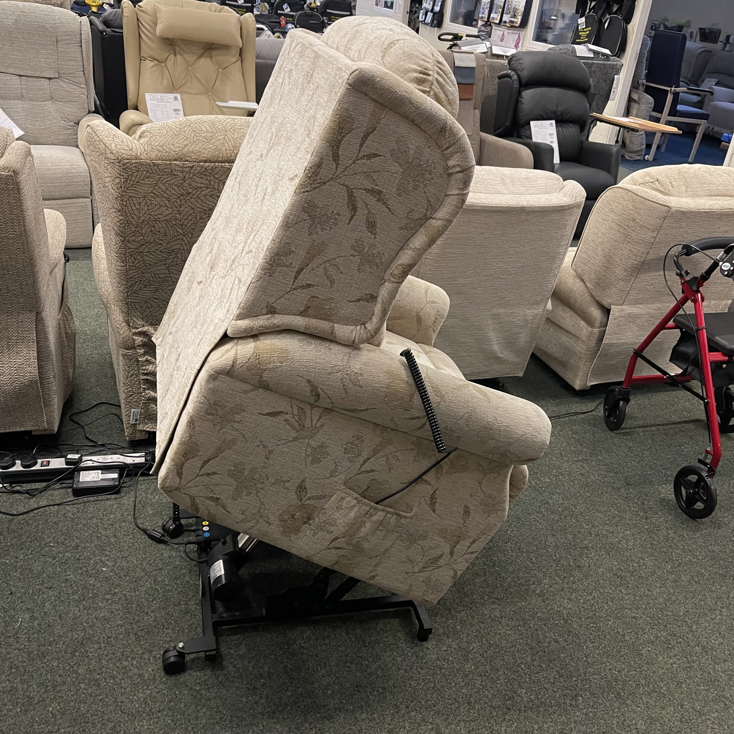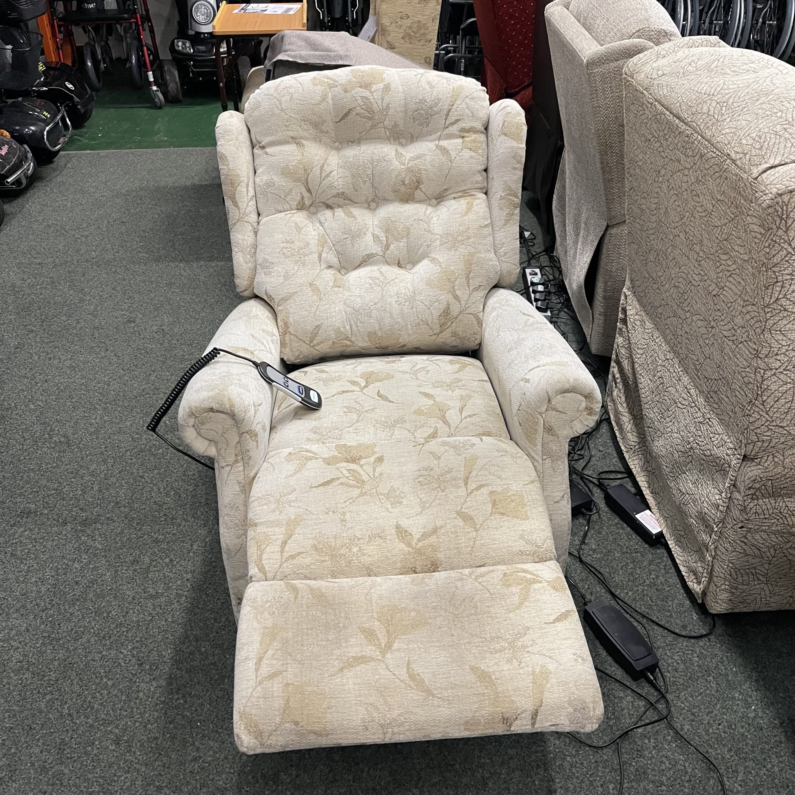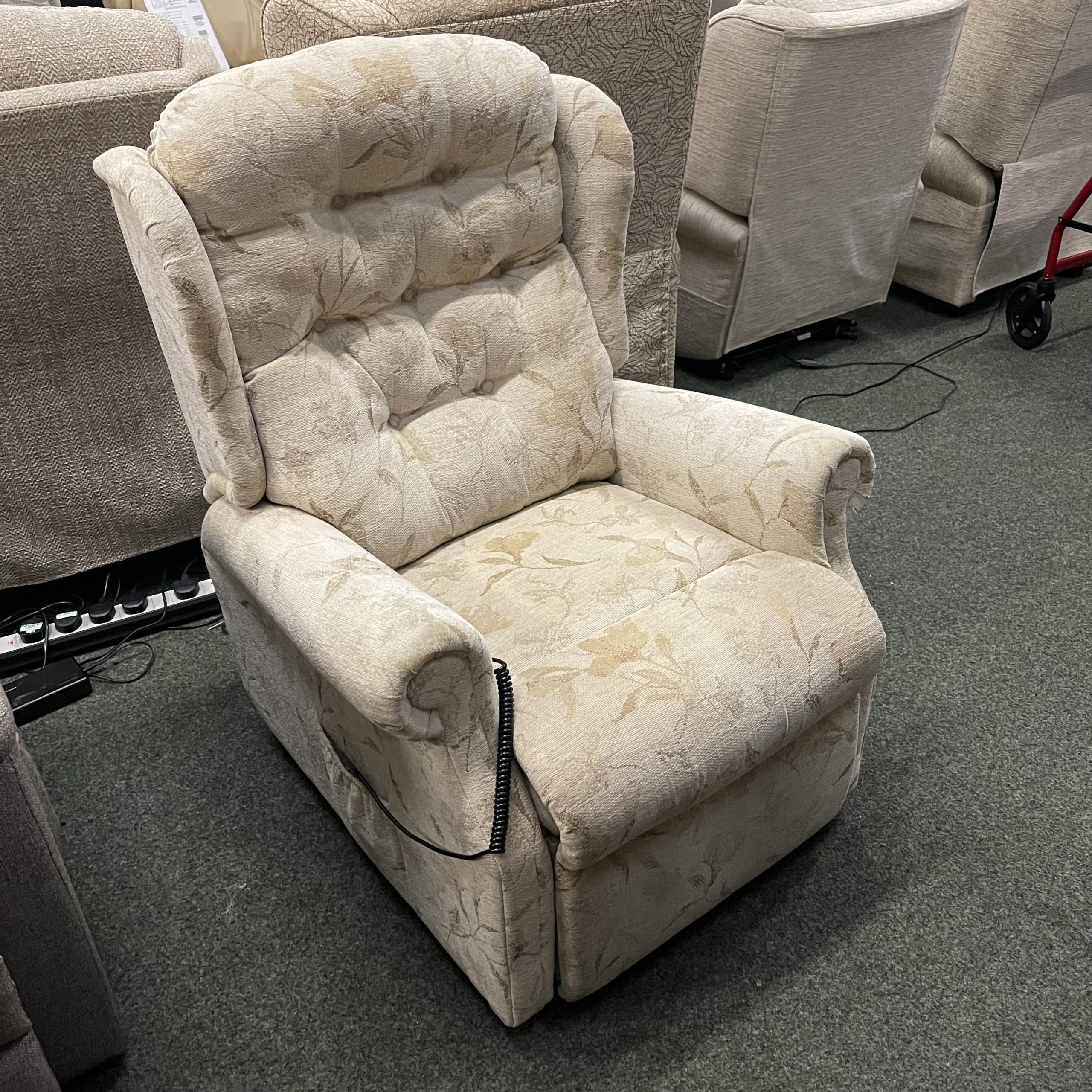 This is a reconditioned Celebrity Rise and Recliner. The chair has a button back, and has a Single Motor: The Single Motor action allows the footrest to raise to its top level, the chair back will then start to recline. The rising action will lift the chair to enable the user to exit or access the chair with ease. This chair is finished in a Floral Cream patterned Fabric.