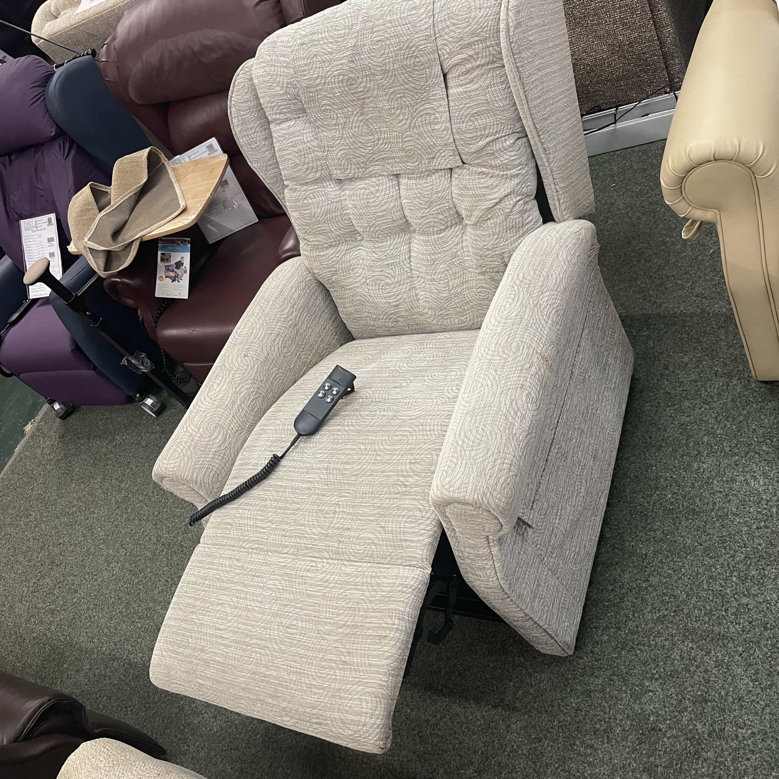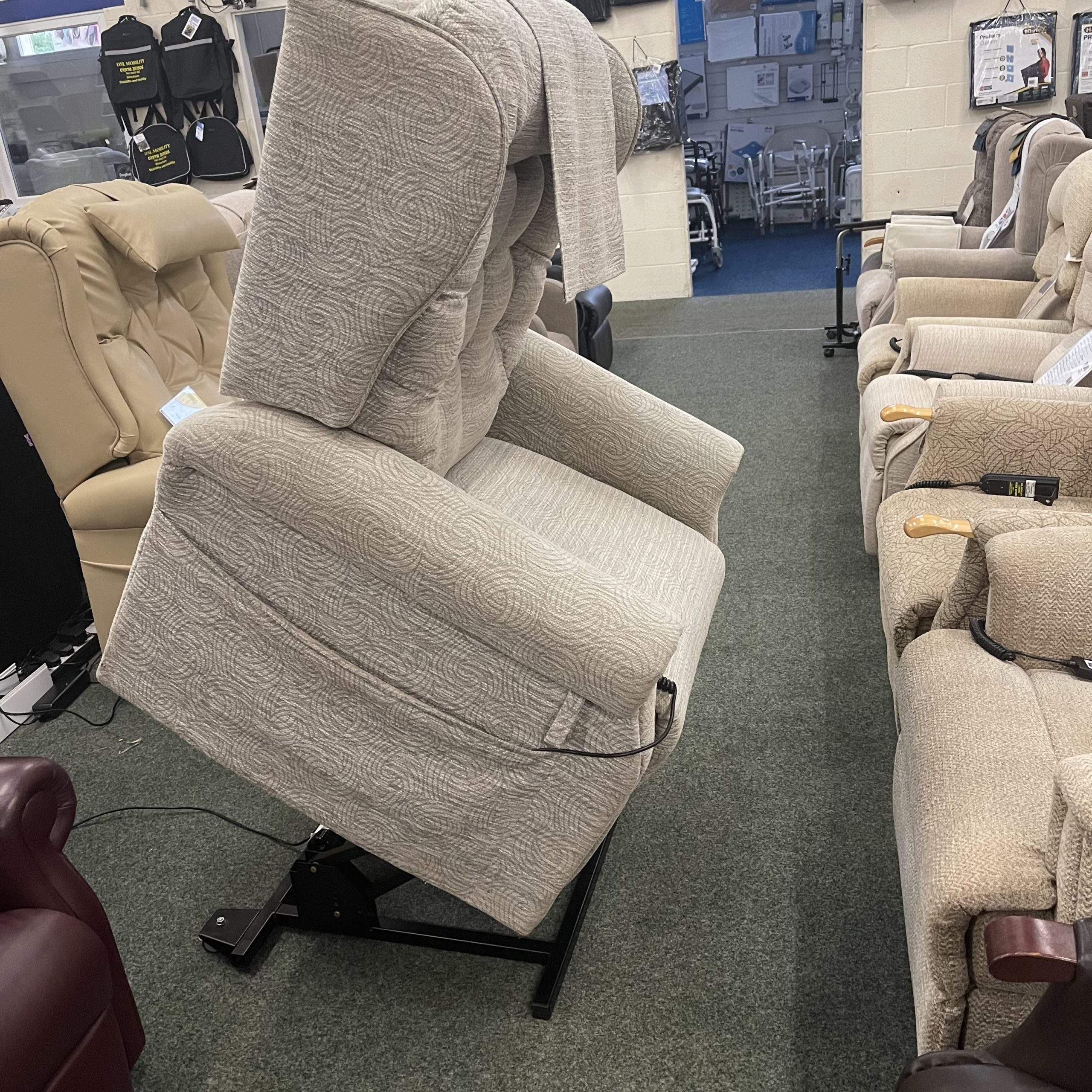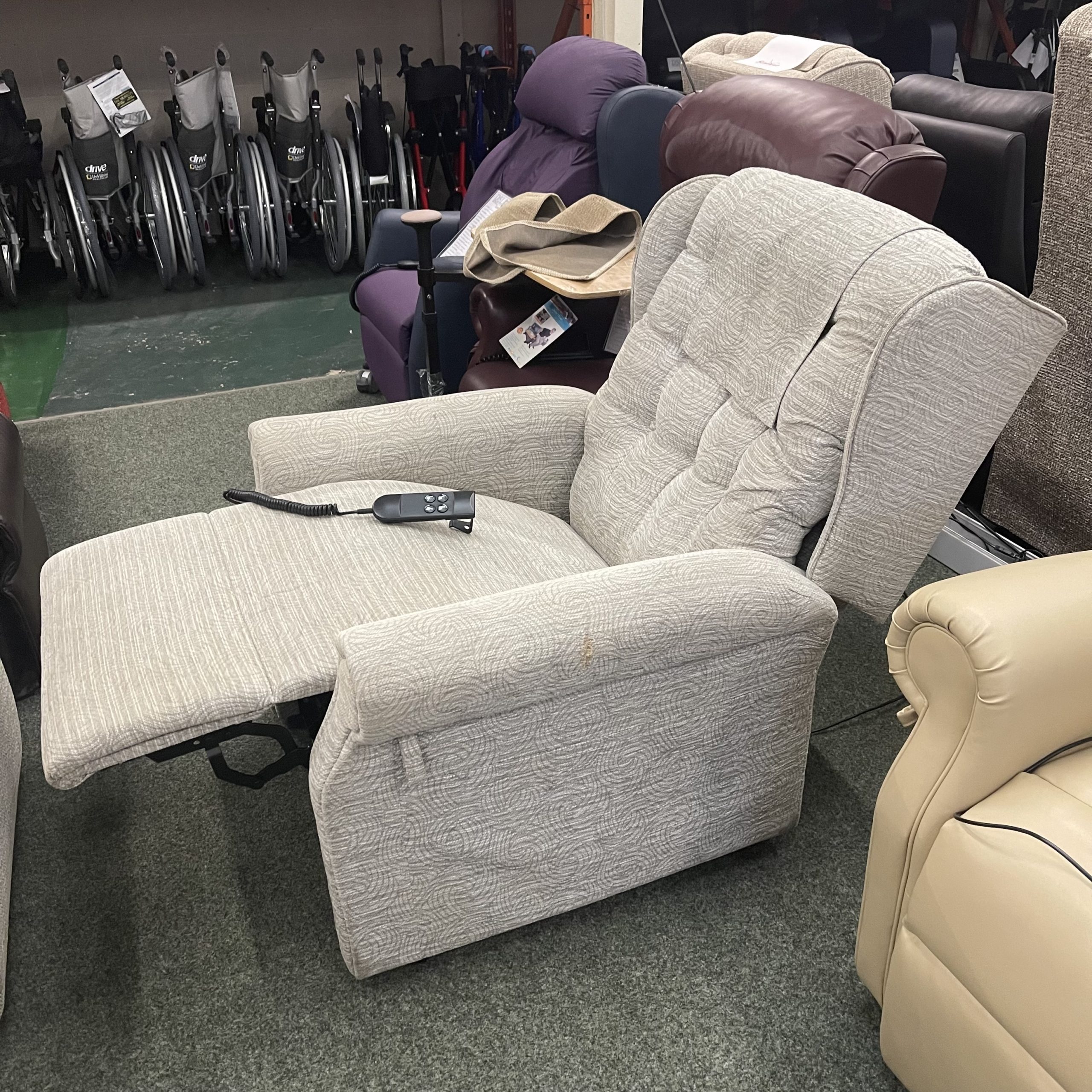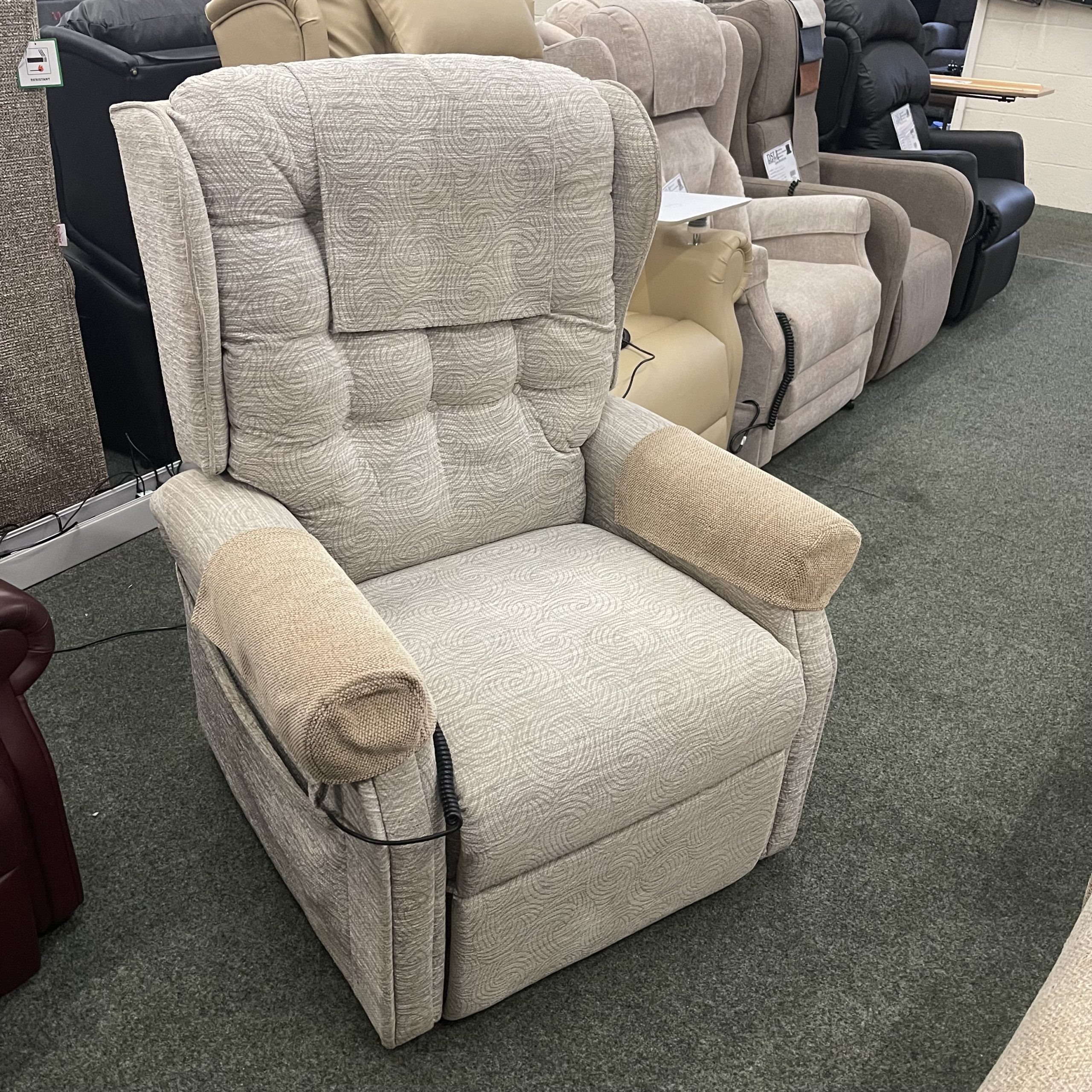 This is a reconditioned Cosi Chair Cheshire Large rise and recliner chair. The chair has a button, and has a Dual Motor, Tilt-In-Space: This motion allows the back and feet of the chair to be adjusted in a single, synchronized motion, allowing the user to raise their feet above their hips without entering a fully reclined position, the back can then be adjusted independently to suit the user’s needs.