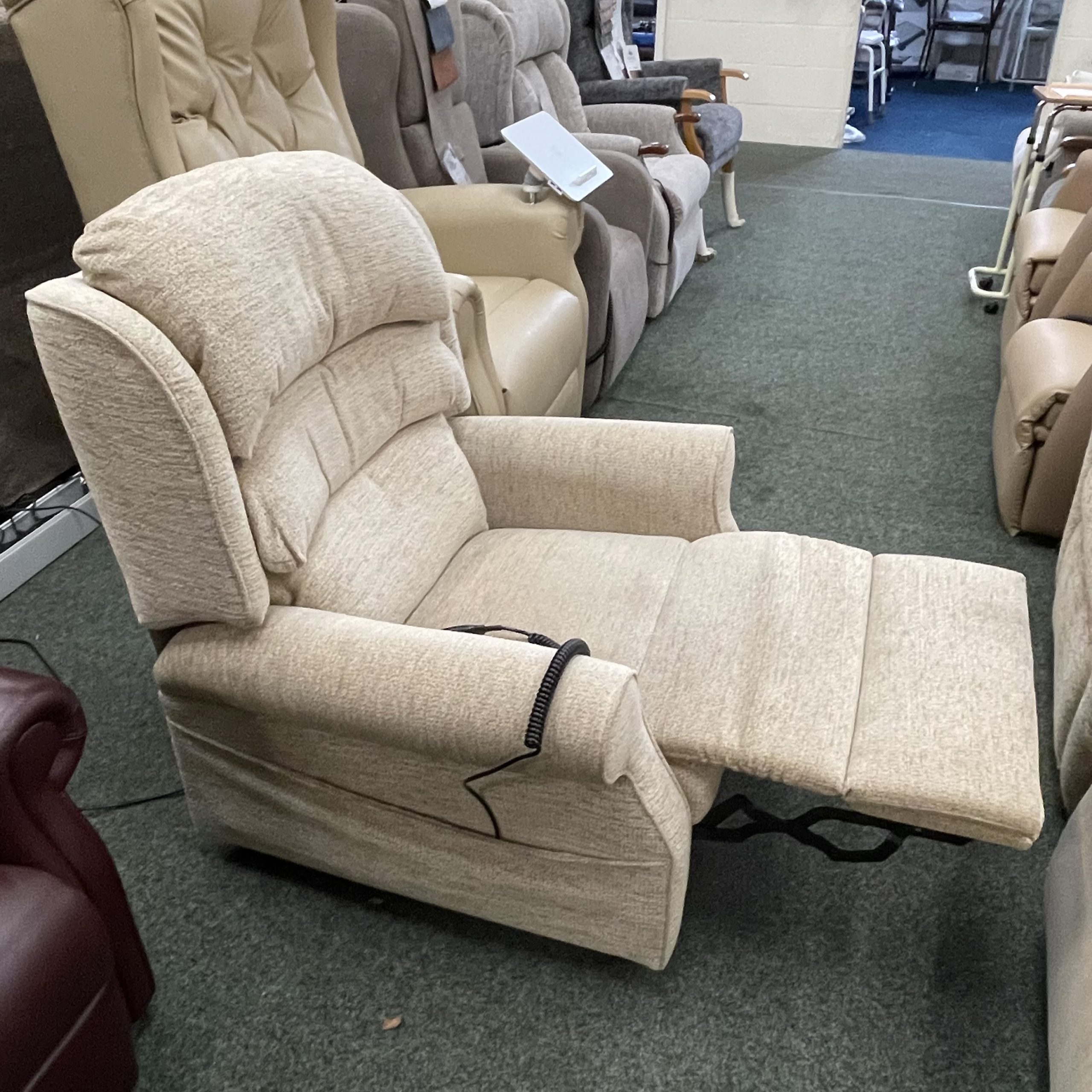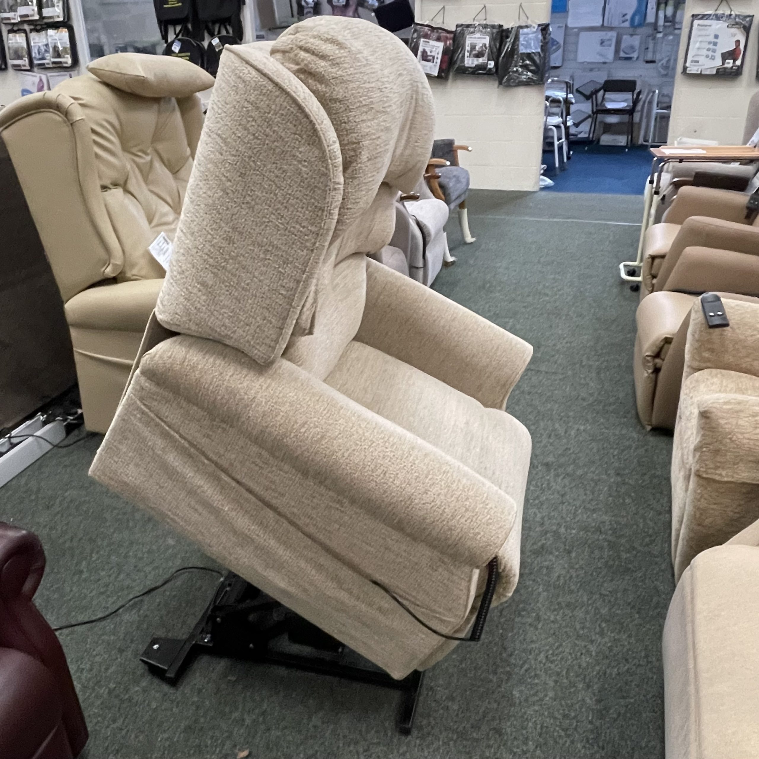 This is a reconditioned HSL Rise and Recliner. The chair has a waterfall fixed back, and has a Dual Motor: This motion allows the back and feet of the chair to be adjusted independently of one another, in two separate motions, allowing the user to choose from a much wider range of positions.