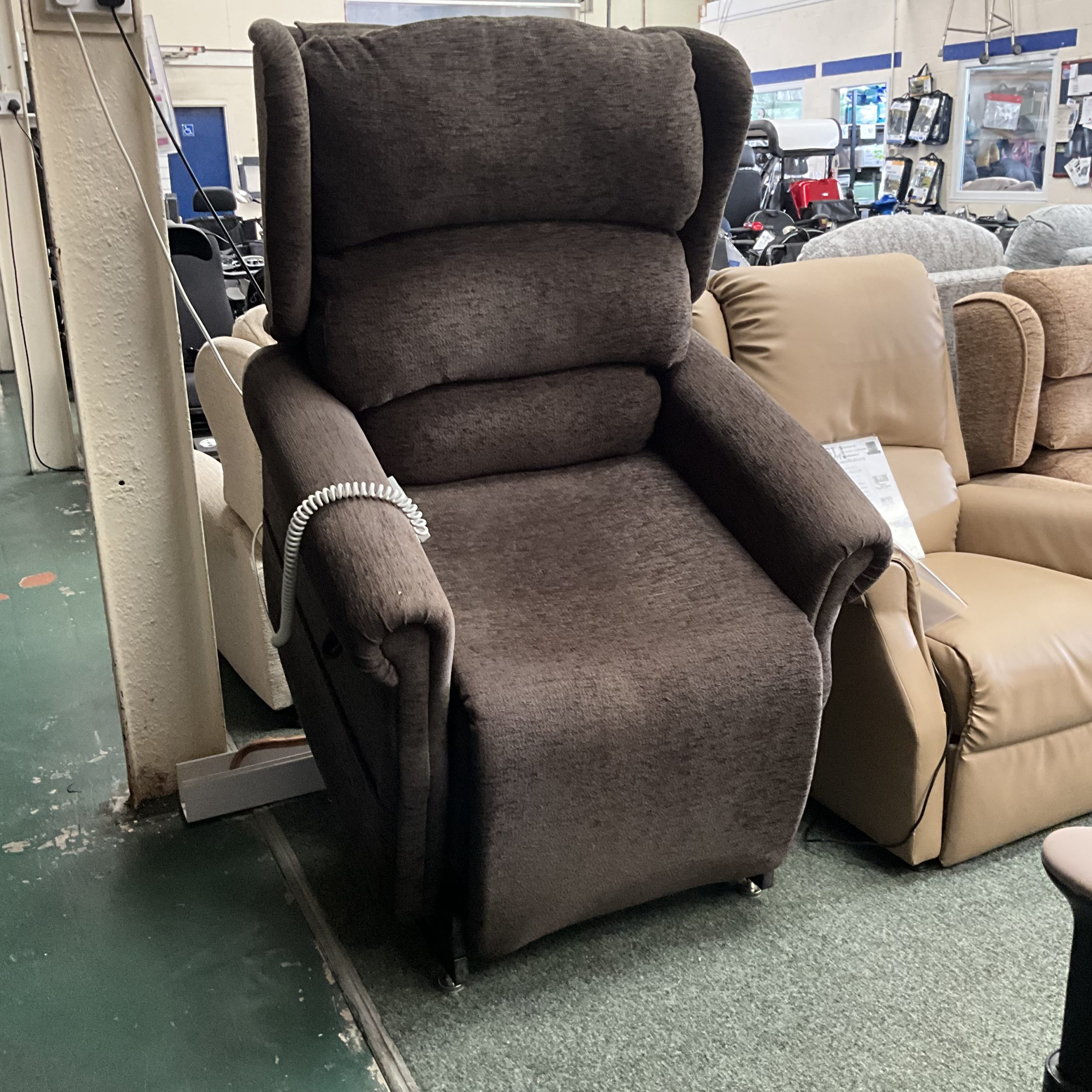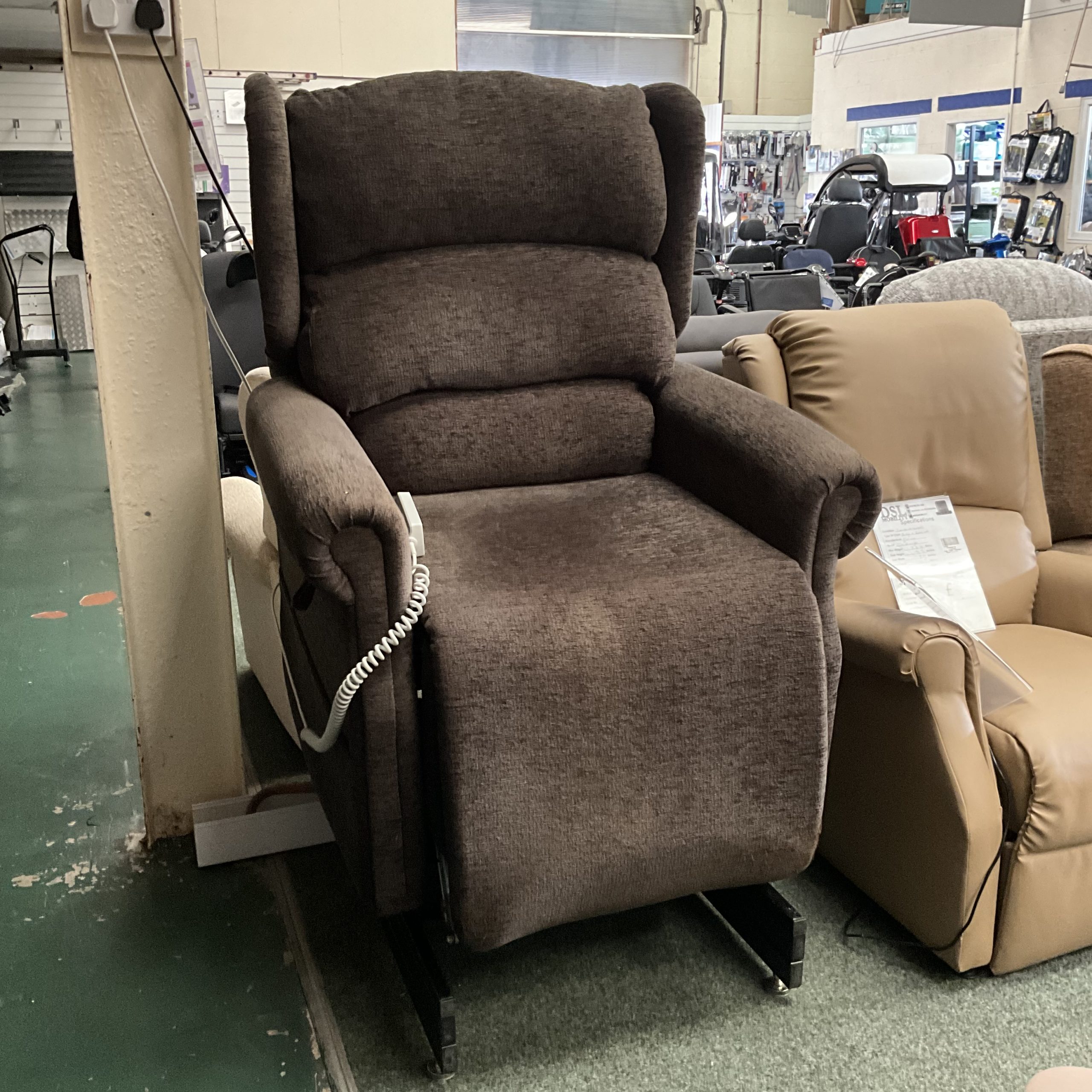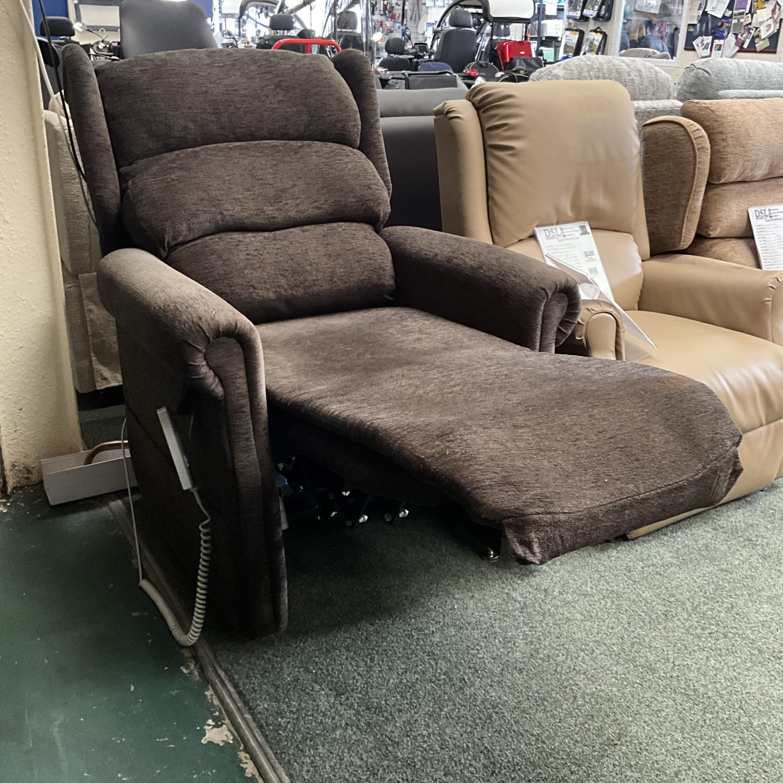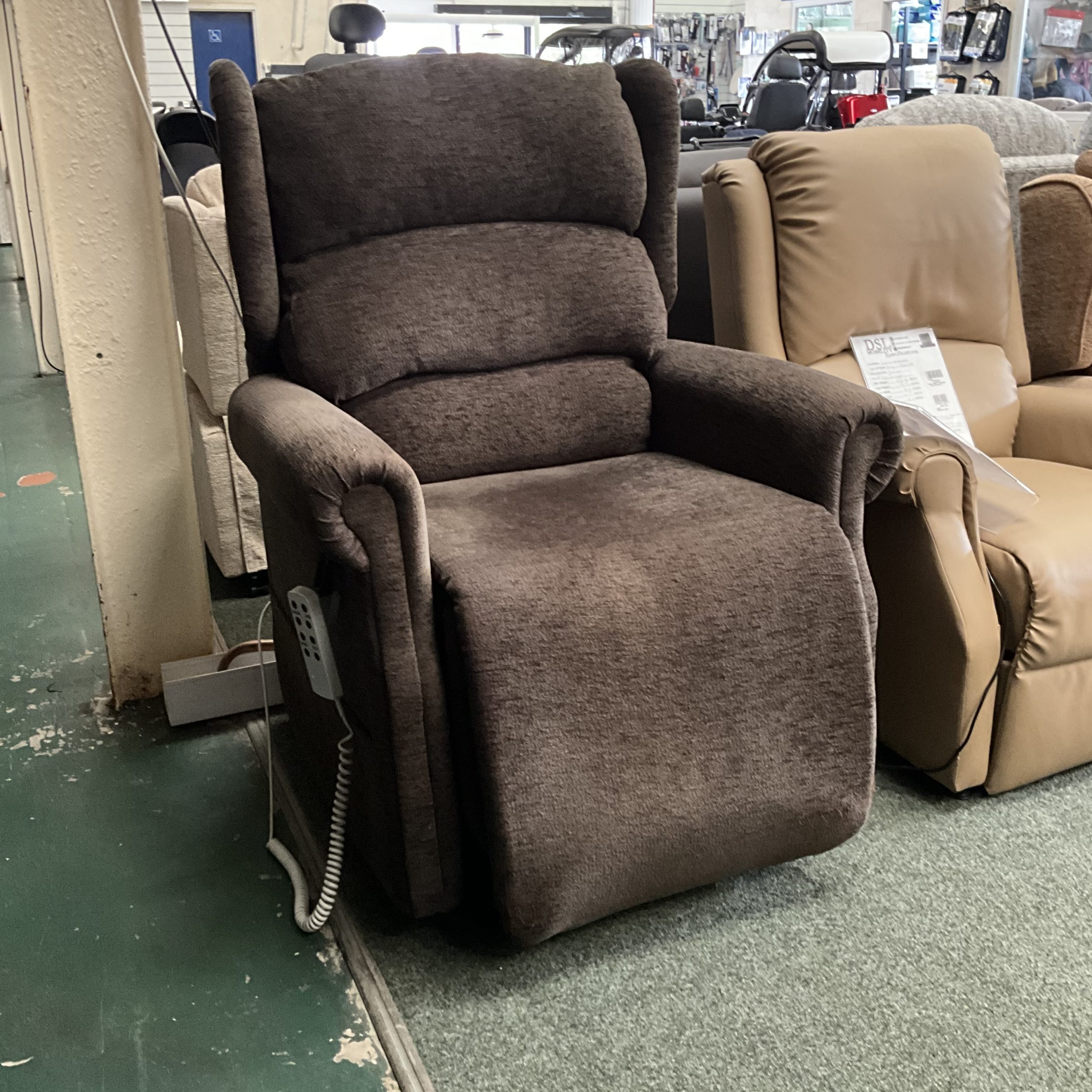 This is a reconditioned DSL Borras rise and recliner chair. The chair has a Waterfall back, and has a BLTR motor: which allows for independent control of the backrest, legrest, tilt, and riser functions. The Chair comes in Boucle mocha fabric.