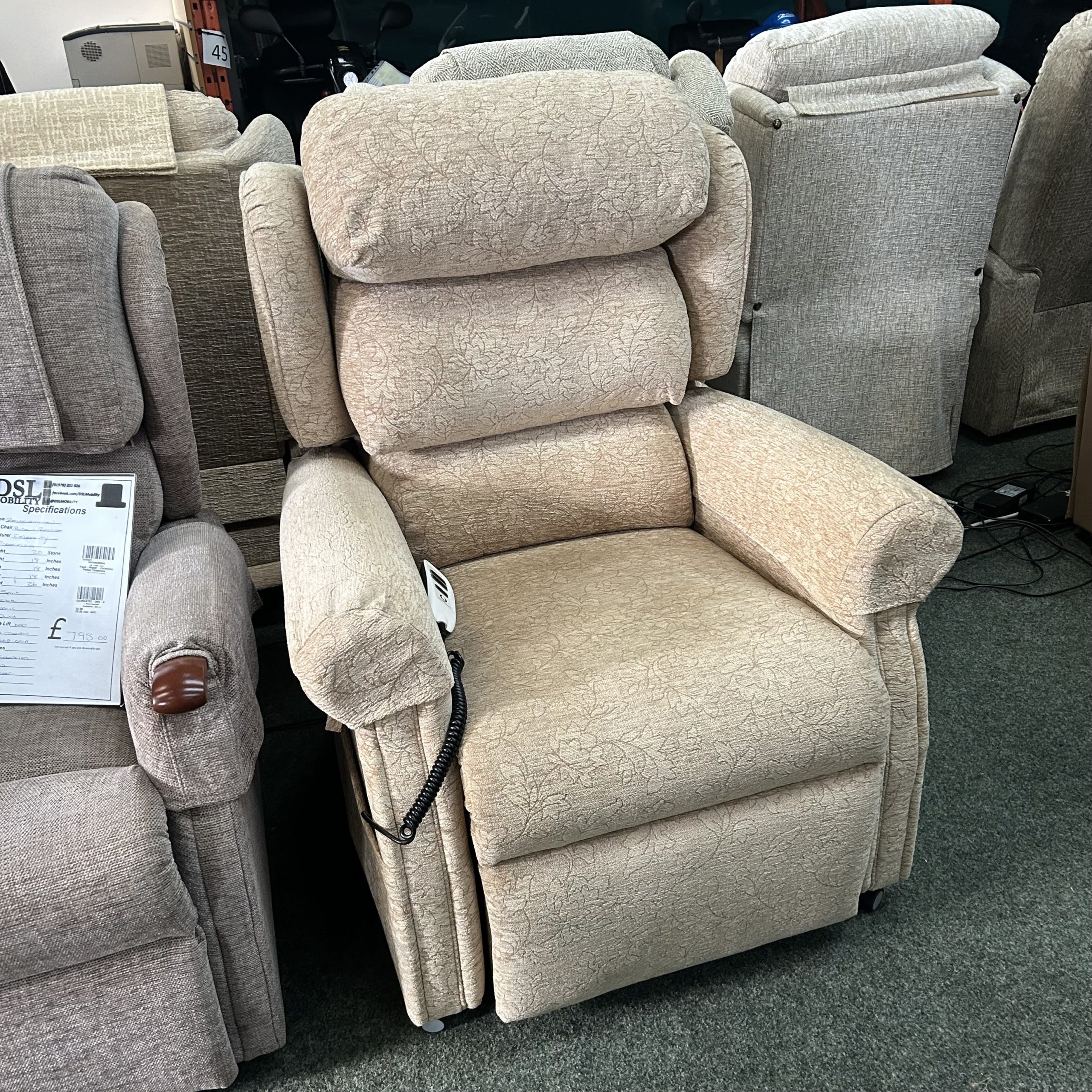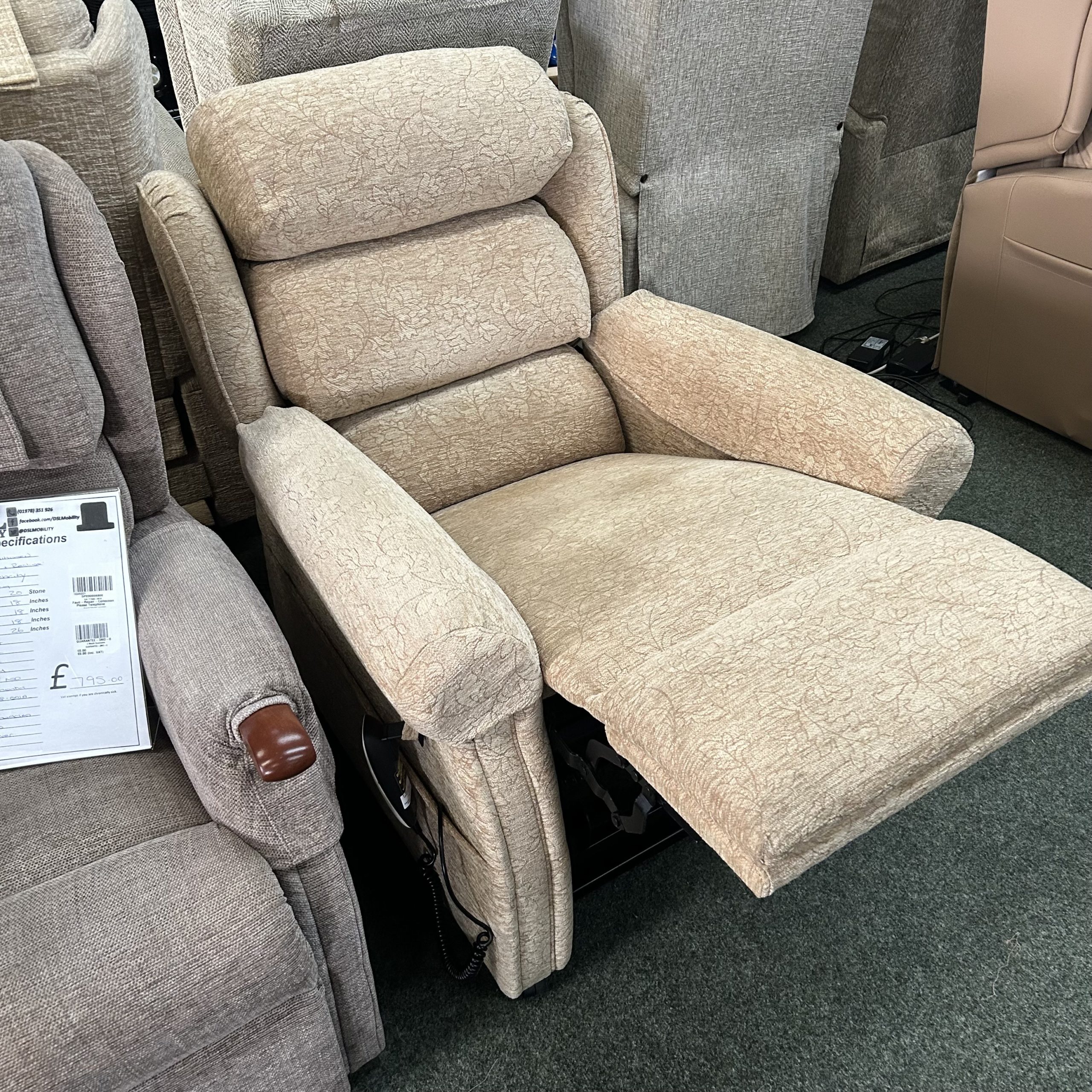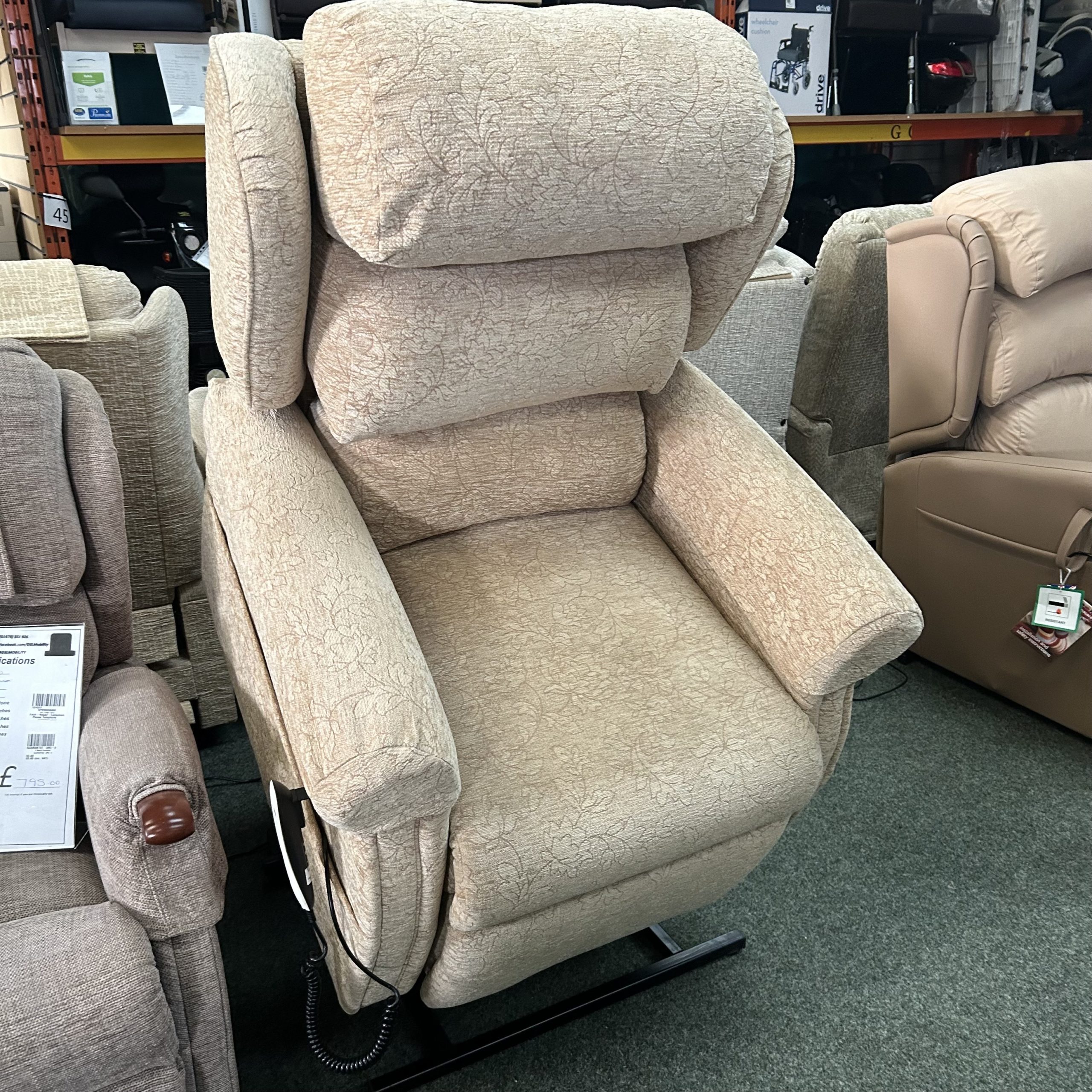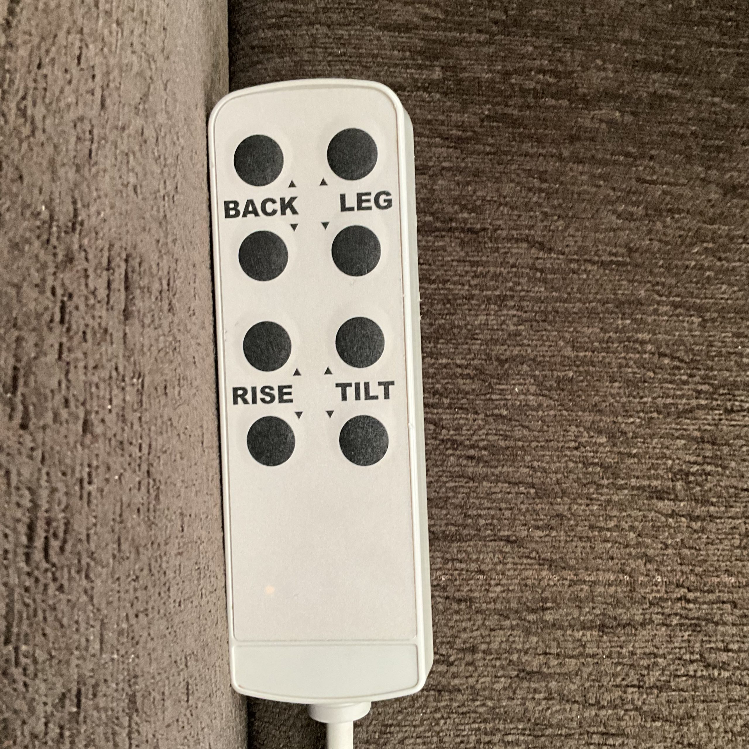 This is a reconditioned DSL Borras rise and recliner chair. The chair has a Waterfall back, and has a BLTR motor: which allows for independent control of the backrest, legrest, tilt, and riser functions. The Chair comes in Boucle mocha fabric.