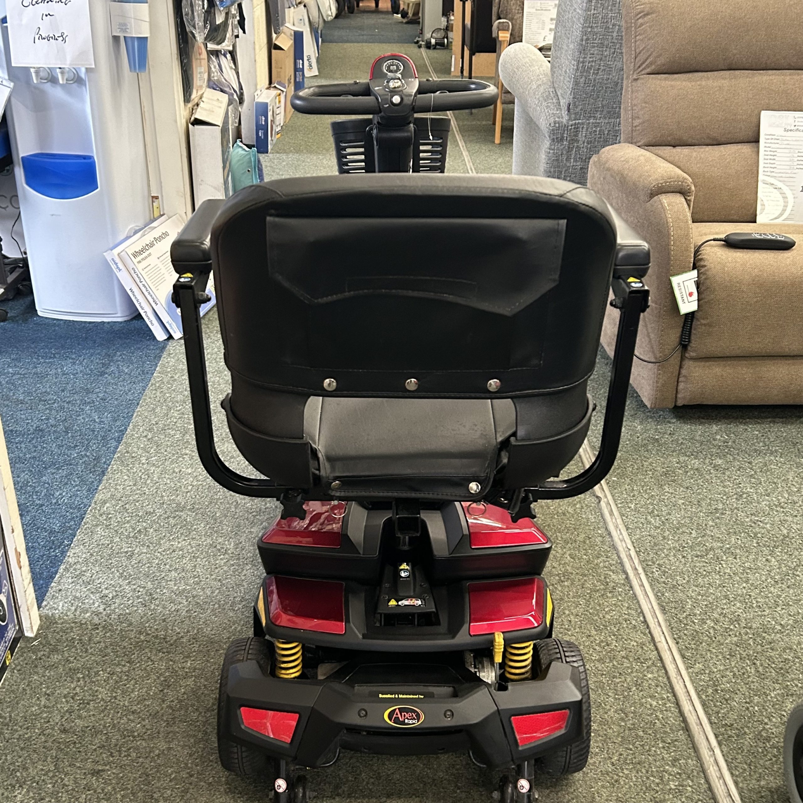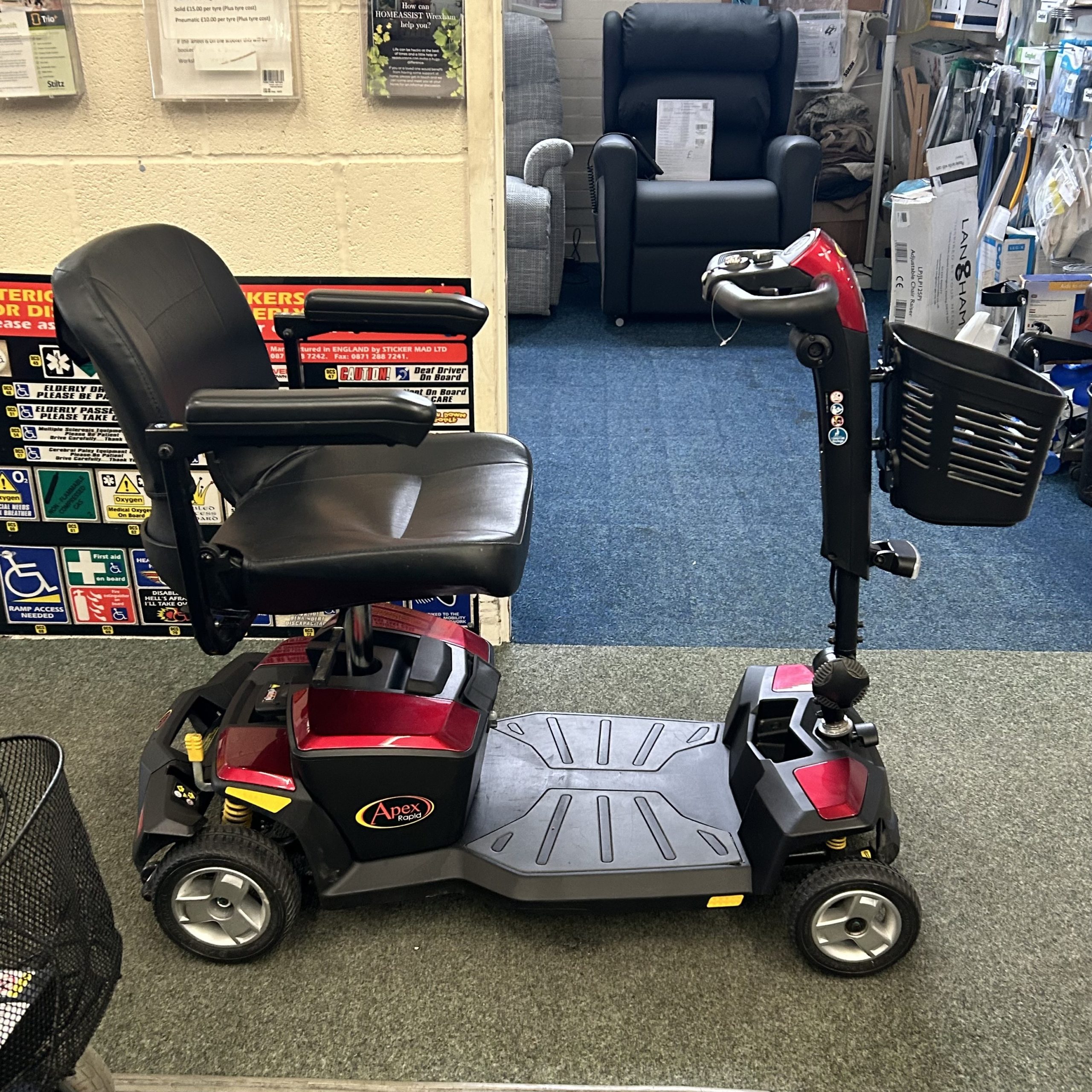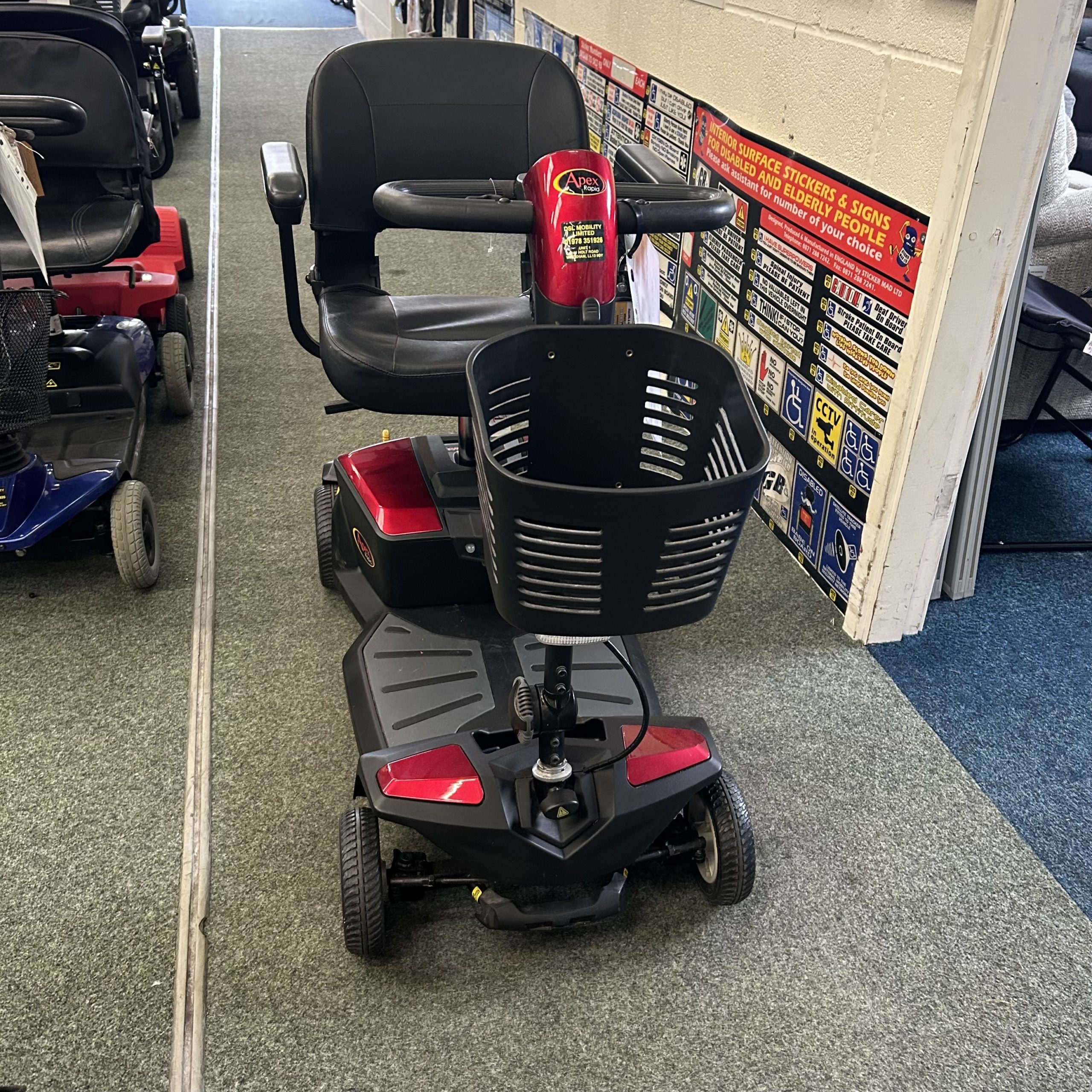 This Pride Apex Rapid is a reconditioned 4mph carboot scooter. The Apex Rapid has been developed to ensure a focus on Comfort, Style, Performance and Reliability. It is fitted with a pair of 22Ah batteries, allowing it to travel up to 15 miles on a single charge (based on a new model). The scooter has a maximum user weight capacity of 21.5 stone.