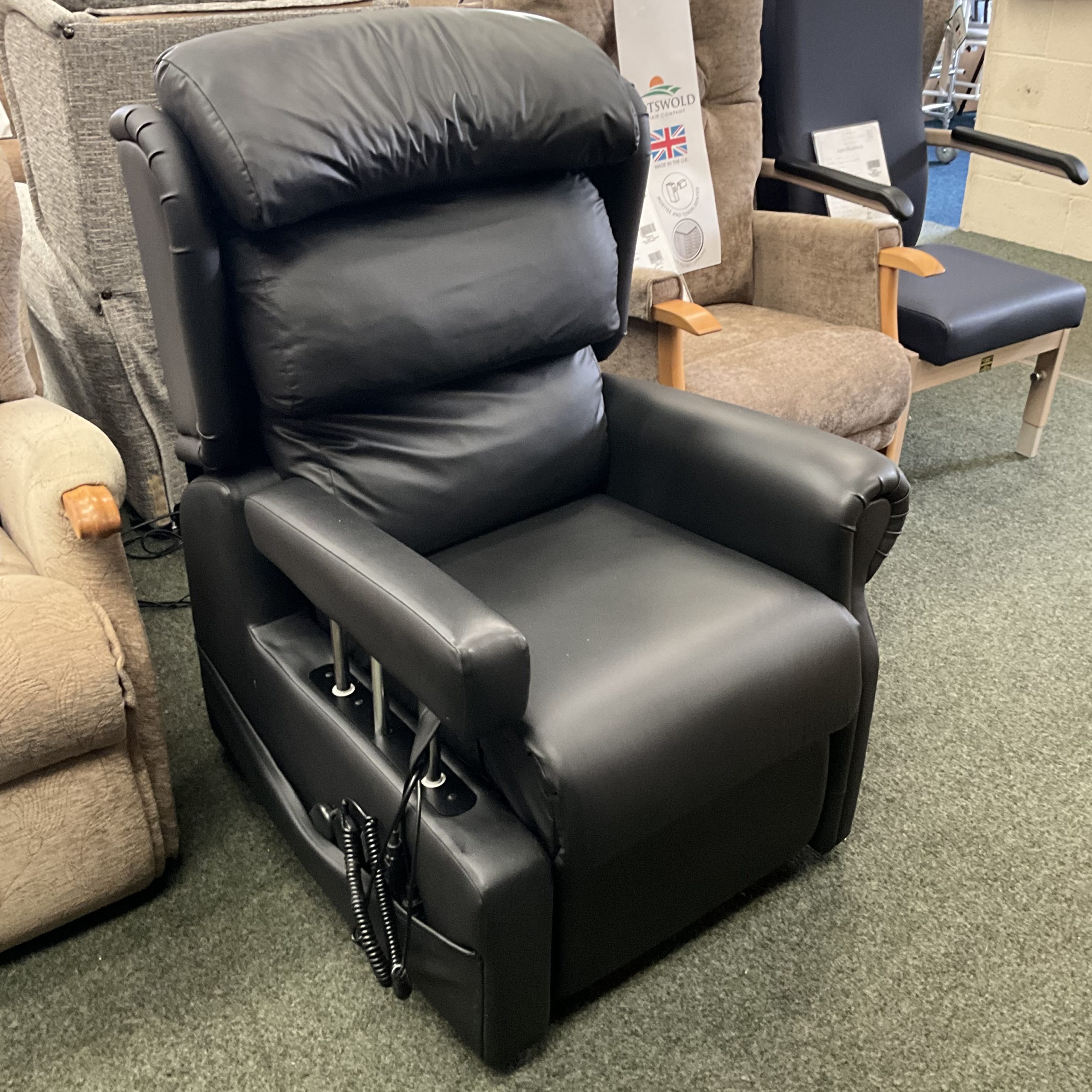 This Primacare Borras is a reconditioned specialist rise and recliner, it is fitted with a double tilt-in-space motor allowing both the feet and back of the chair to be adjusted seperately, for more flexibility in positioning. The tilt-in-space component means that the chair tilts the user as they recline effectively maintaining the angle between the user’s hips and the chair. This allows the user to raise their legs as high as possible and to reduce pressure on the hips during the recline.