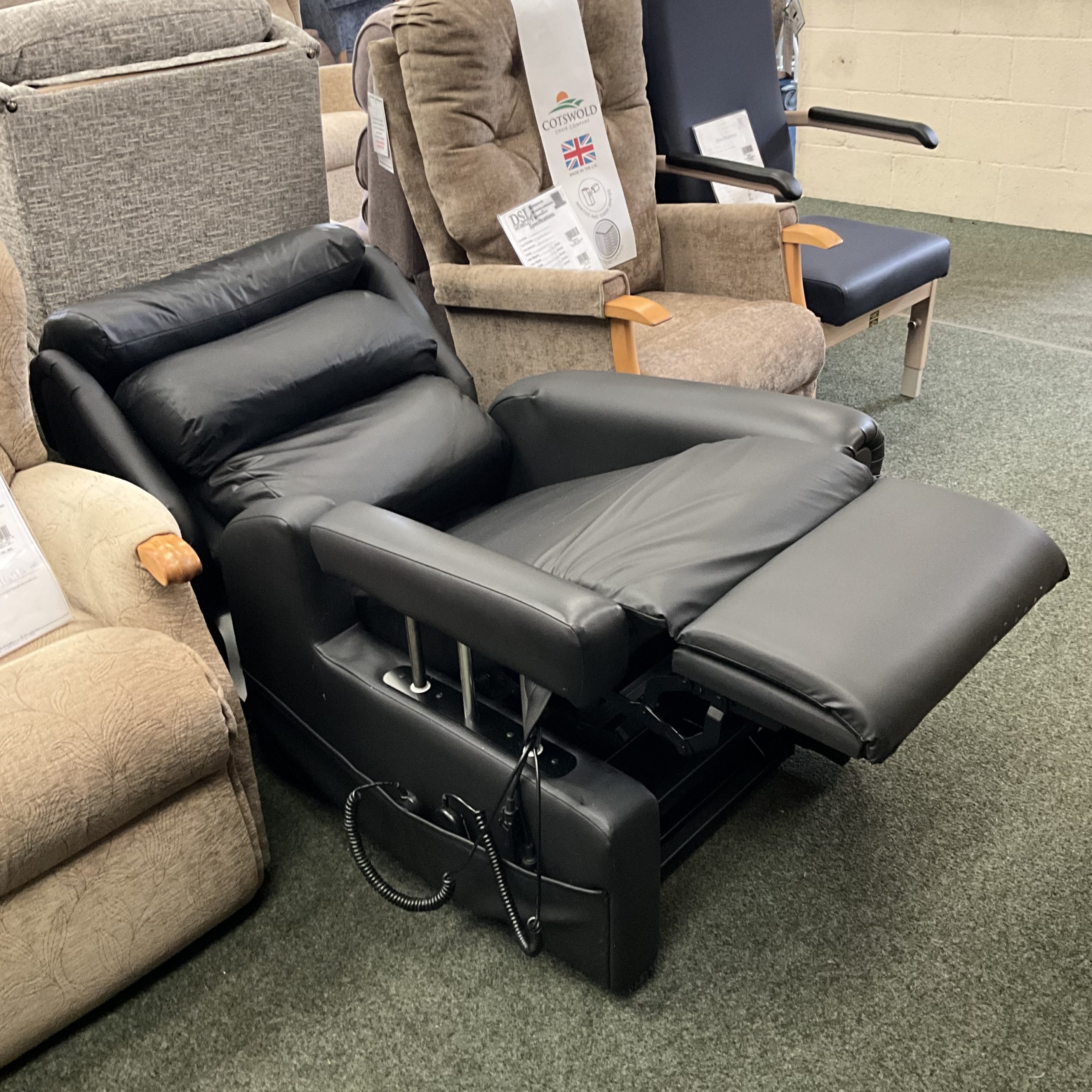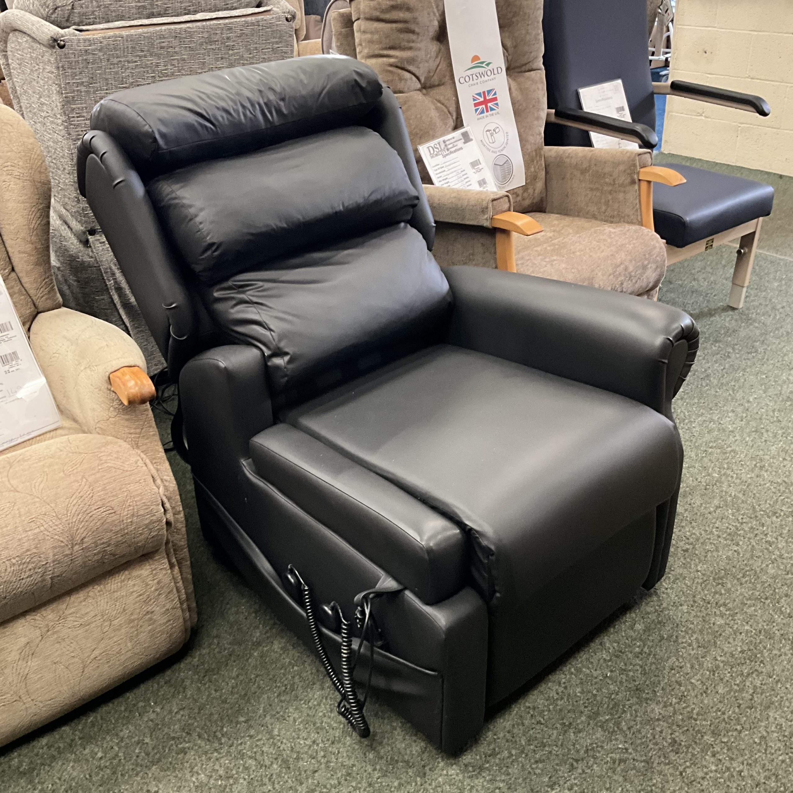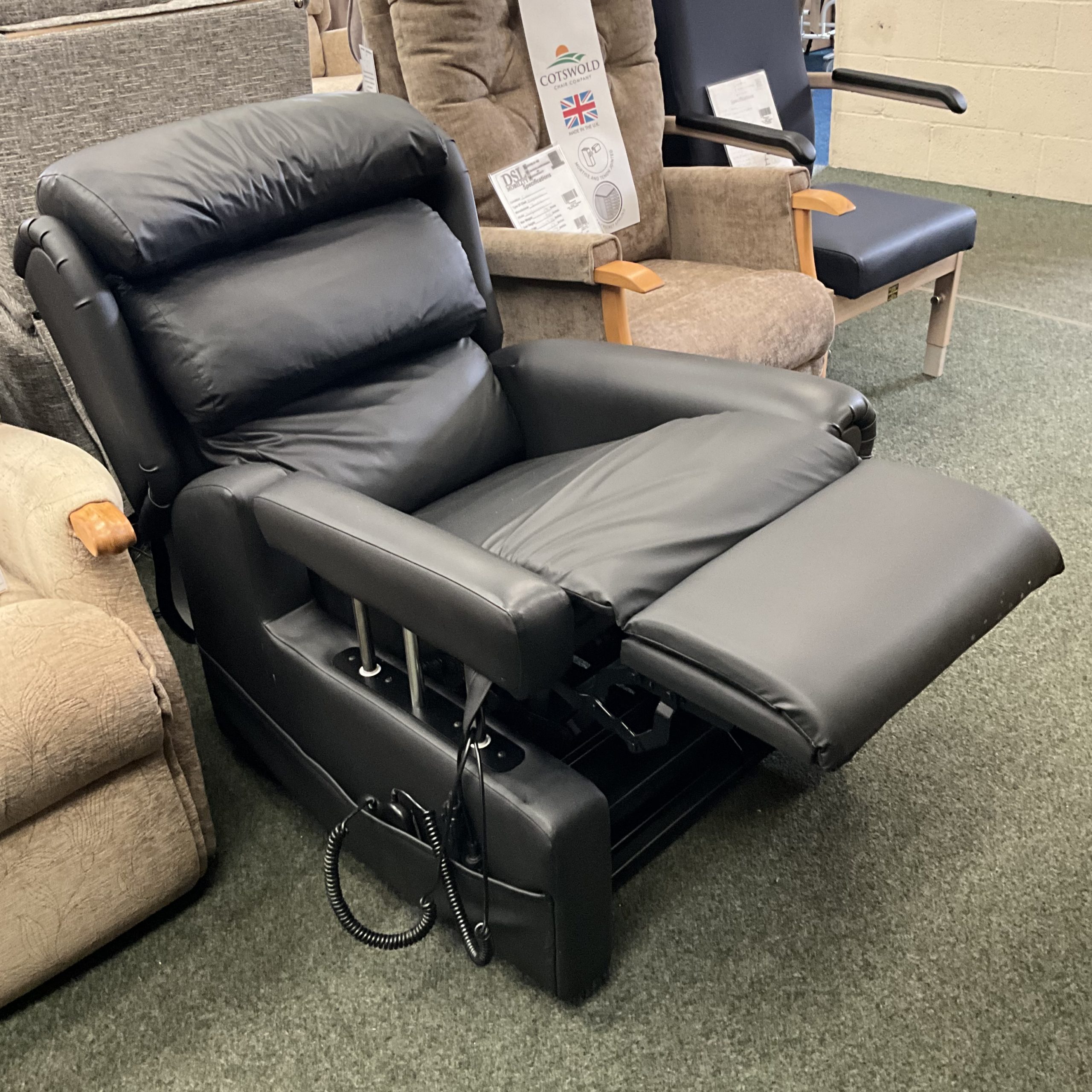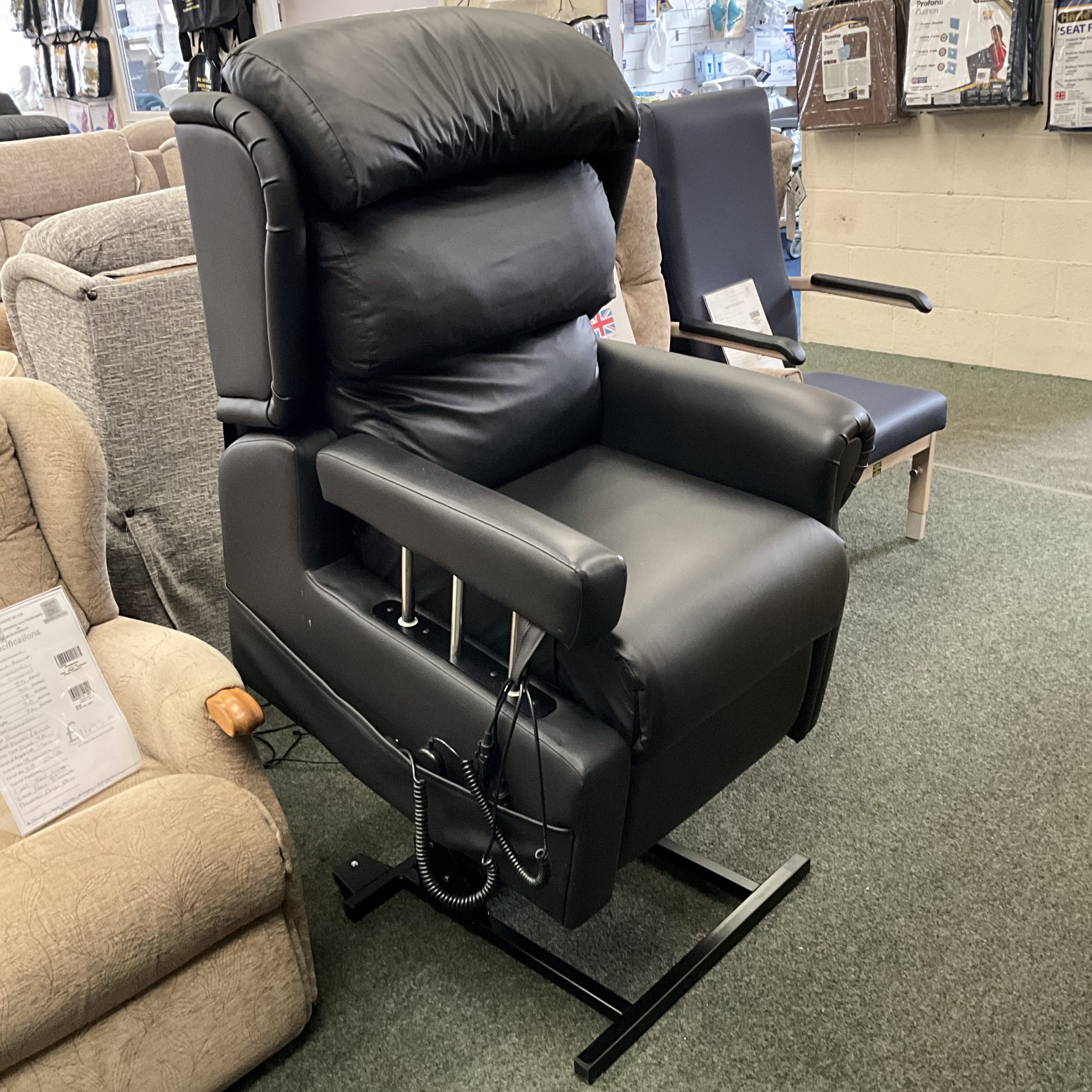 It features a fixed seat wrap, as well as Visco foam – medium pressure covered with black Dartex vinyl material. Uniquely this chair features a powered drop arm, enabling easy entrance and exit from powerchairs.