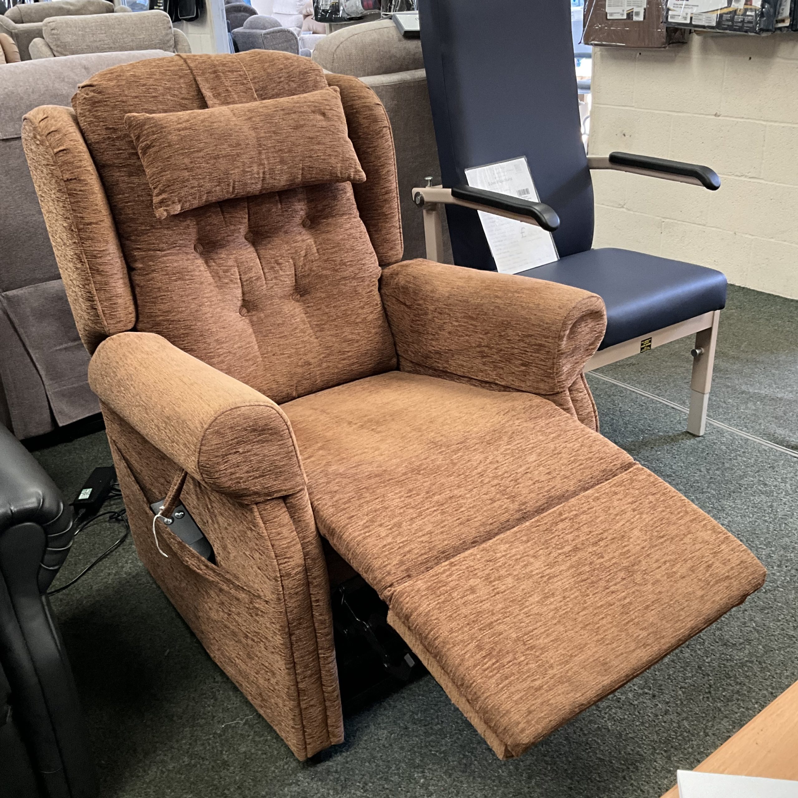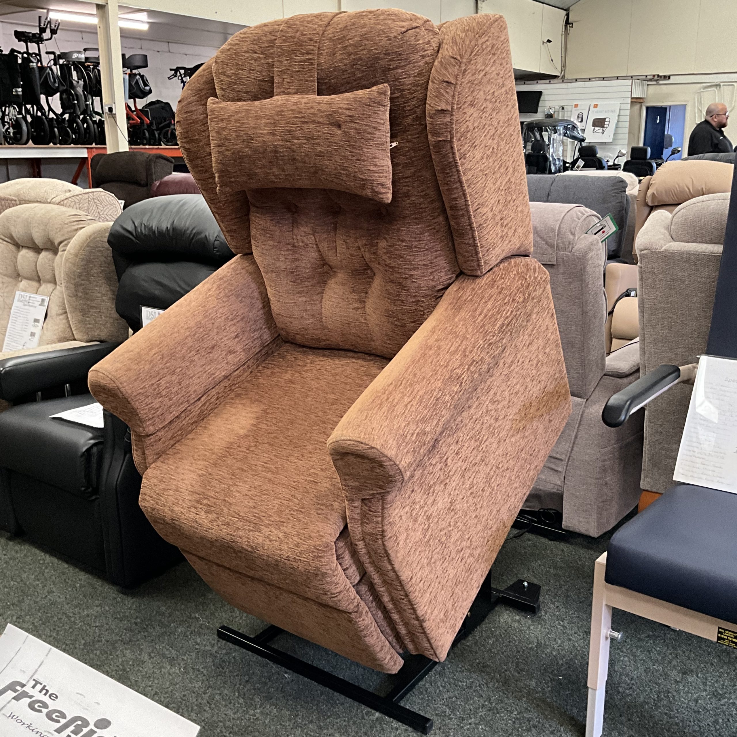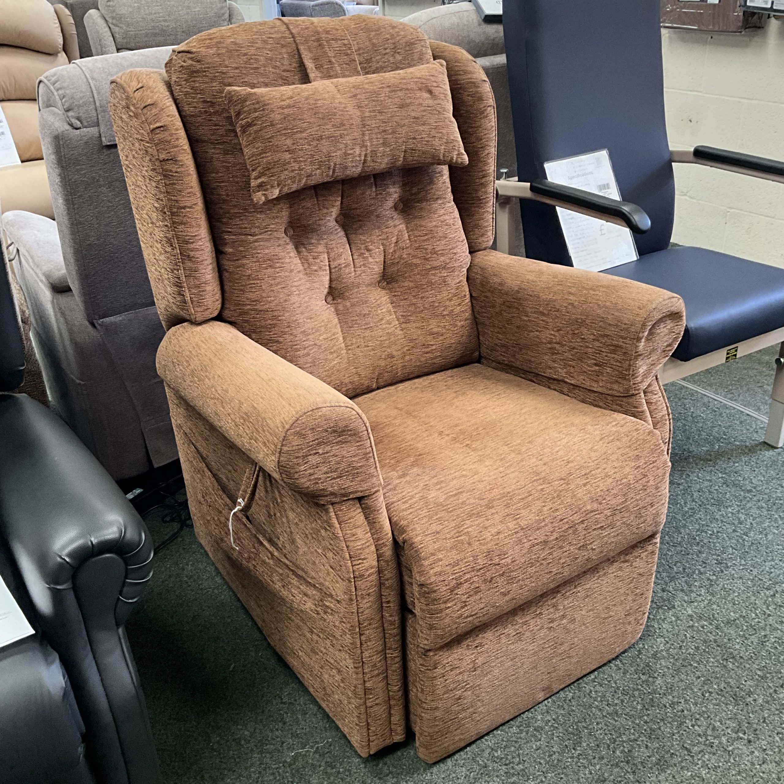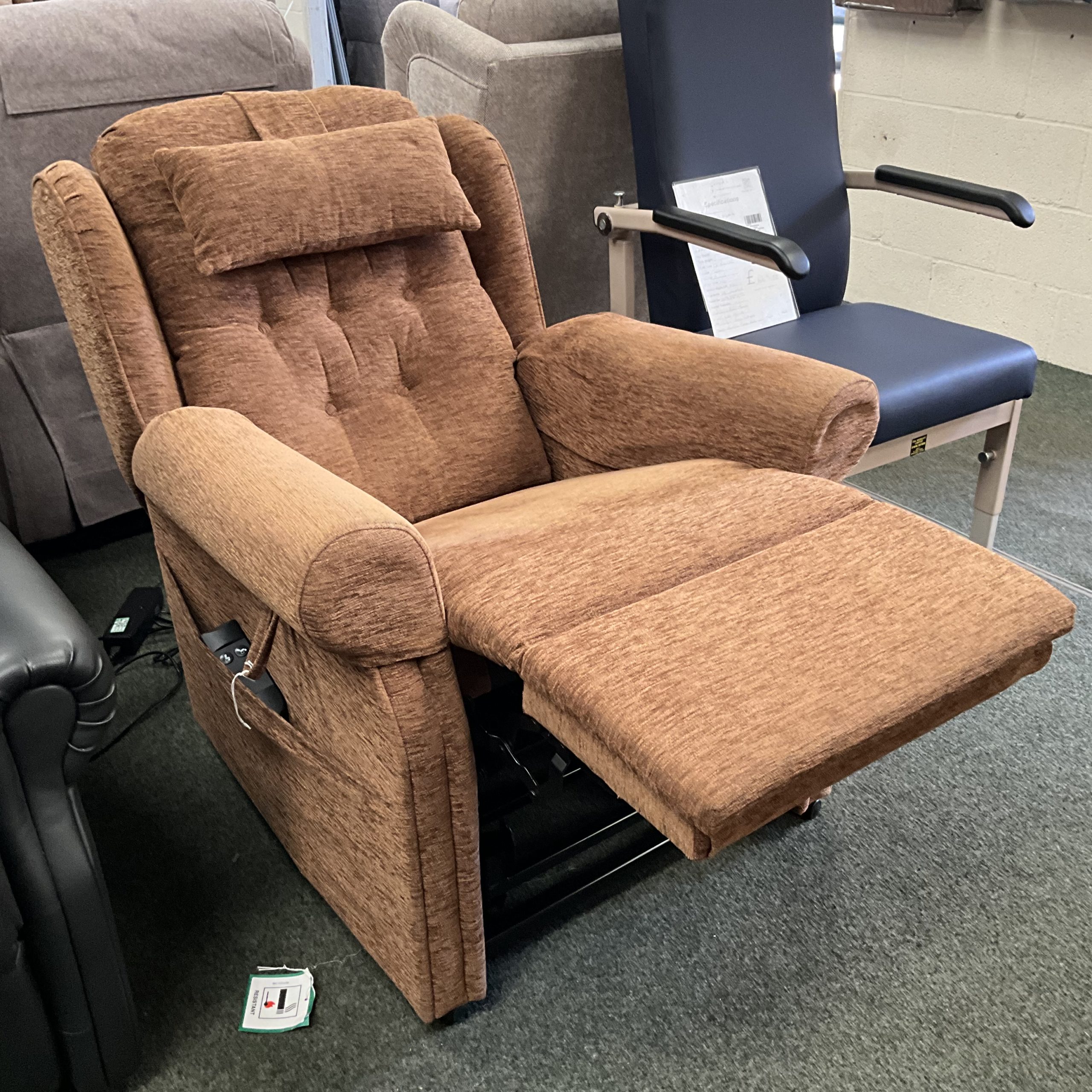 This is a reconditioned Repose Marbella rise and recline chair. The chair has a button back, and has a Single TIS Motor: This motion allows the back and feet o to be adjusted in a single, synchronized motion, allowing the user to raise their feet above their hips without entering a fully reclined position. The Chair comes in Cinnamon fabric featuring matching arm caps and head cushion.
