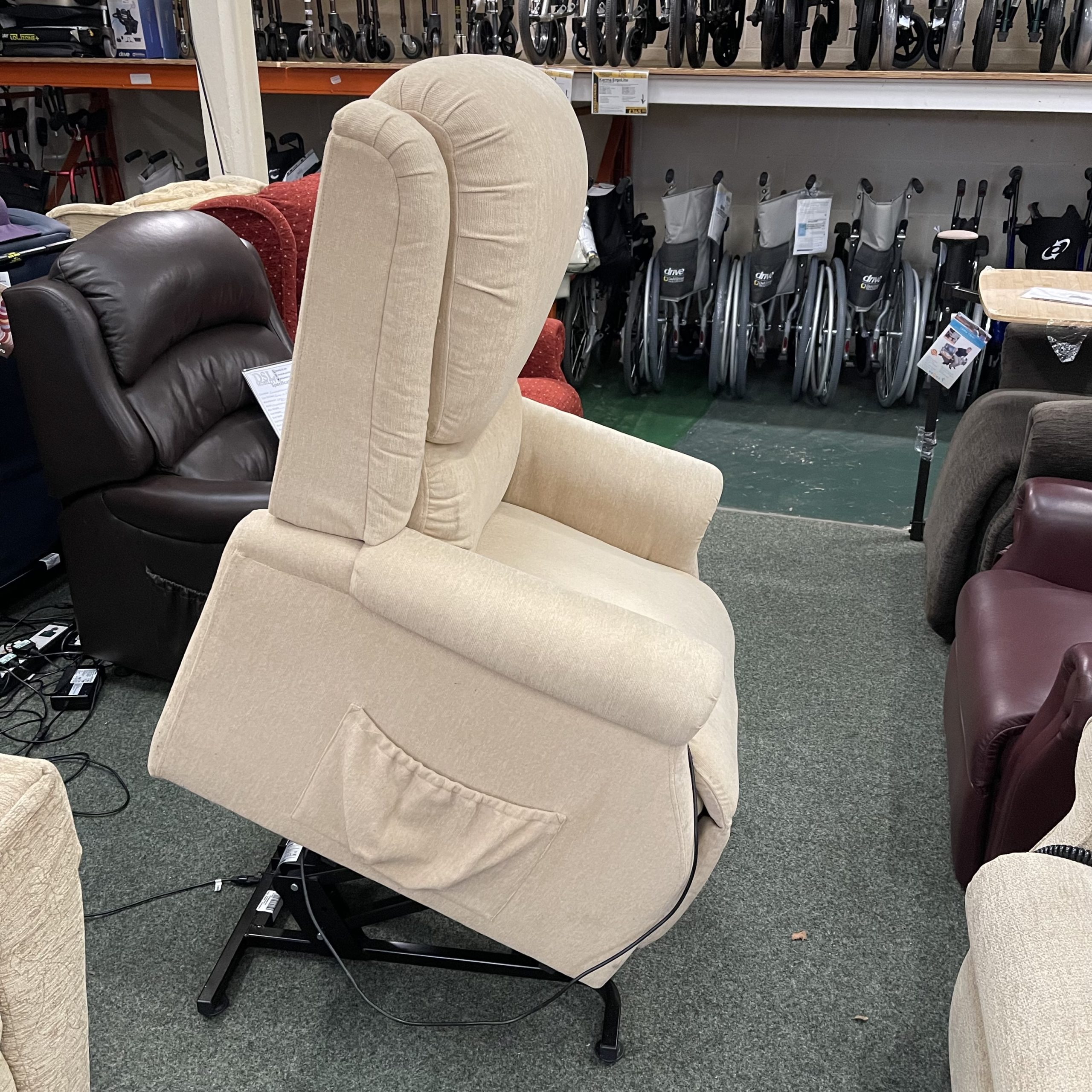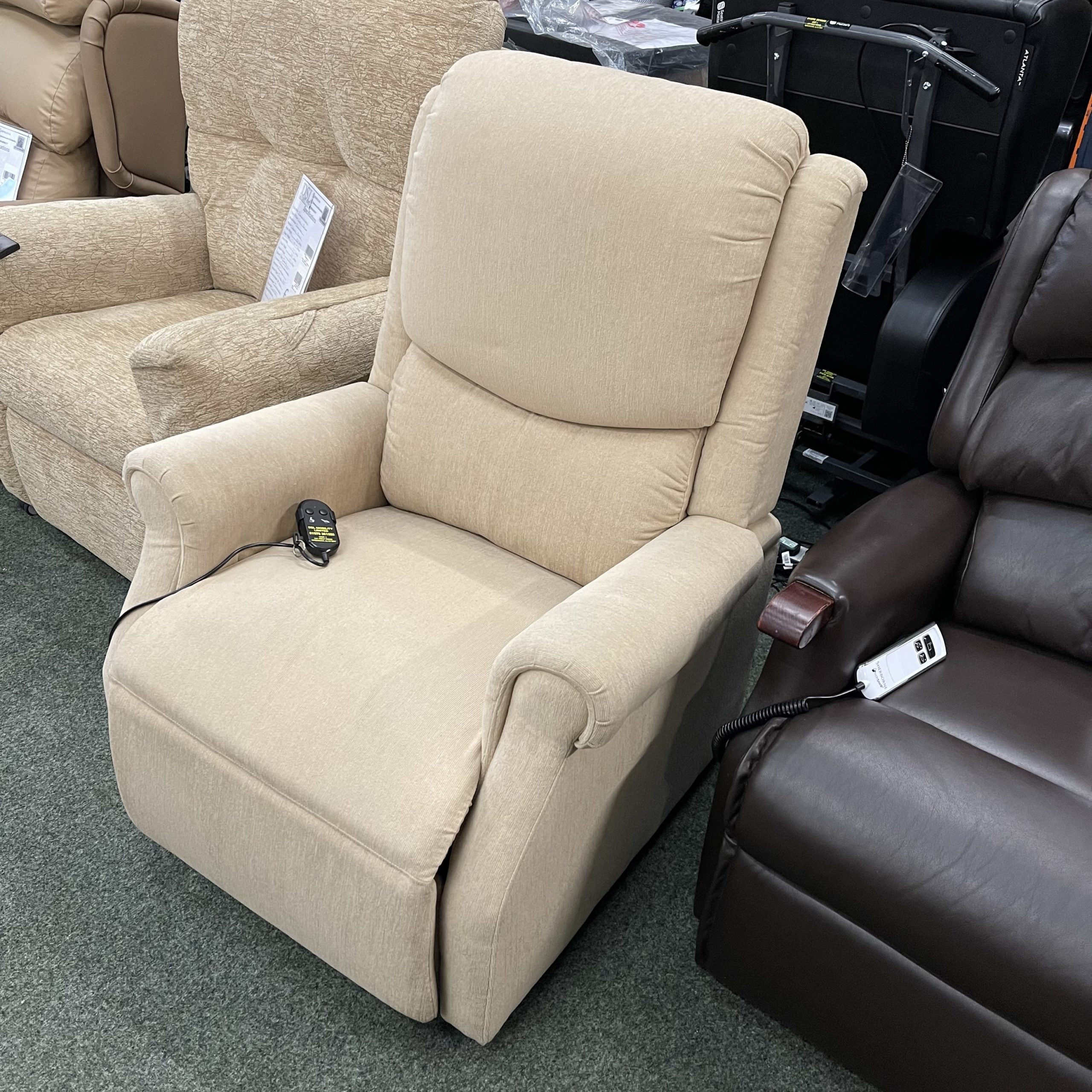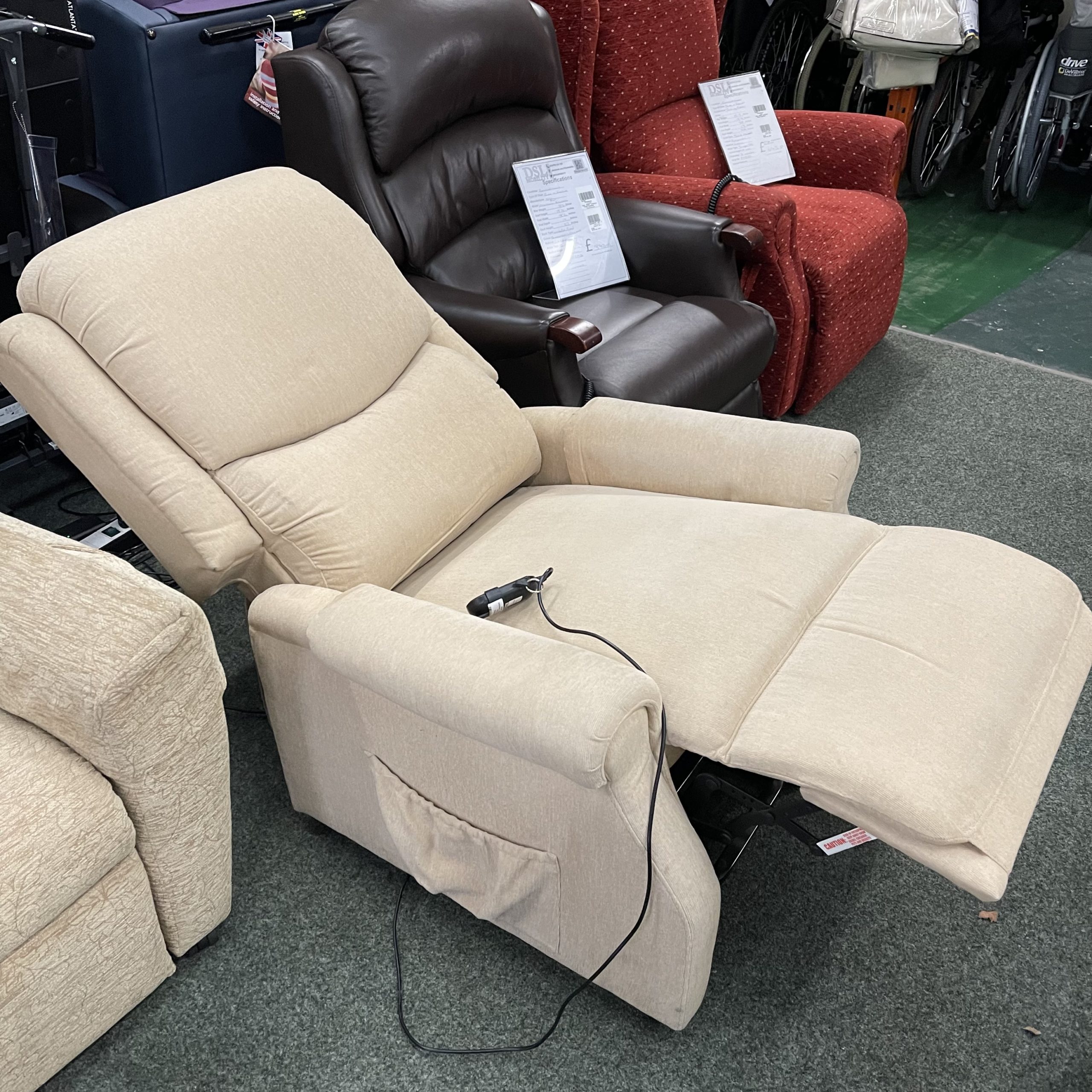 This is a reconditioned Restwell CLR29CB15 rise and recliner chair. The chair has a split back, and has a Single Motor: One motor activates a distinct lift, rest and recline action. This motion is a single motor recliner that comes with a simple to operate two-button handset and a safety key, built into the hand controller. The chair comes in a Sand fabric.