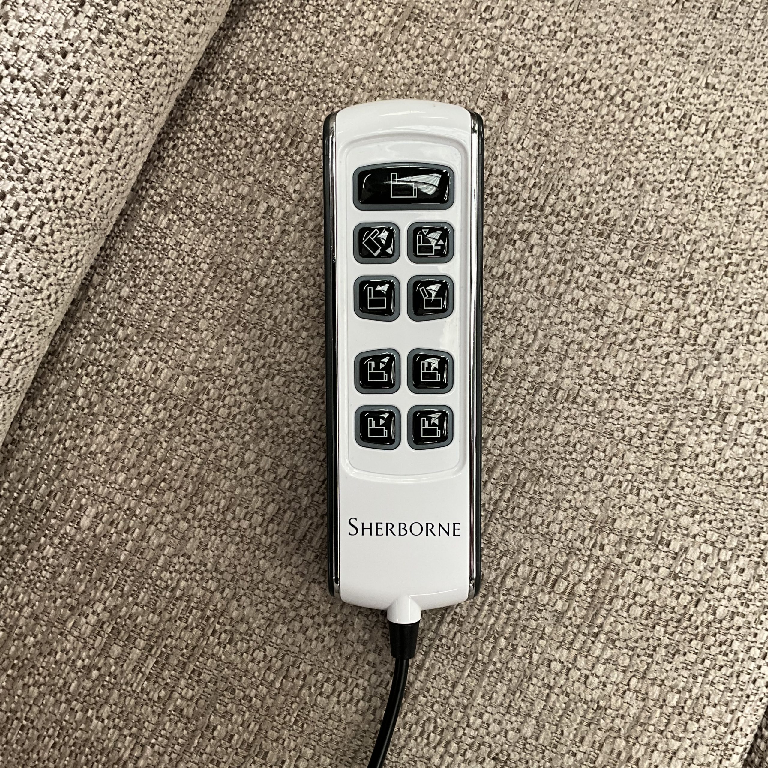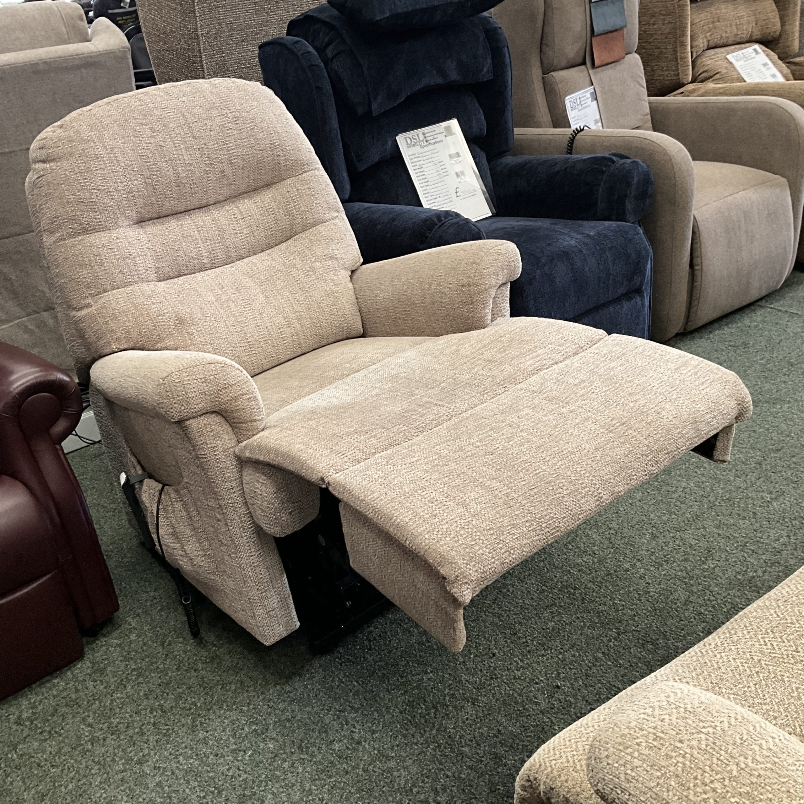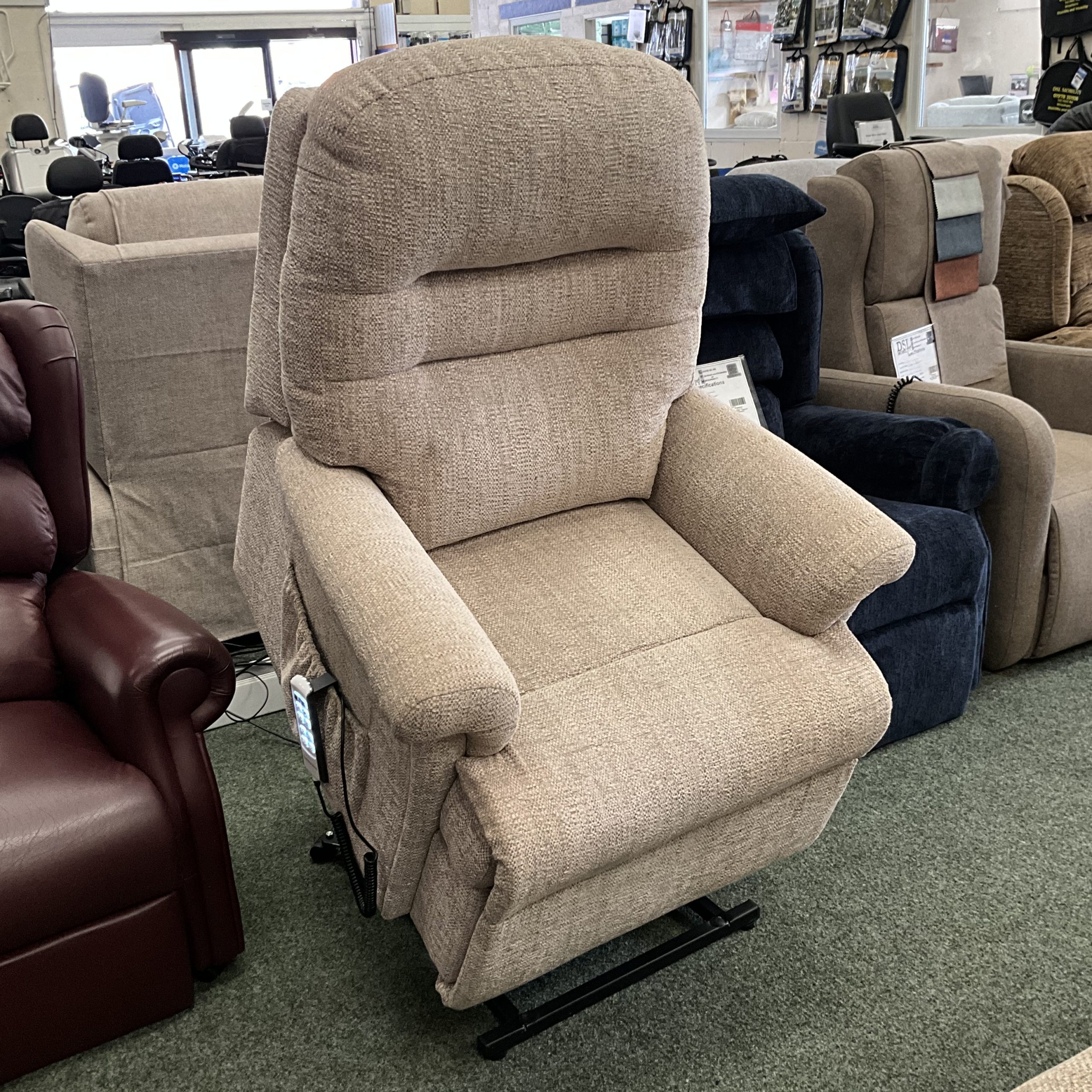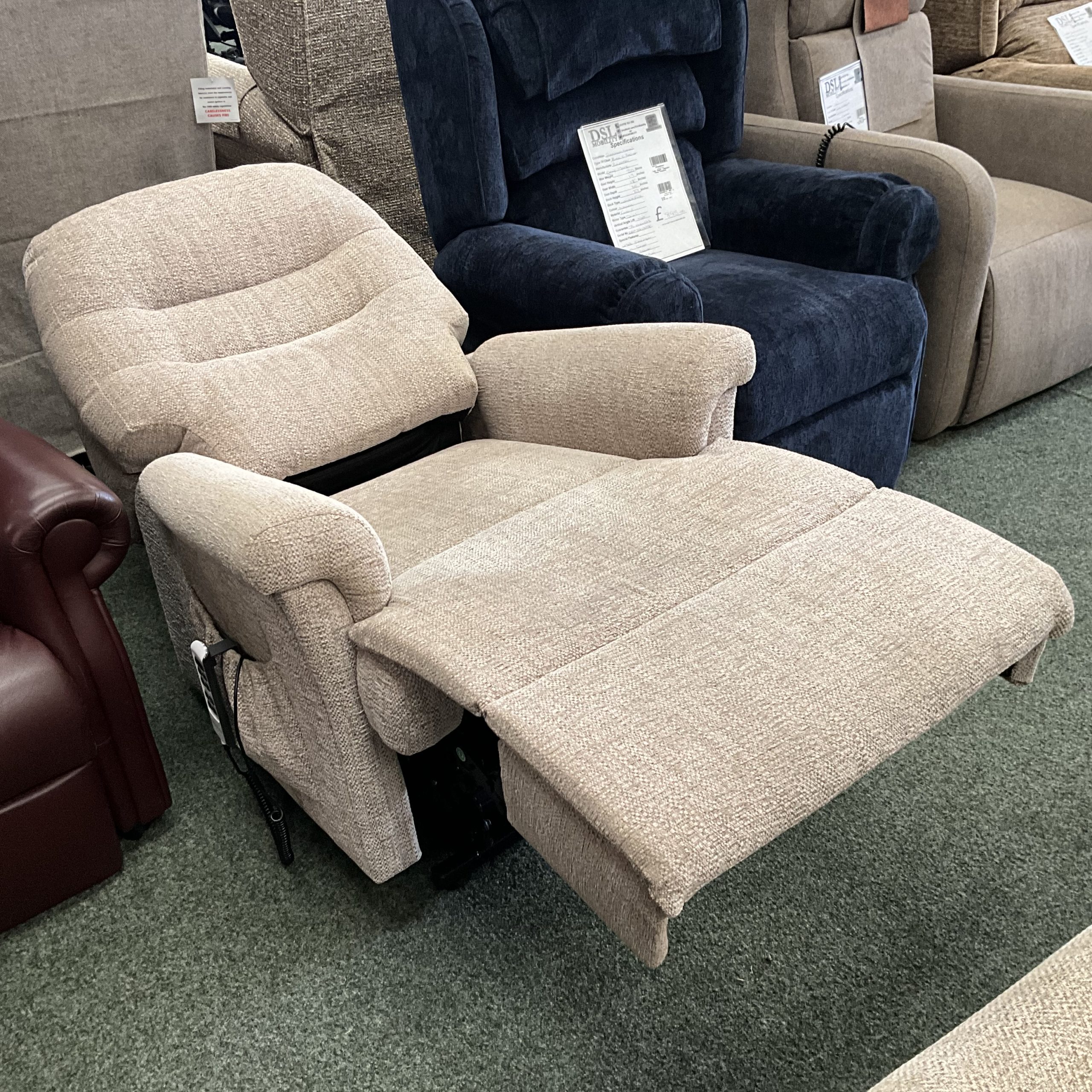 This is a reconditioned Sherborne Beaumont Petite Rise and Recliner. The chair has a letterbox back, and has a Dual Motor: This allows the back and feet of the chair to be adjusted independently of one another, in two separate motions, allowing the user to choose from a much wider range of positions. The chair comes in a Como beige fabric. This chair also comes with special features of powered lumbar and powered headrest for even more positions.