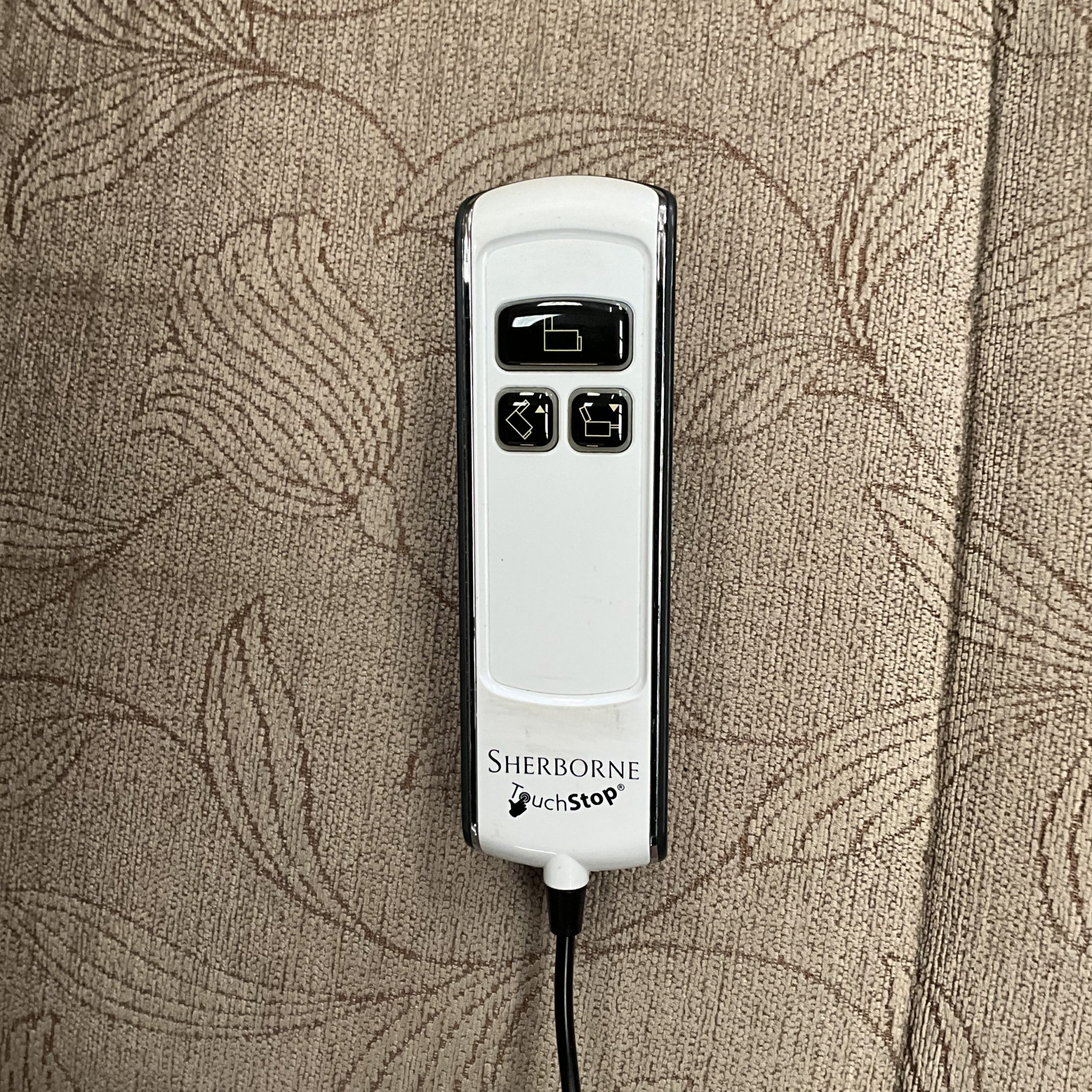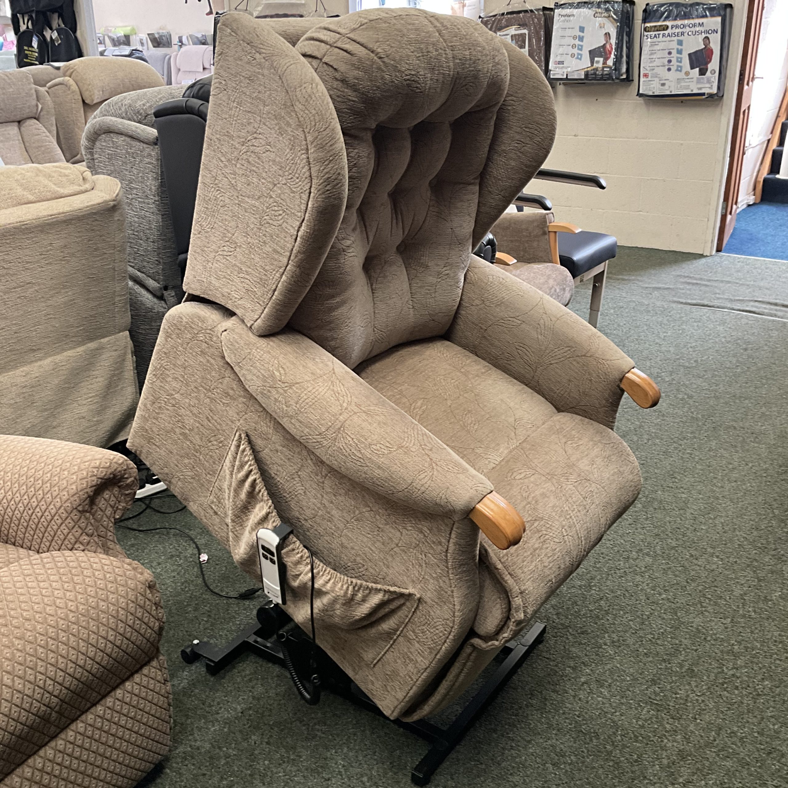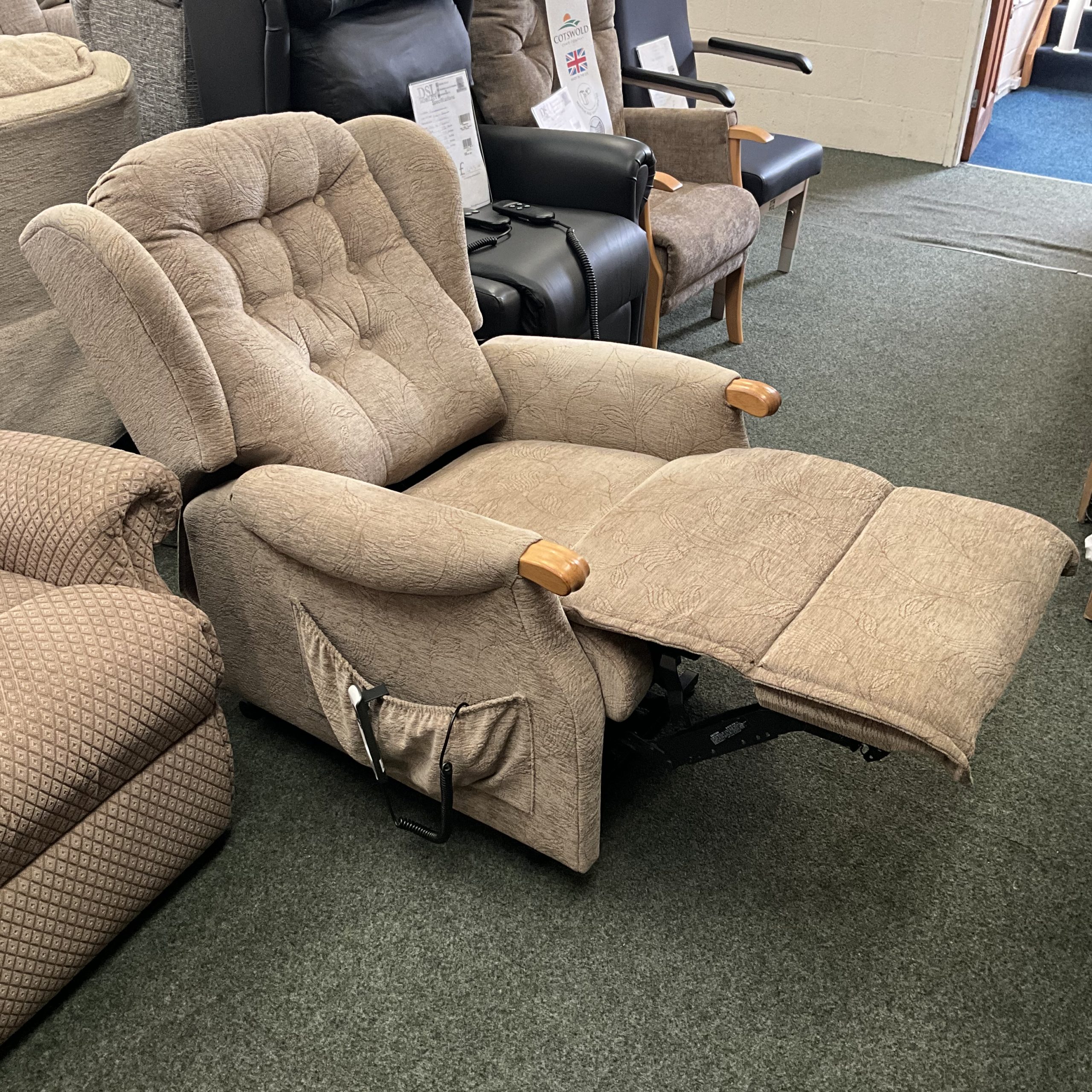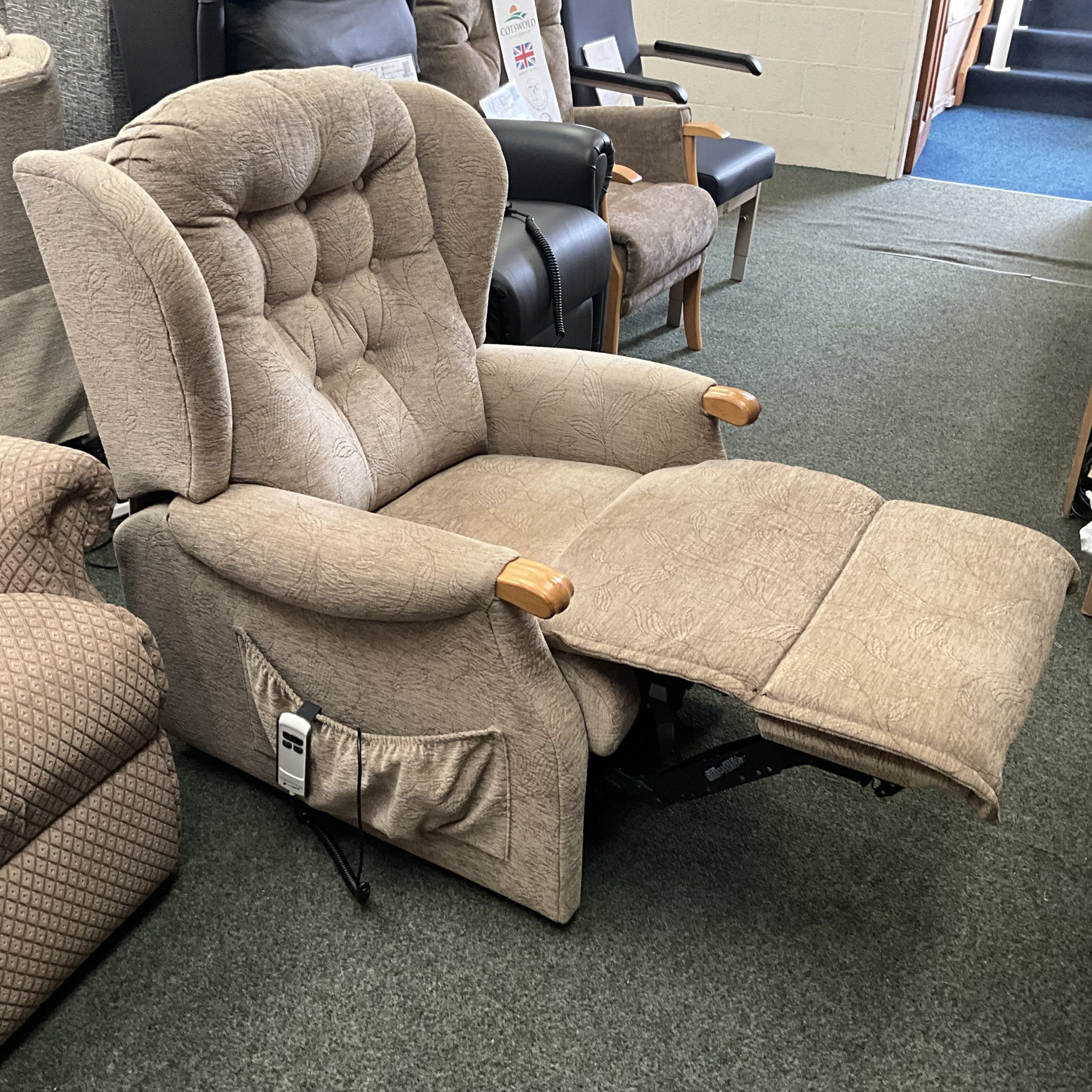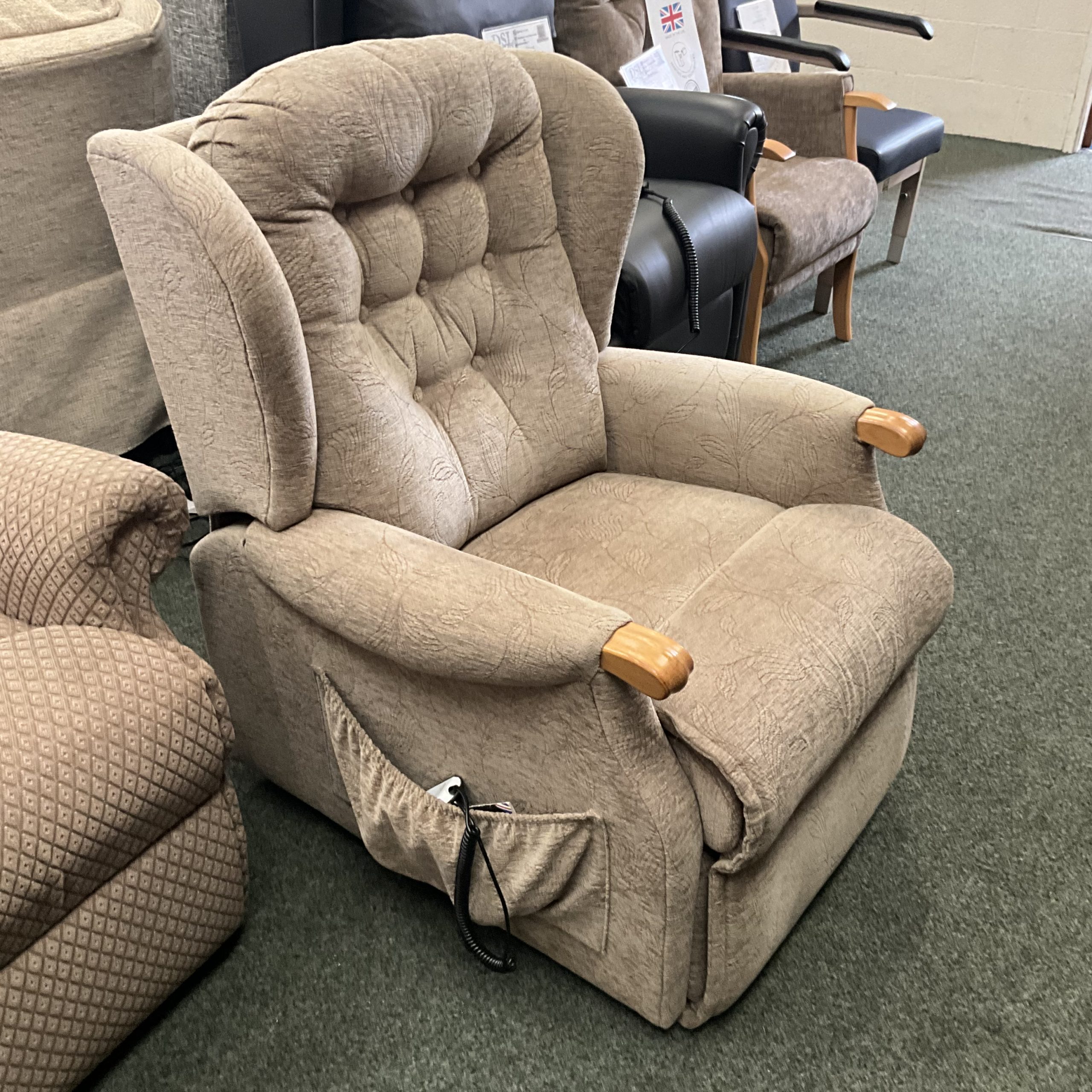 This is a reconditioned Sherborne Lynton Knuckle rise and recline chair. The chair has a button back, and has a Single Motor: which is a conventional recliner action where the angle between back and seat increases as the chair reclines. The Chair comes in a Madrid Nutmeg fabric, and with light knuckles.