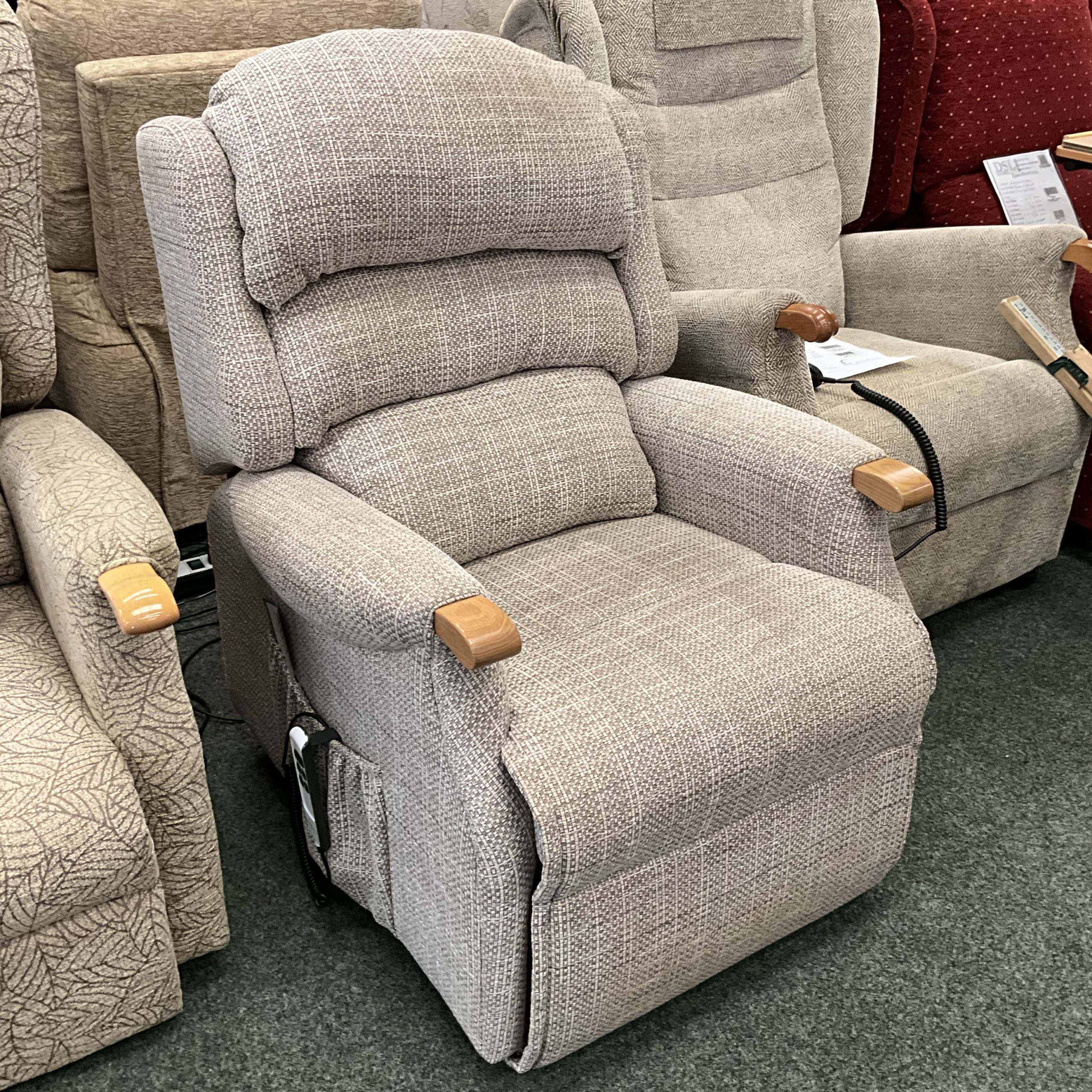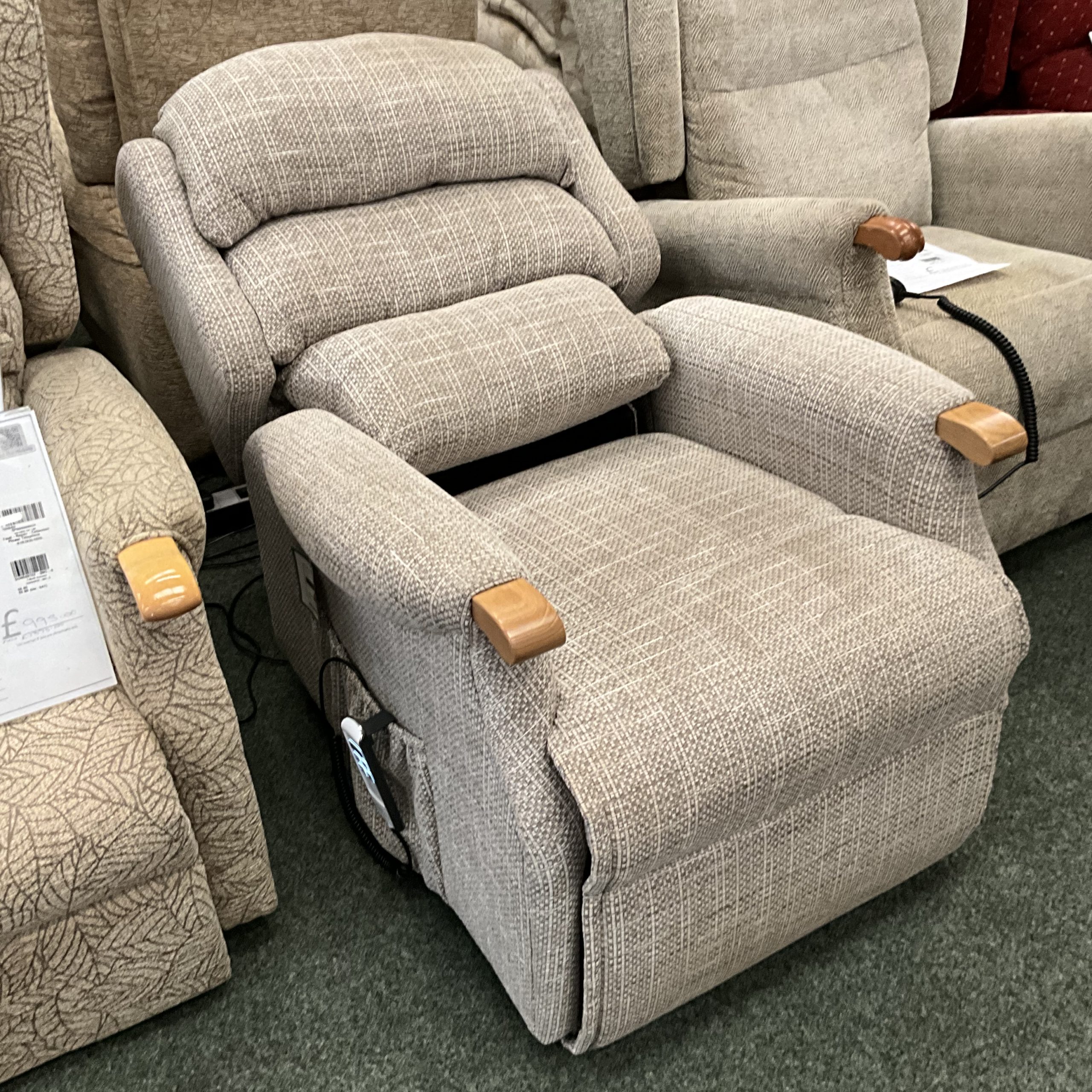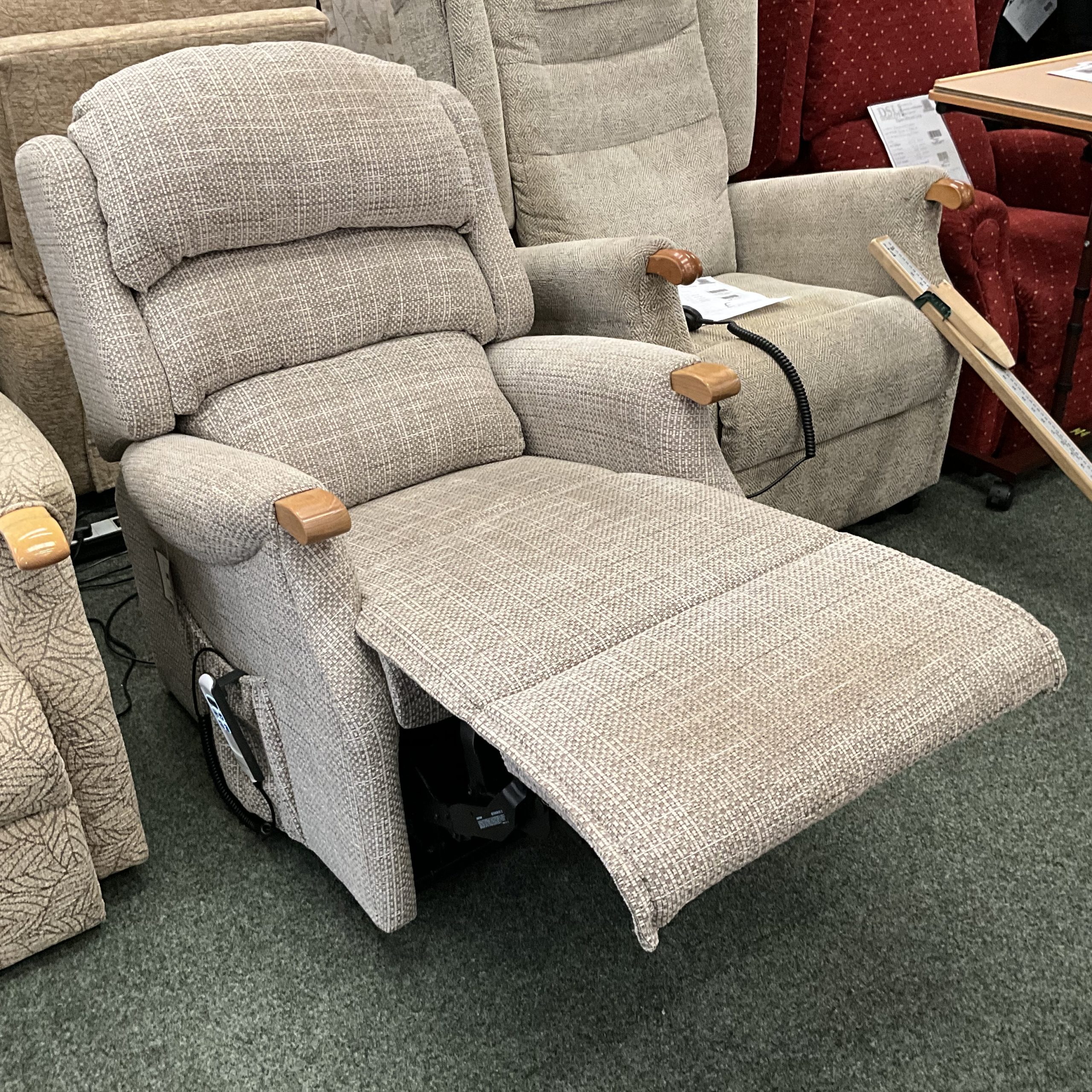 This is a reconditioned Sherborne Malham Small rise and recline chair. The chair has a waterfall back, and has a Dual Motor: This motion allows the back and feet of the chair to be adjusted independently of one another, in two separate motions, allowing the user to choose from a much wider range of positions. The Chair comes in Ravello Beige fabric, and with light knuckles.