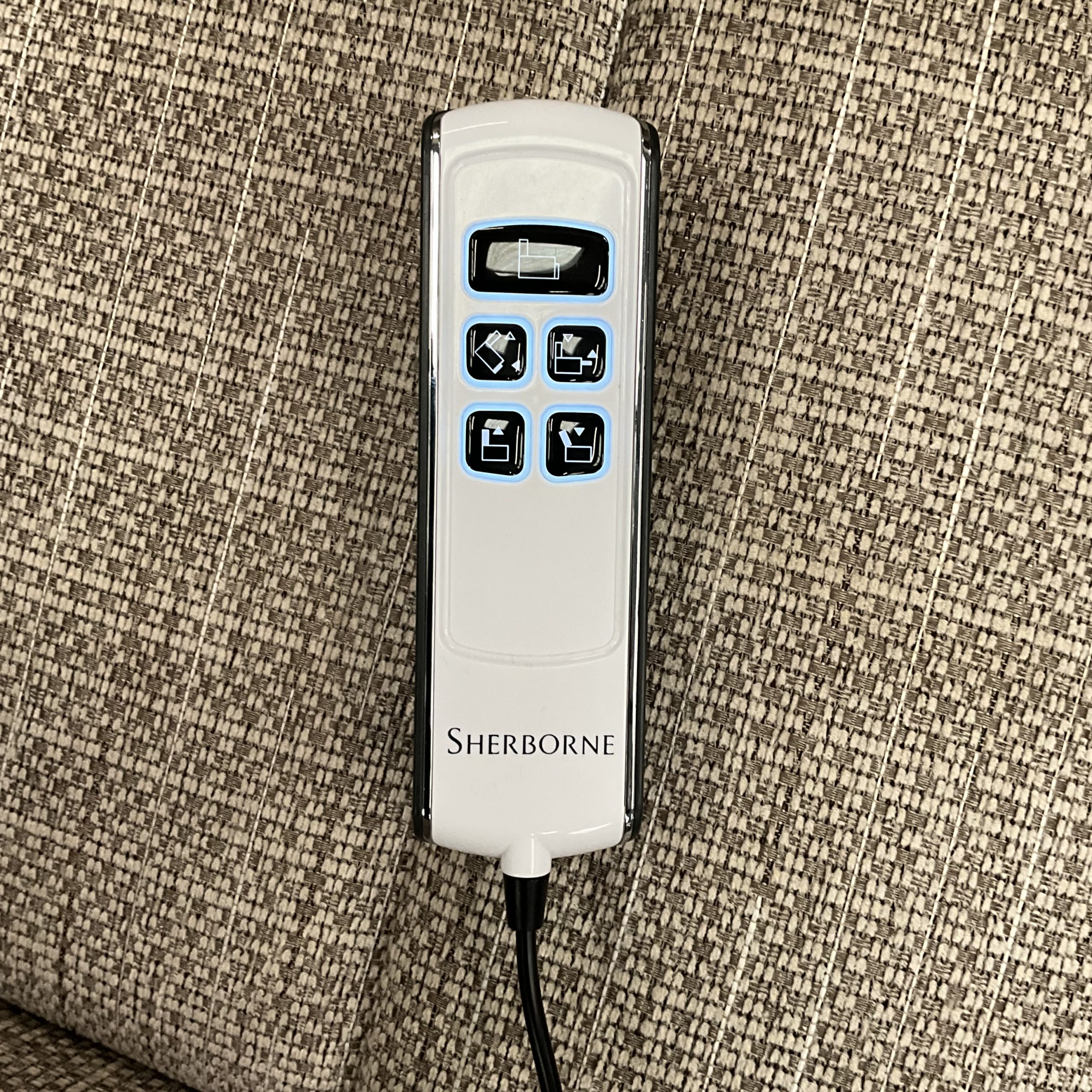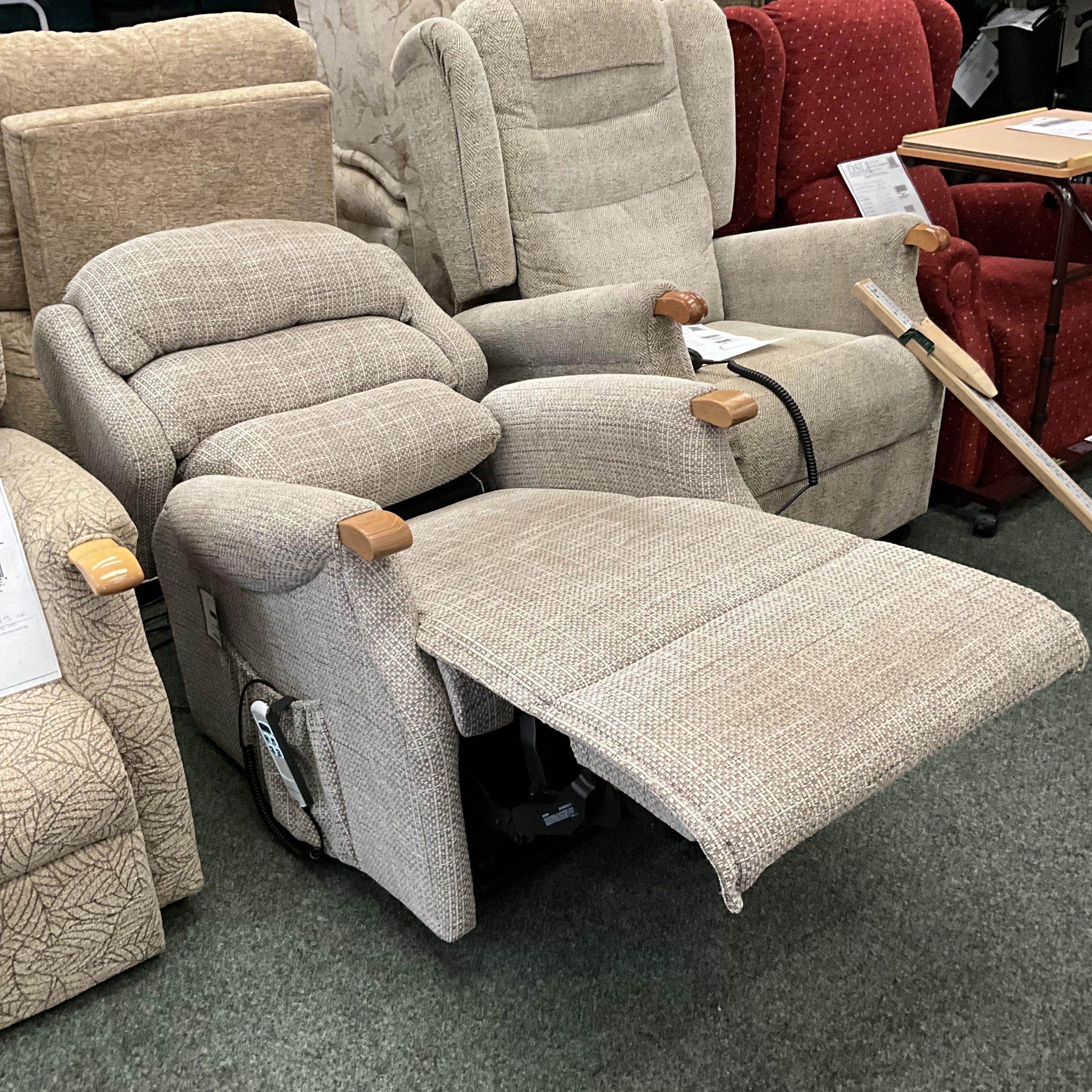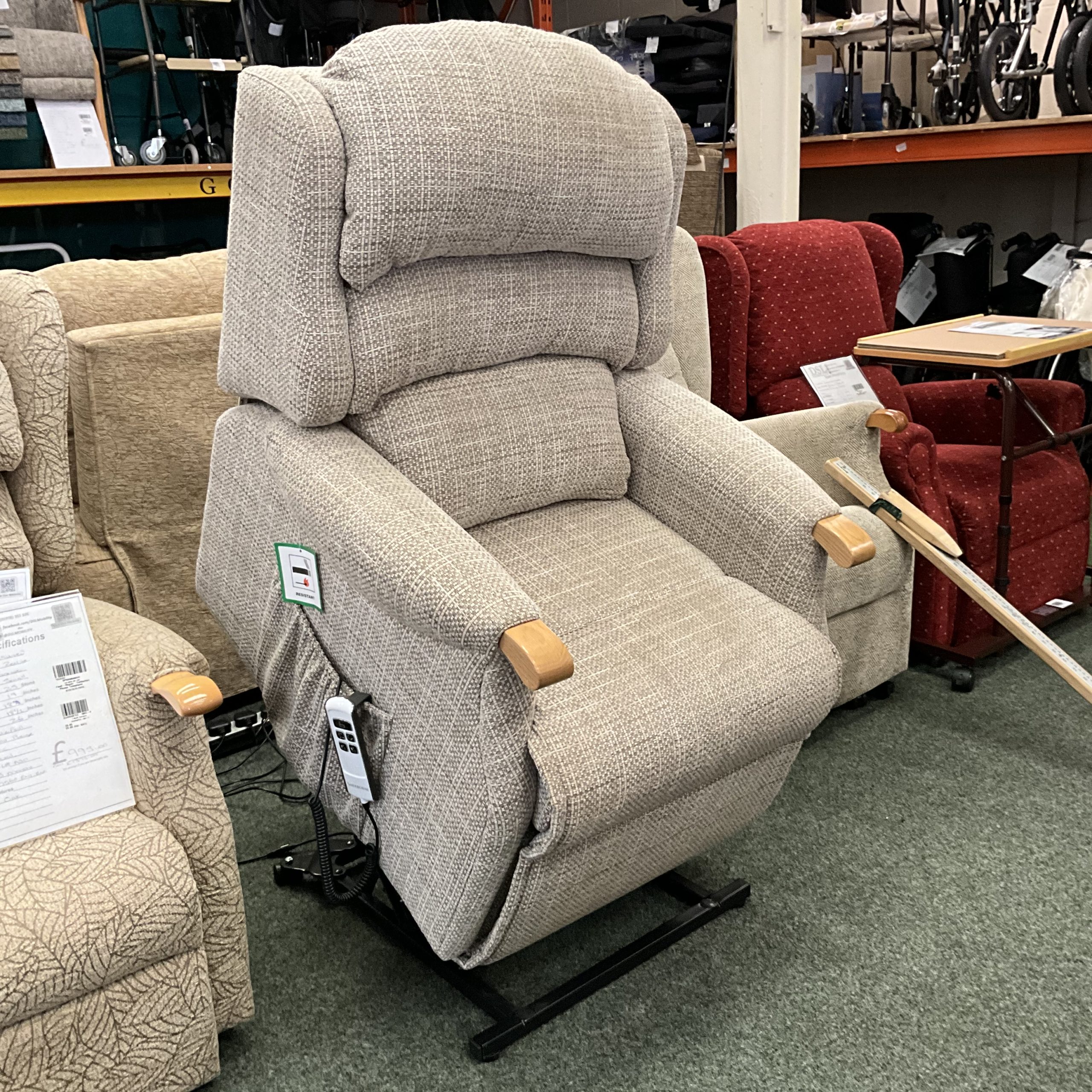 This is a reconditioned Sherborne Malham Small rise and recline chair. The chair has a waterfall back, and has a Dual Motor: This motion allows the back and feet of the chair to be adjusted independently of one another, in two separate motions, allowing the user to choose from a much wider range of positions. The Chair comes in Ravello Beige fabric, and with light knuckles.