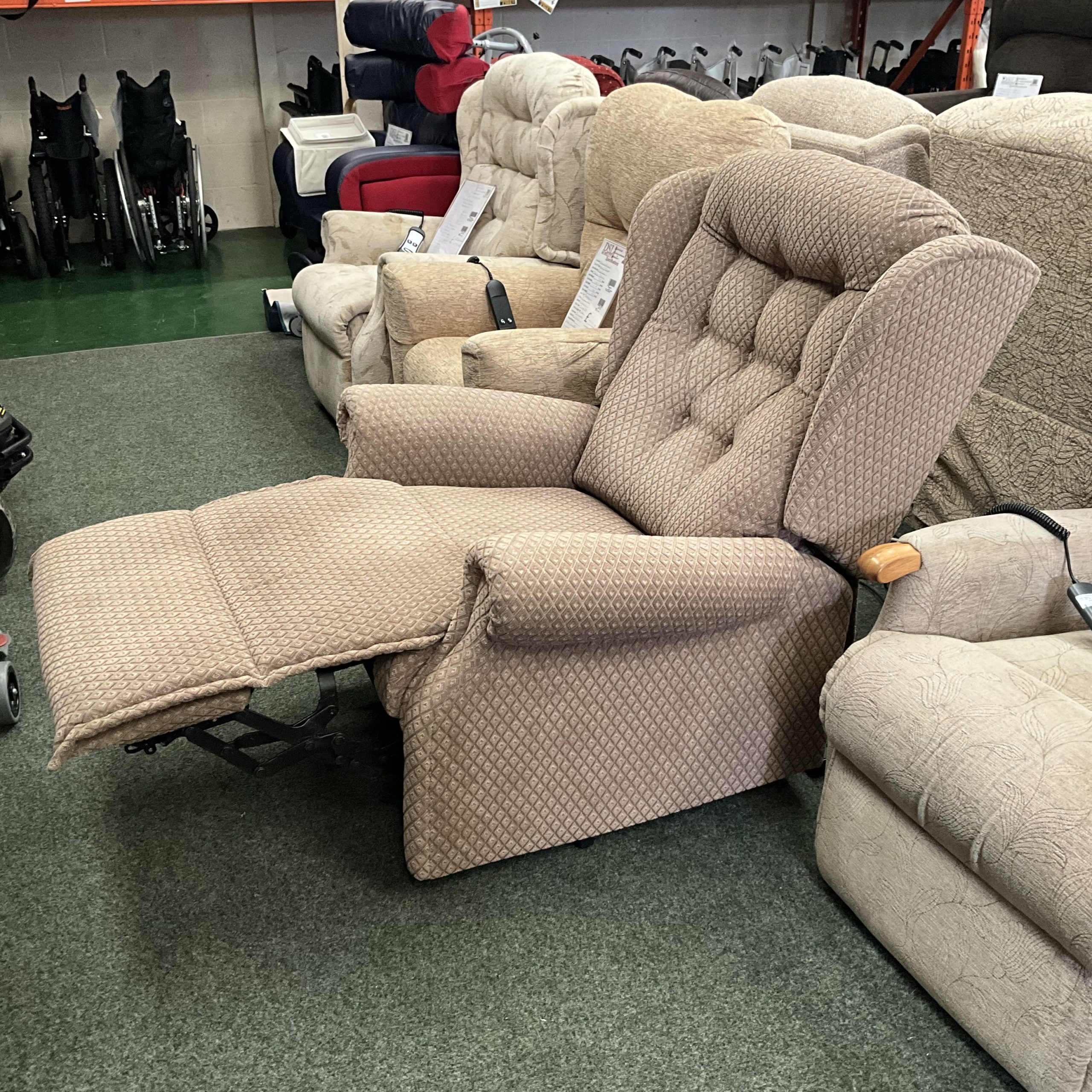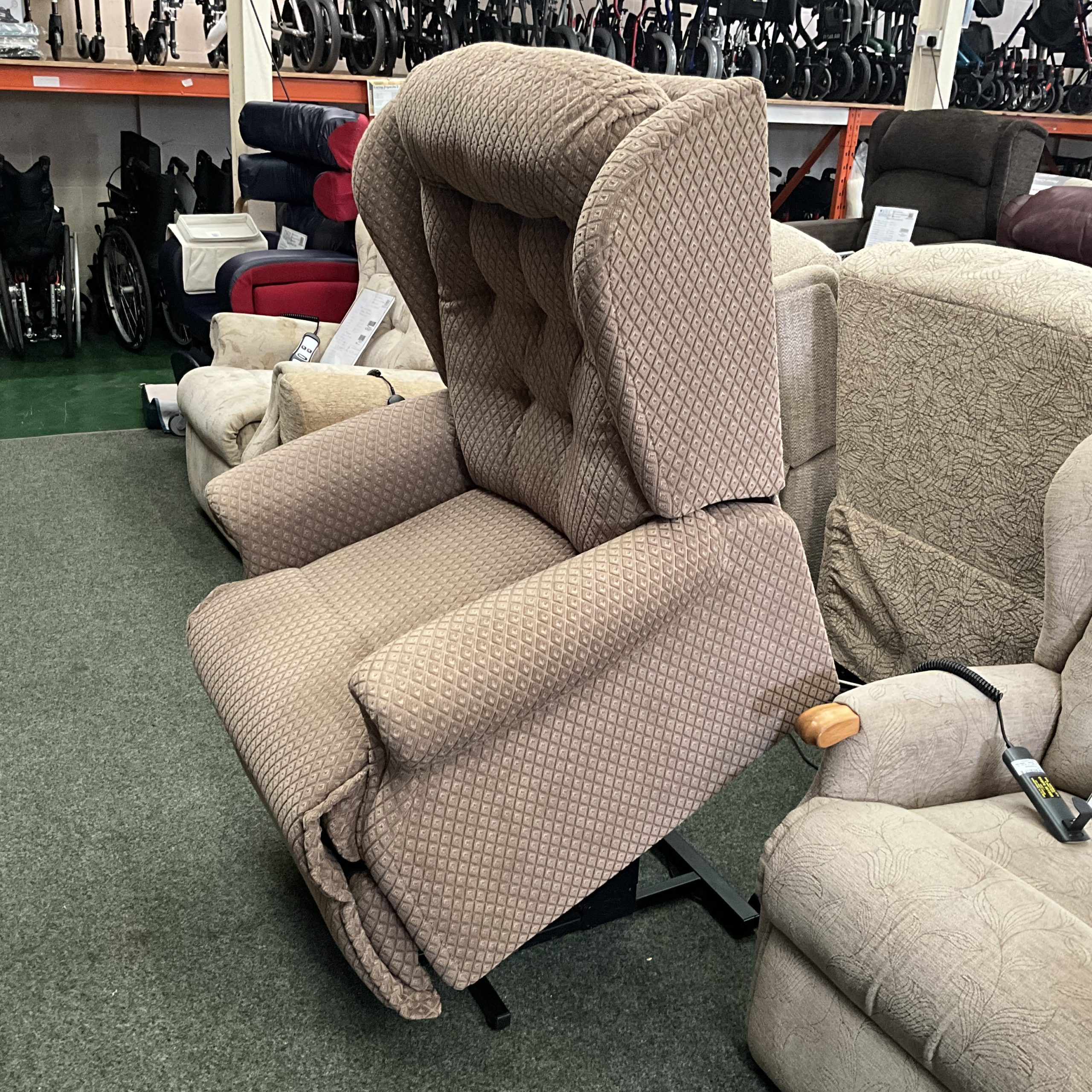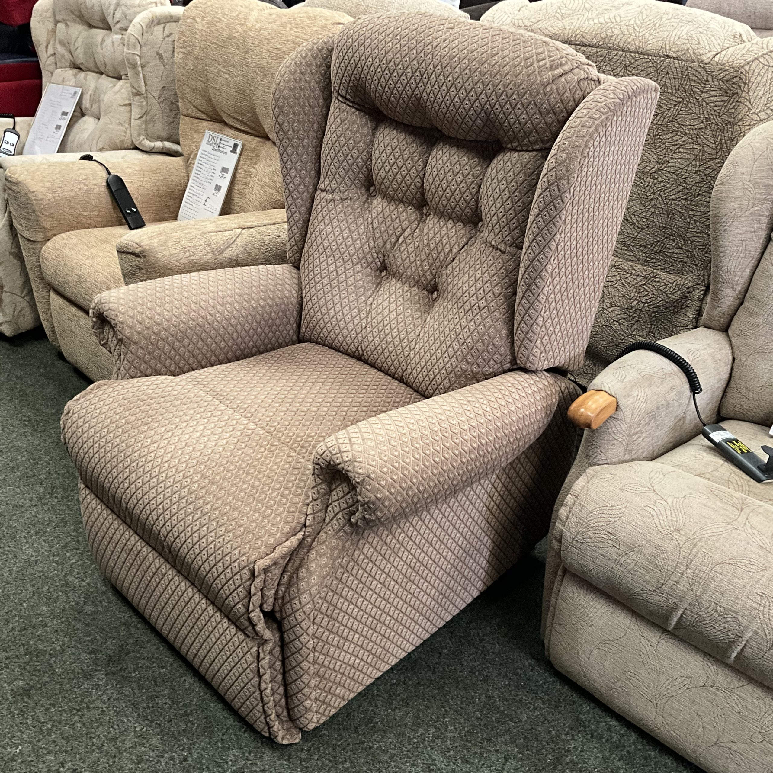 This Sherborne is a reconditioned rise and recliner, it is fitted with a single wall hugging motor allowing both the feet and back of the chair to be adjusted together, in a synchronised motion, making the chair simpler to use, without risking damaging of the wall. It features a button back and is finished in a diamond latte fabric.