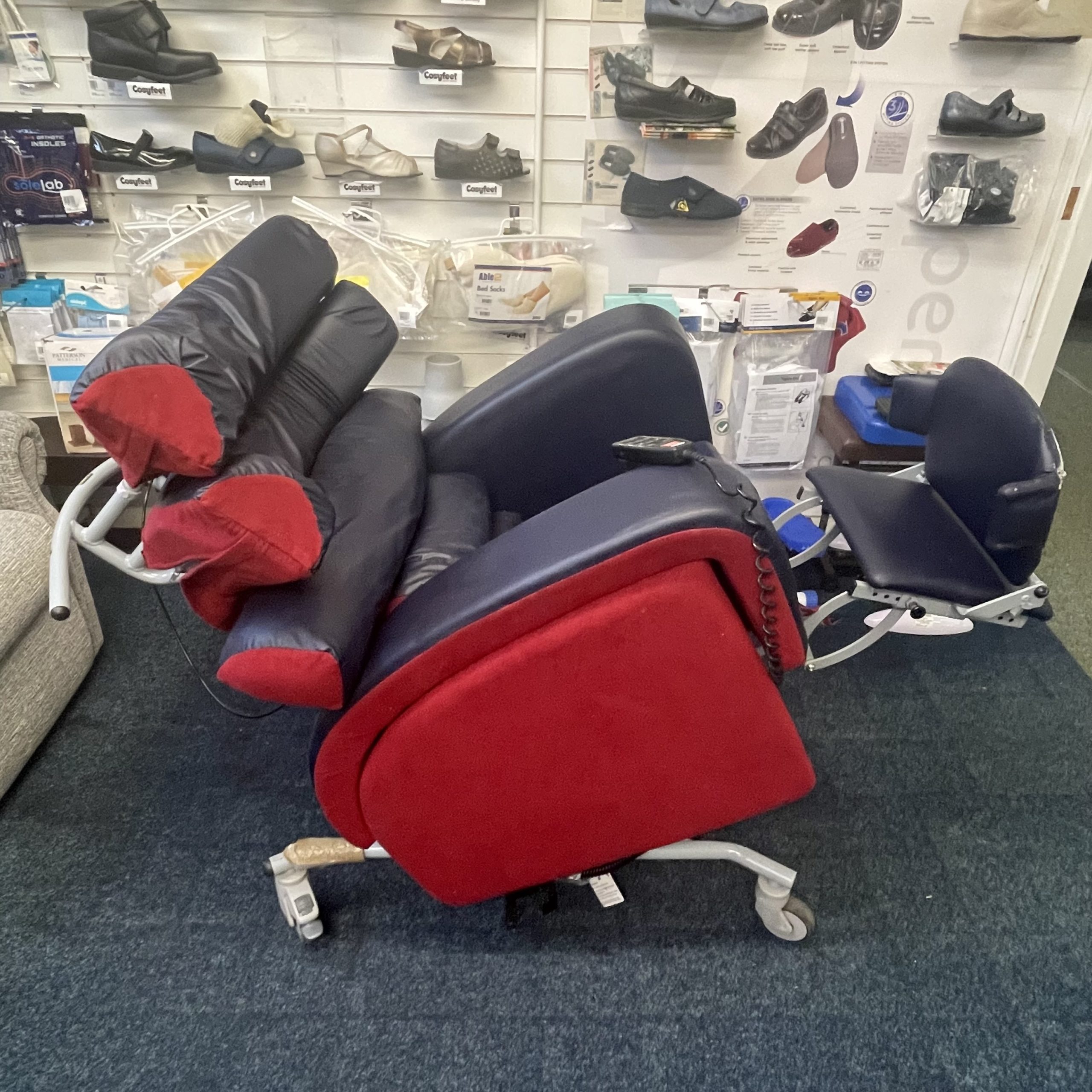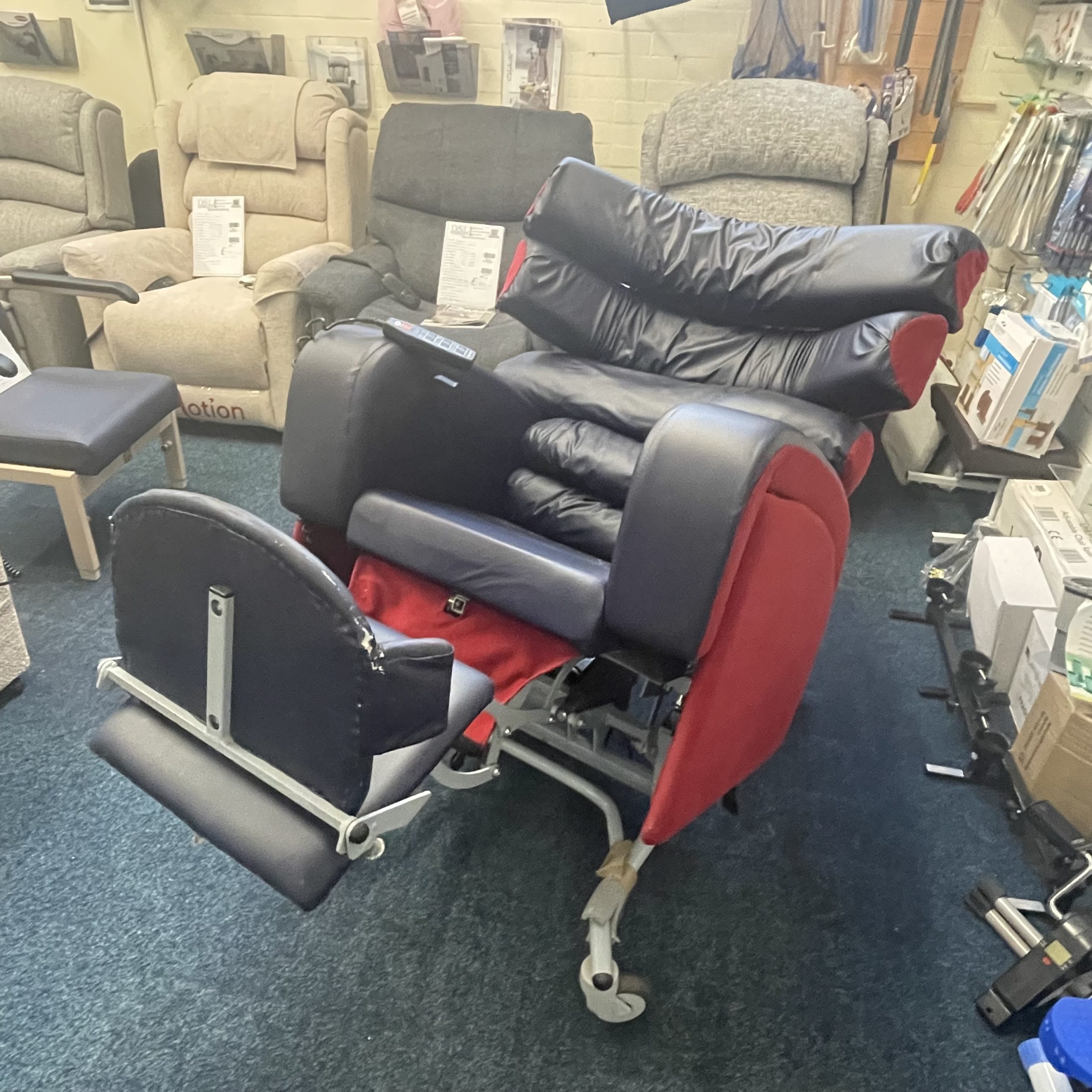 This particular chair has been fully cleaned, serviced and tested by our Workshop Team, ensuring that it is in its best possible condition. It features some slight cosmetic damage, including damage to the footrest and lateral fabric. This chair is guaranteed for 3 months from date of purchase.
