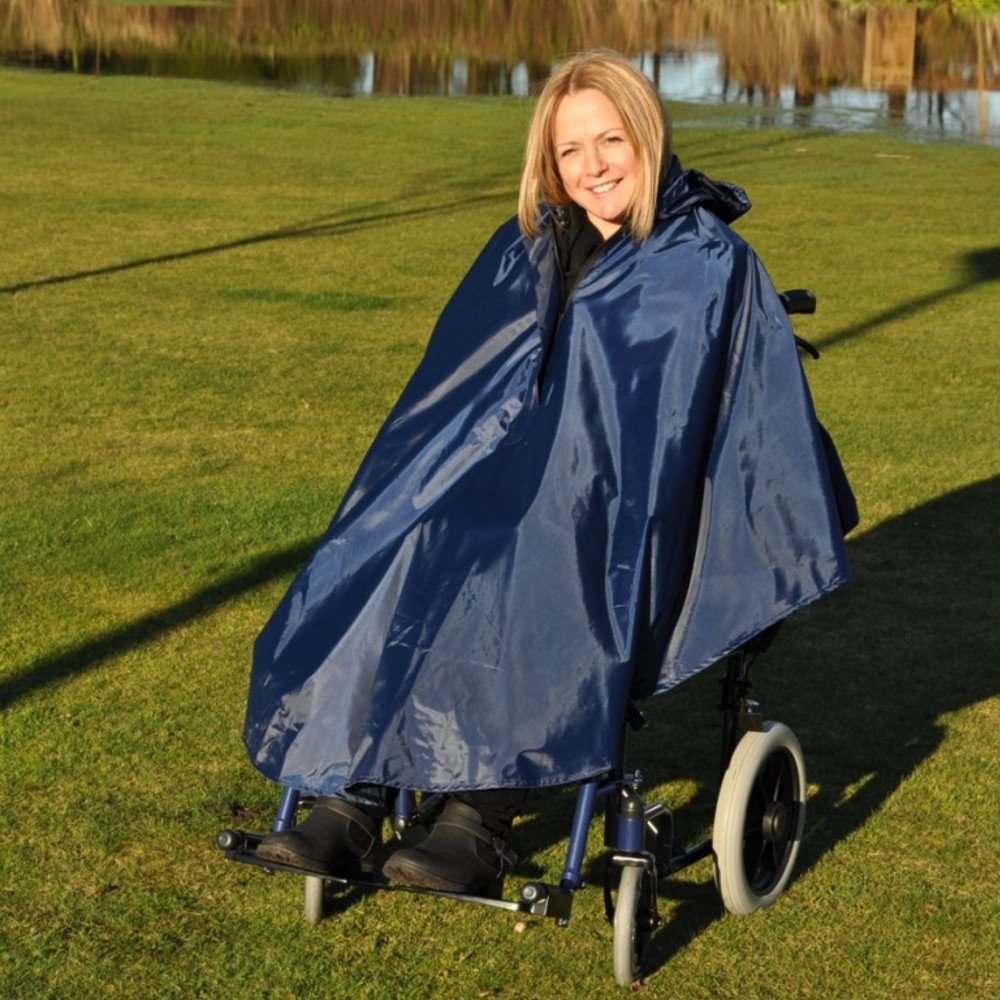 The Splash Wheelchair Poncho simply slips over your head and provides quick and practical protection from showers and wind. The poncho is fully waterproof and has slots at the rear of the garment for pushing handles. Convenient pop-fastened ties at the bottom of the cape allow you to fix it to struts and prevent the poncho from billowing out.