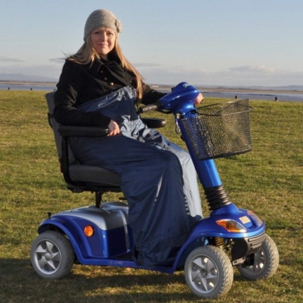 The Splash scooter leg cape is a practical cover that drapes over your lap and legs to keep you warm and comfortable. It is waterproof and windproof with an inner navy fur lining that cuts out drafts. It is quick and easy to put on.