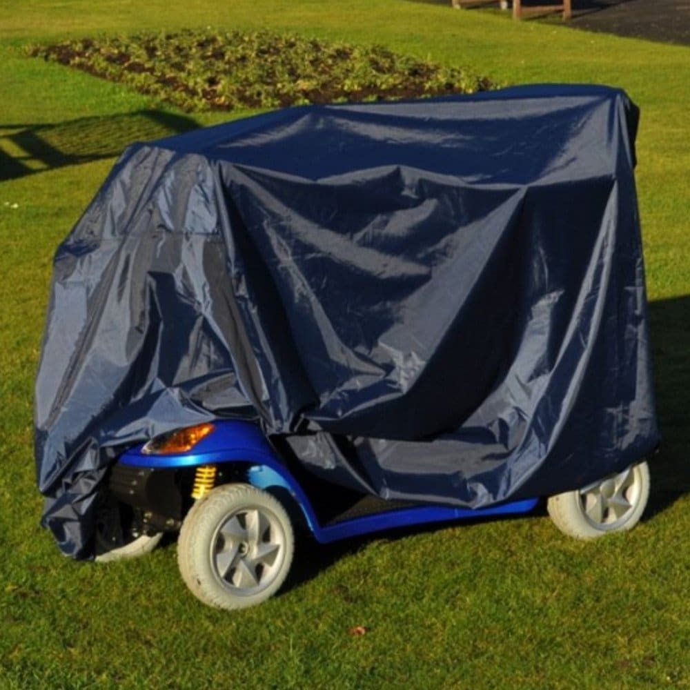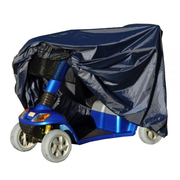 The Splash scooter storage cover is a lightweight cover that slips over your scooter when protection is needed. The waterproof, navy fabric has sealed seams to eliminate water penetration and fits most three and four wheeled scooters. The cover folds up after use to fit a storage bag or pouch.
