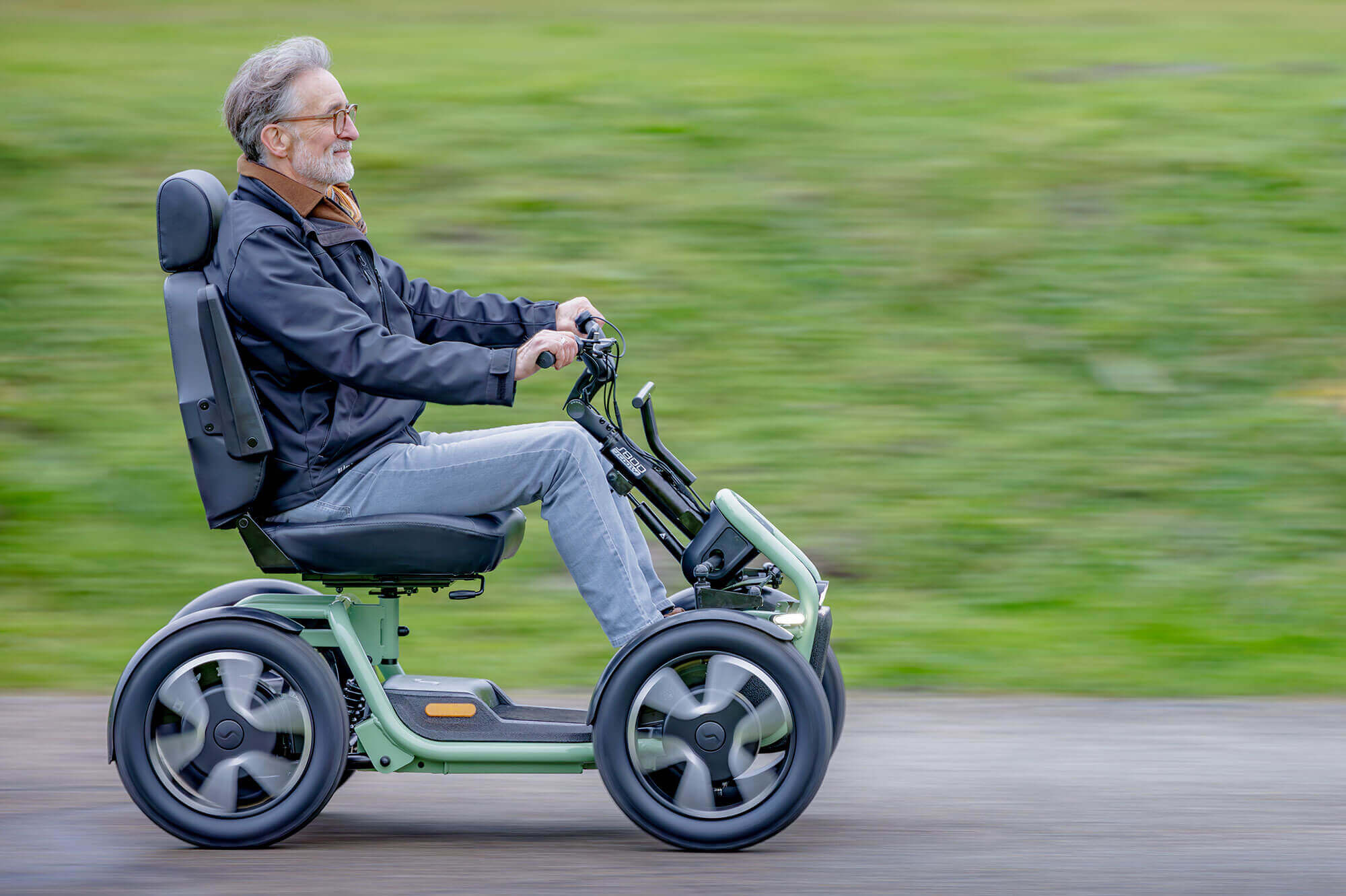 The STERLING S800 by Scoozy effortlessly transitions you from biking to a mobility scooter, with fimilair bike-style handlebar controls, 4 large wheels, advanced suspension, and a lithium battery. Engineered for stability and comfort on both urban streets and nature trails, the S800 delivers a modern and cool mobility solution.