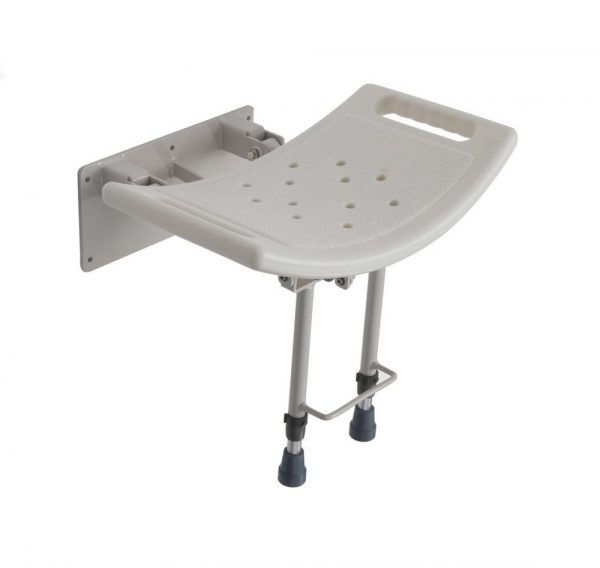 The Wall Mounted Shower Seat attaches to the wall to give support when showering then folds up to allow space for others to use shower, with two fold out height adjustable legs for added security when used by heavier users or when wall is not strong enough.