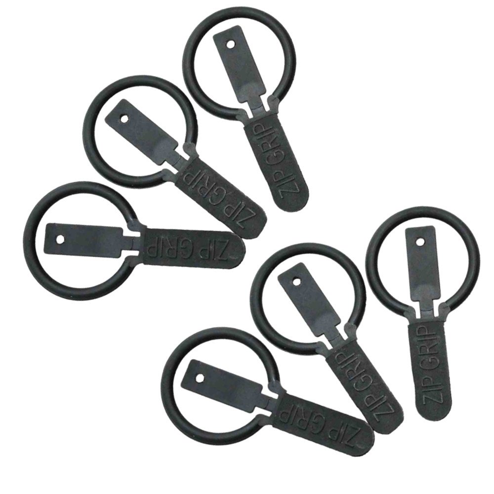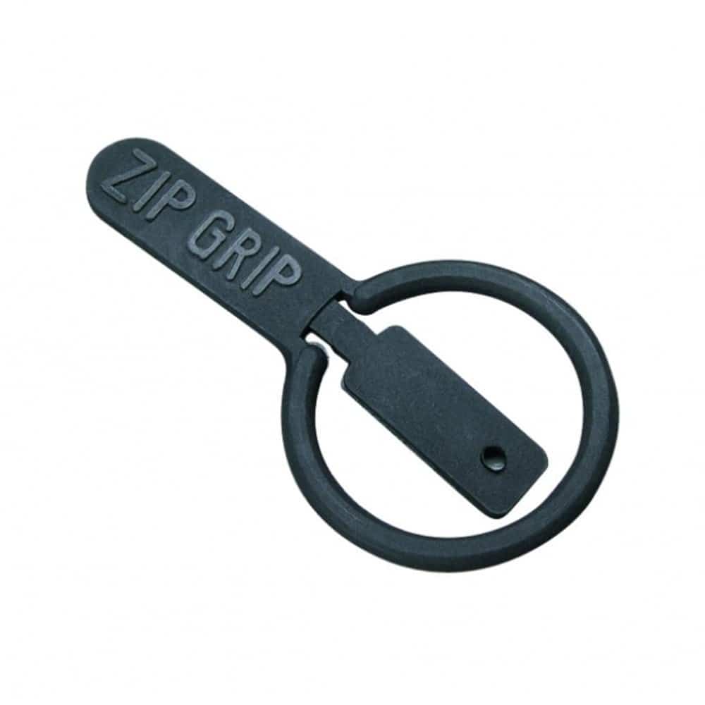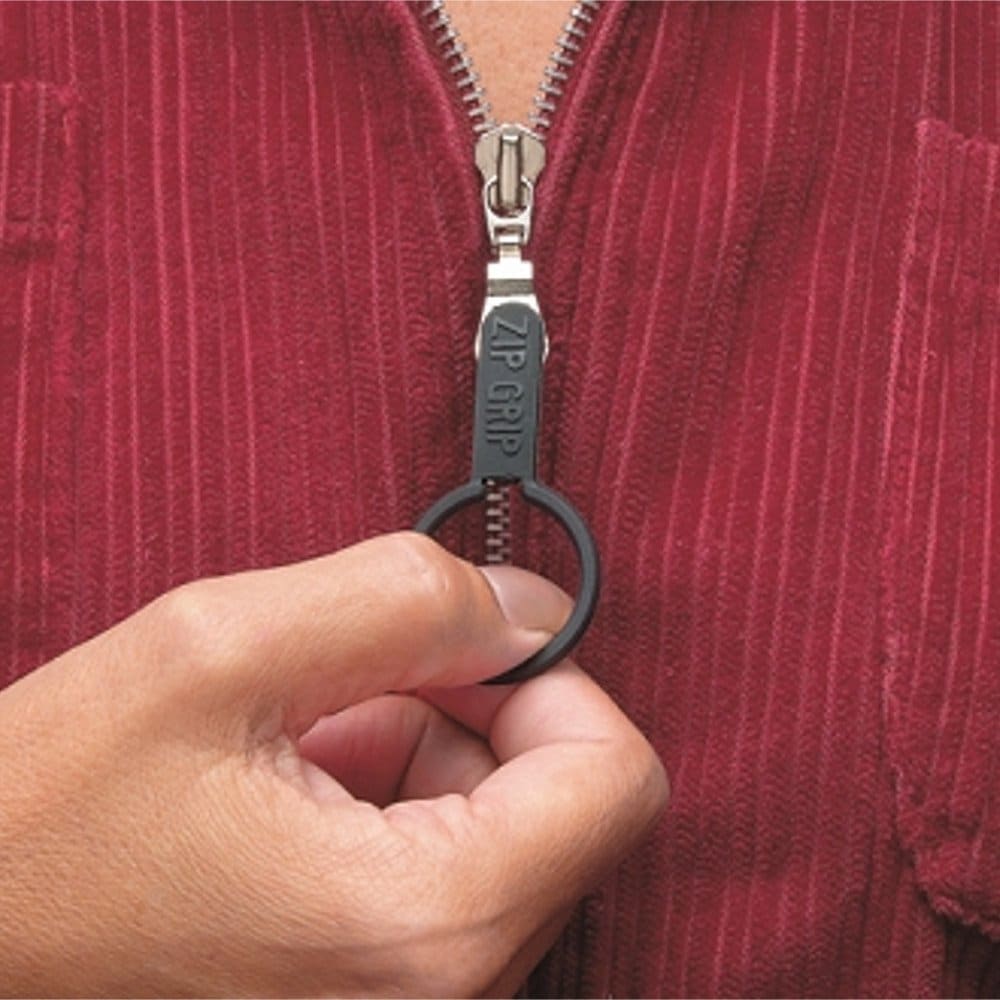 The Zip Grip is ideal for persons who have difficulty grasping and pulling small zipper tabs. Just insert the peg of the Zip Grip through the hole in a standard zipper, fold in half and press to snap shut.