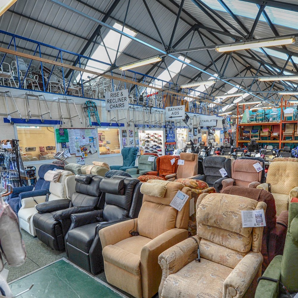 Our showroom in Wrexham offers 6000sq ft with demonstration rooms for stairlifts, bathing and rise and recline chairs. We have dozens of scooters, powerchairs, wheelchairs and  rise & recline chairs in stock for you to view and try as well as demo models of adjustable beds, bathlifts and even stairlifts.